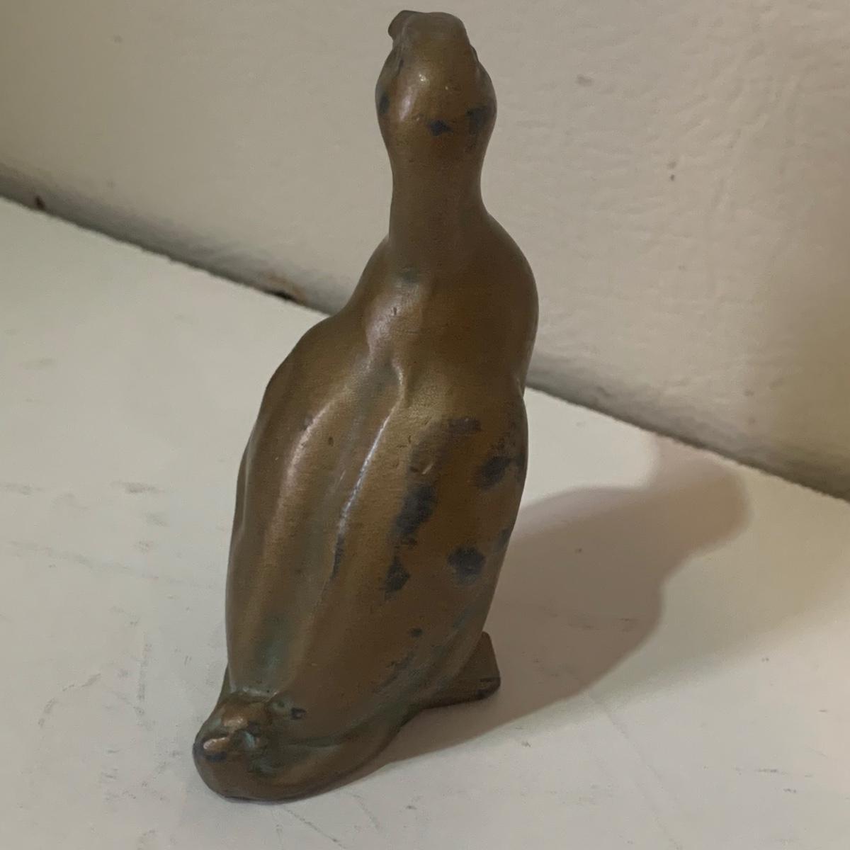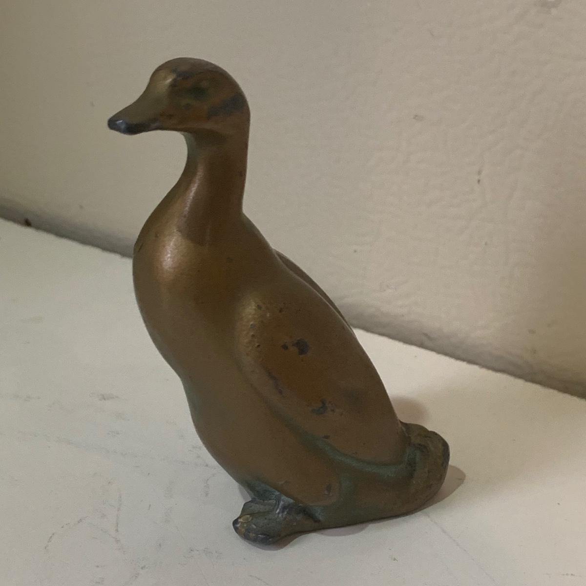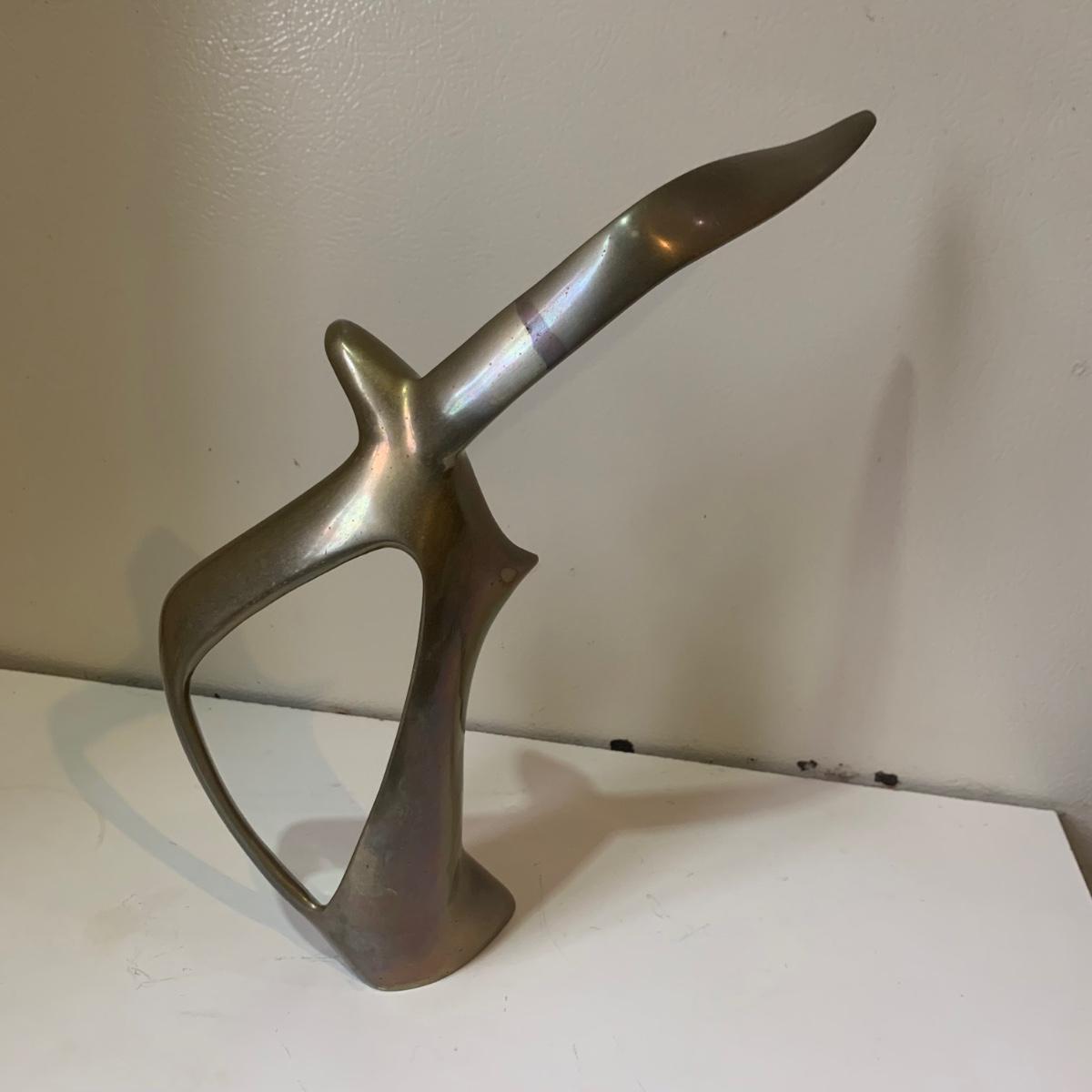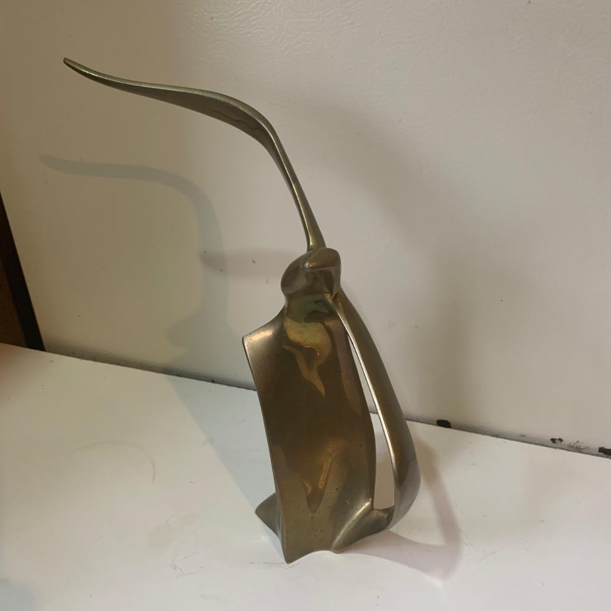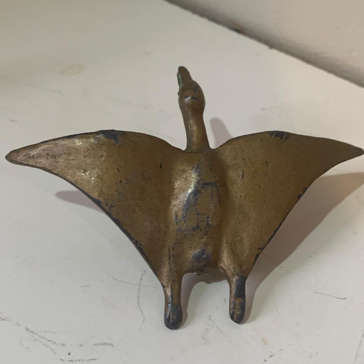 A solid brass mide century modern style brass seagull measures approximately 9” x 3” x 10.5”H. It has a couple blemishes, see photos. Also included are two small figurines, one a duck and one a pelican. They are brass colored but do not appear to actually be brass. The fourth item is a brass duck head that is a fireplace damper hook pull.