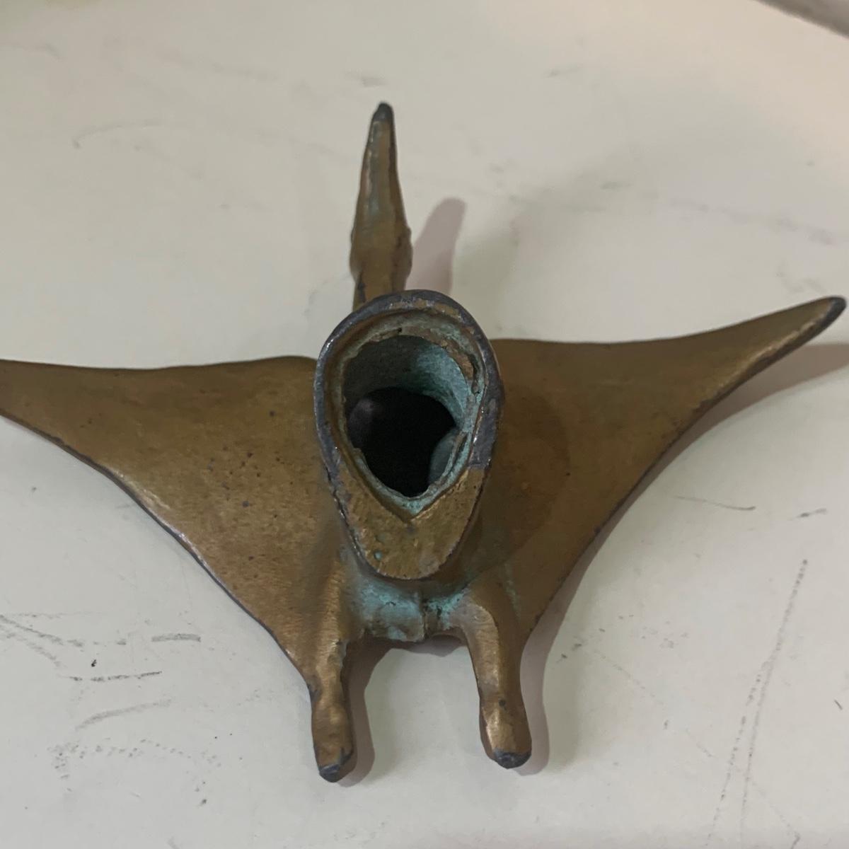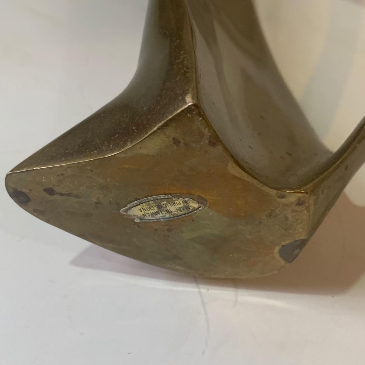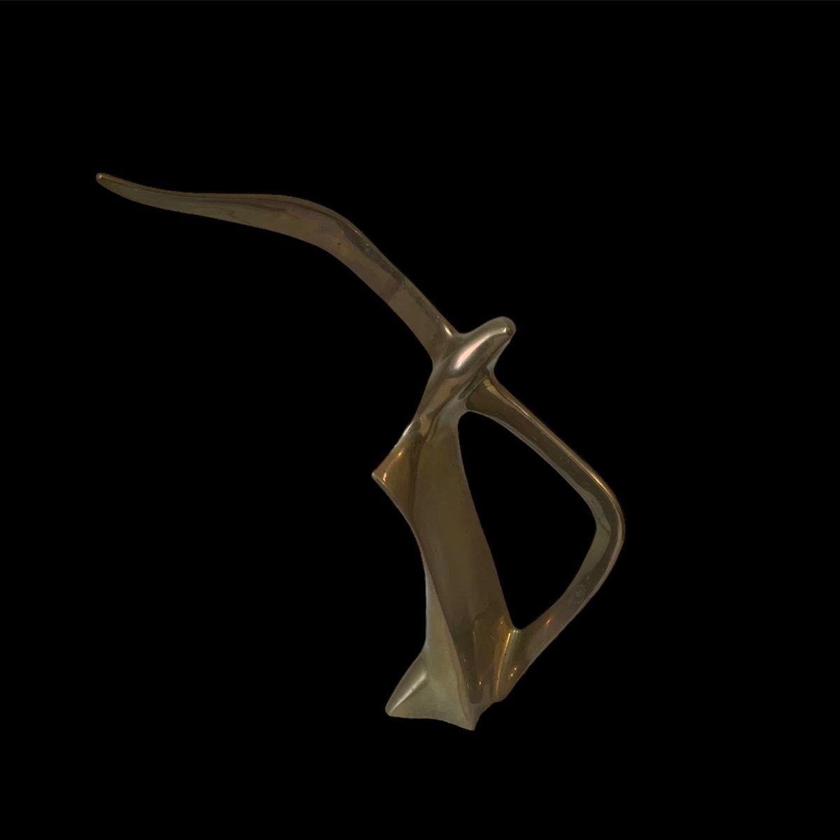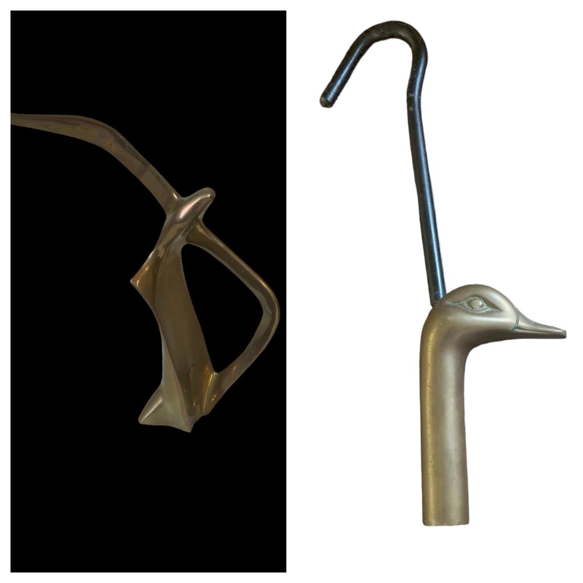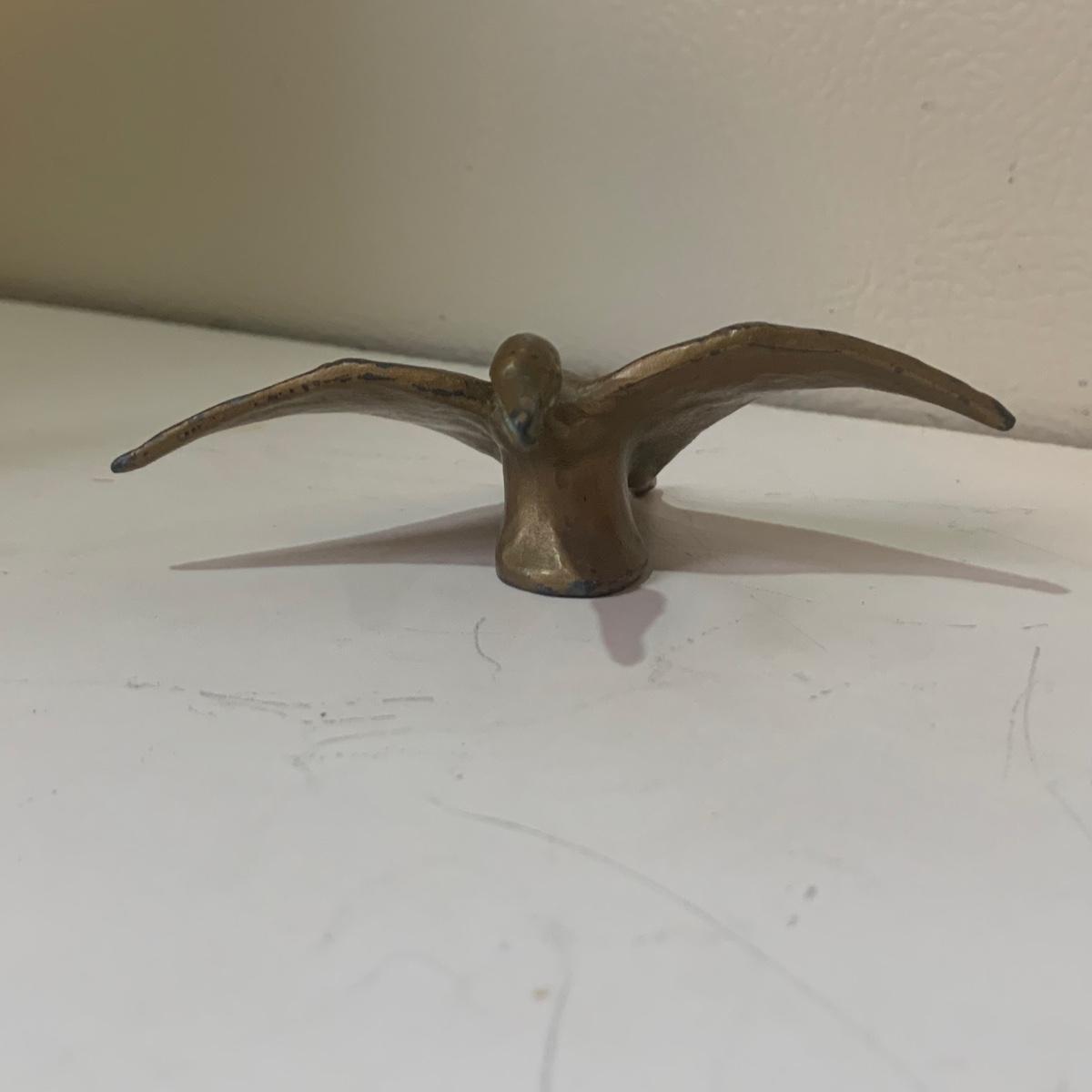 A solid brass mide century modern style brass seagull measures approximately 9” x 3” x 10.5”H. It has a couple blemishes, see photos. Also included are two small figurines, one a duck and one a pelican. They are brass colored but do not appear to actually be brass. The fourth item is a brass duck head that is a fireplace damper hook pull.