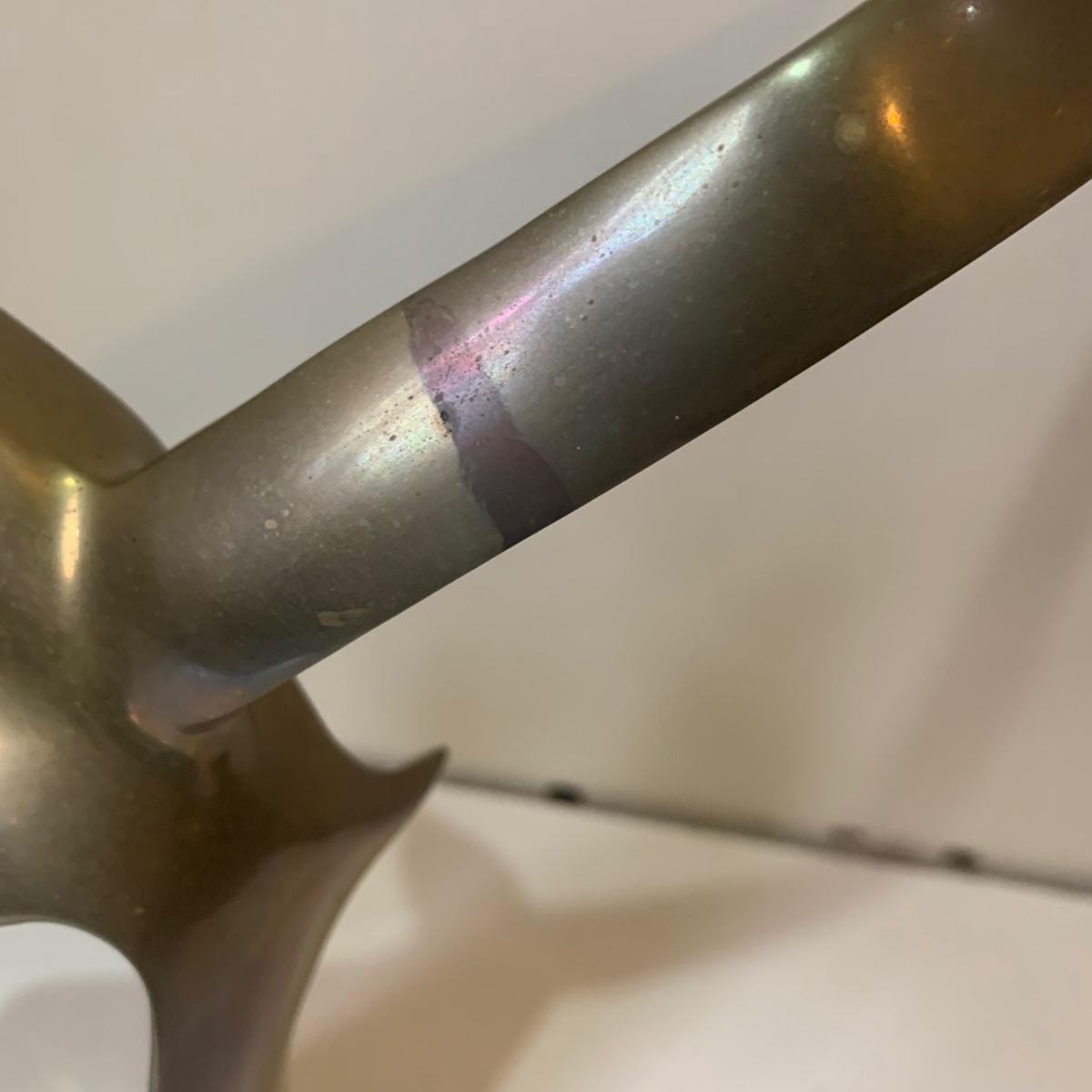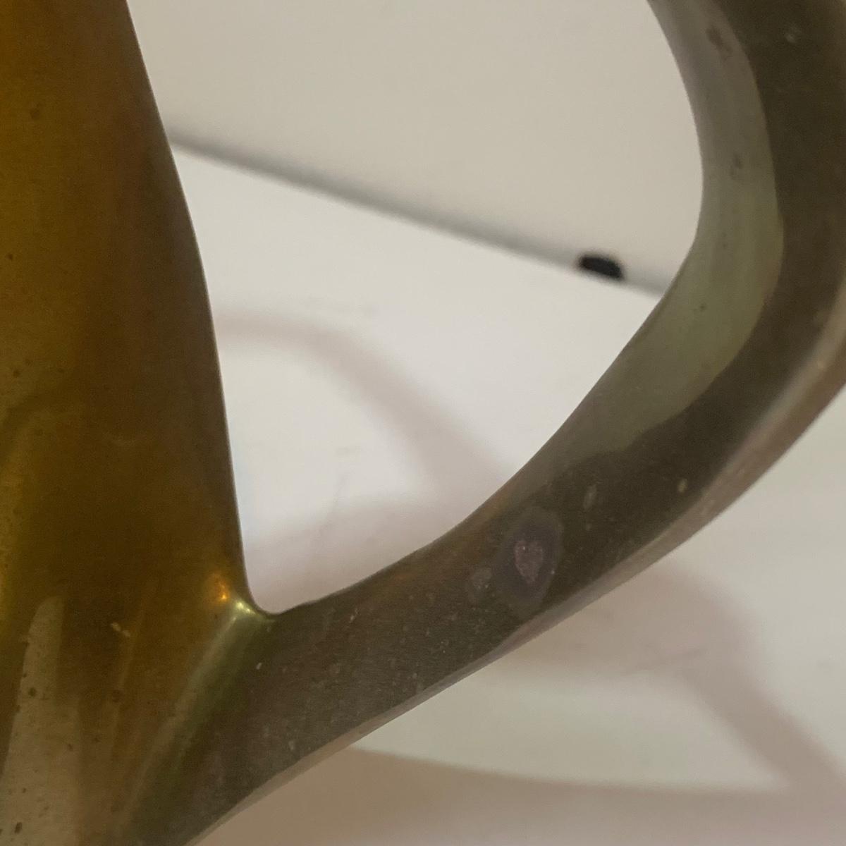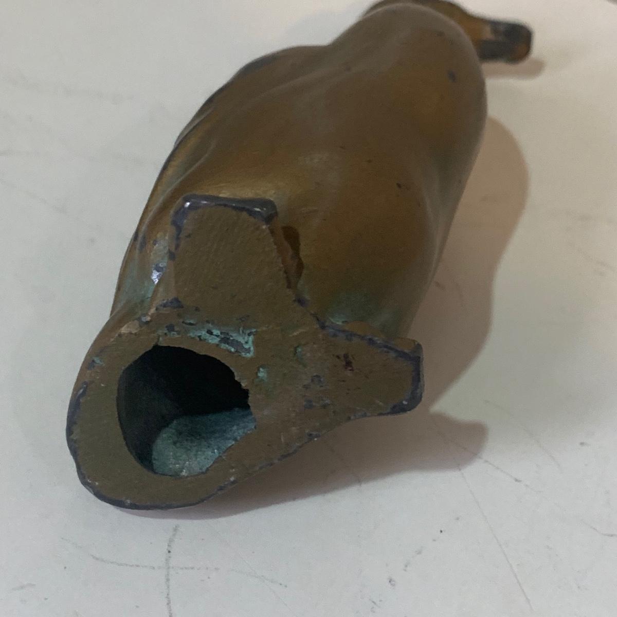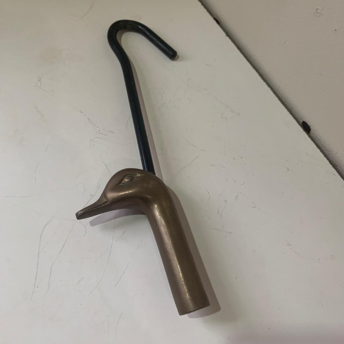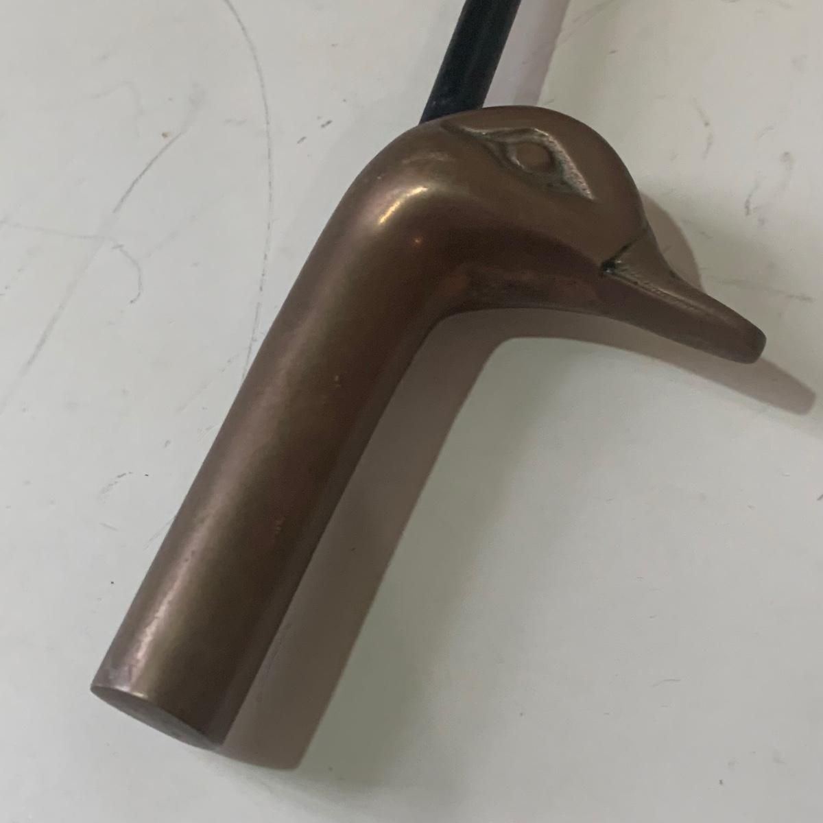 A solid brass mide century modern style brass seagull measures approximately 9” x 3” x 10.5”H. It has a couple blemishes, see photos. Also included are two small figurines, one a duck and one a pelican. They are brass colored but do not appear to actually be brass. The fourth item is a brass duck head that is a fireplace damper hook pull.