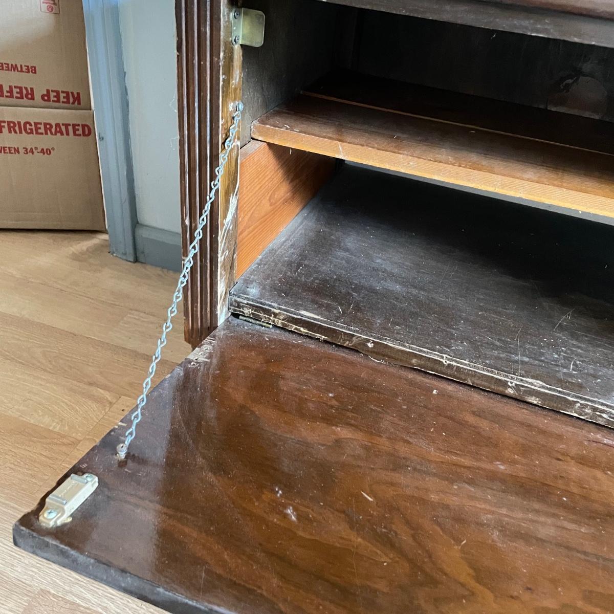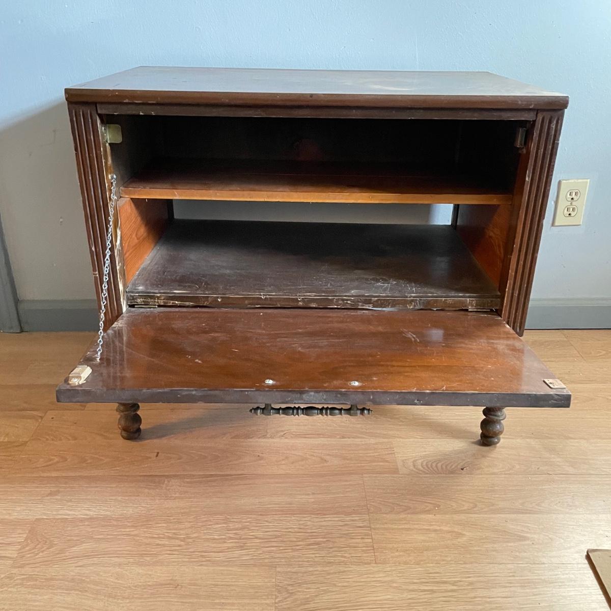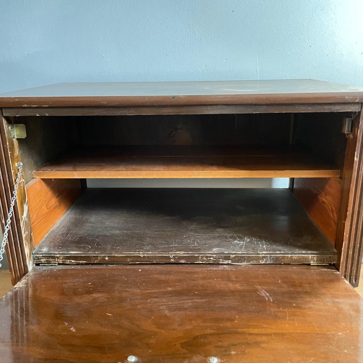 Small, vintage breakfront hutch would make a nice entertainment table with room in the back for cords. Piece has one long metal pull with a chain and magnet to operate breakfront. An aftermarket shelf has been added, the shelf can easily be removed, but the wood holding up the shelf appears to be attached by adhesive. Piece measures 29.5” x 18.25” x 25.5” and has a variety of mostly superficial blemishes. A good polish would do wonders, also a refinished body would make this a conversation starter! See images. Local pick up only.