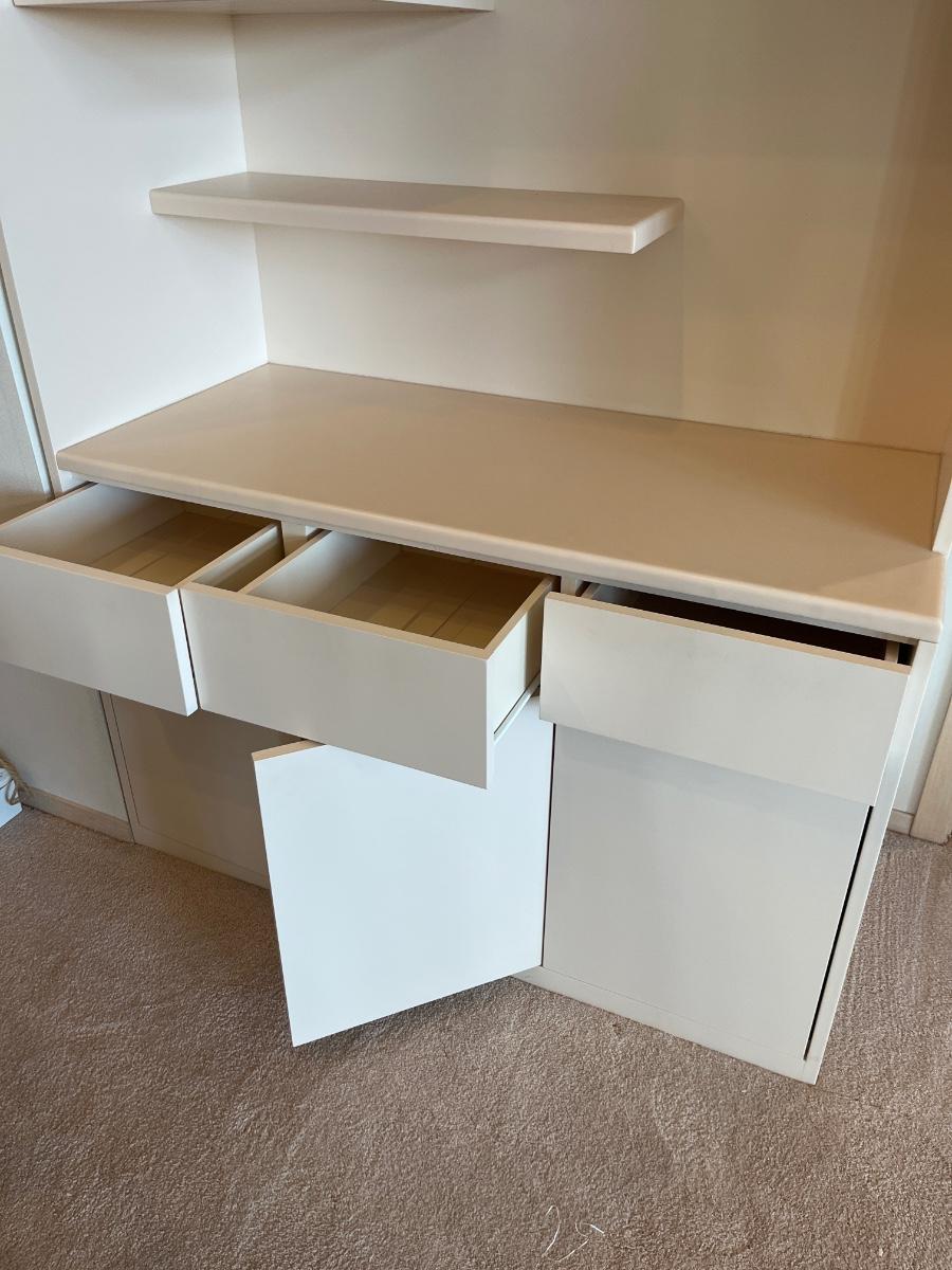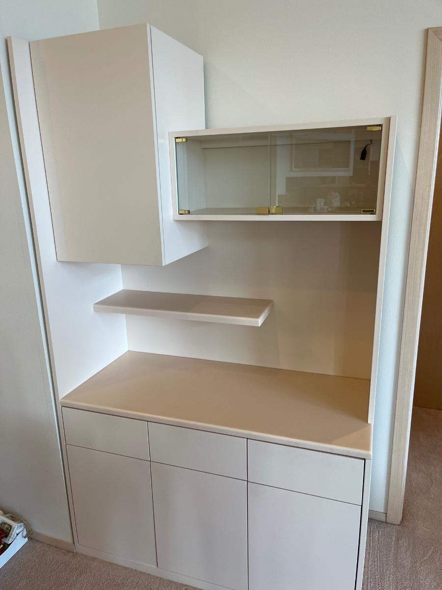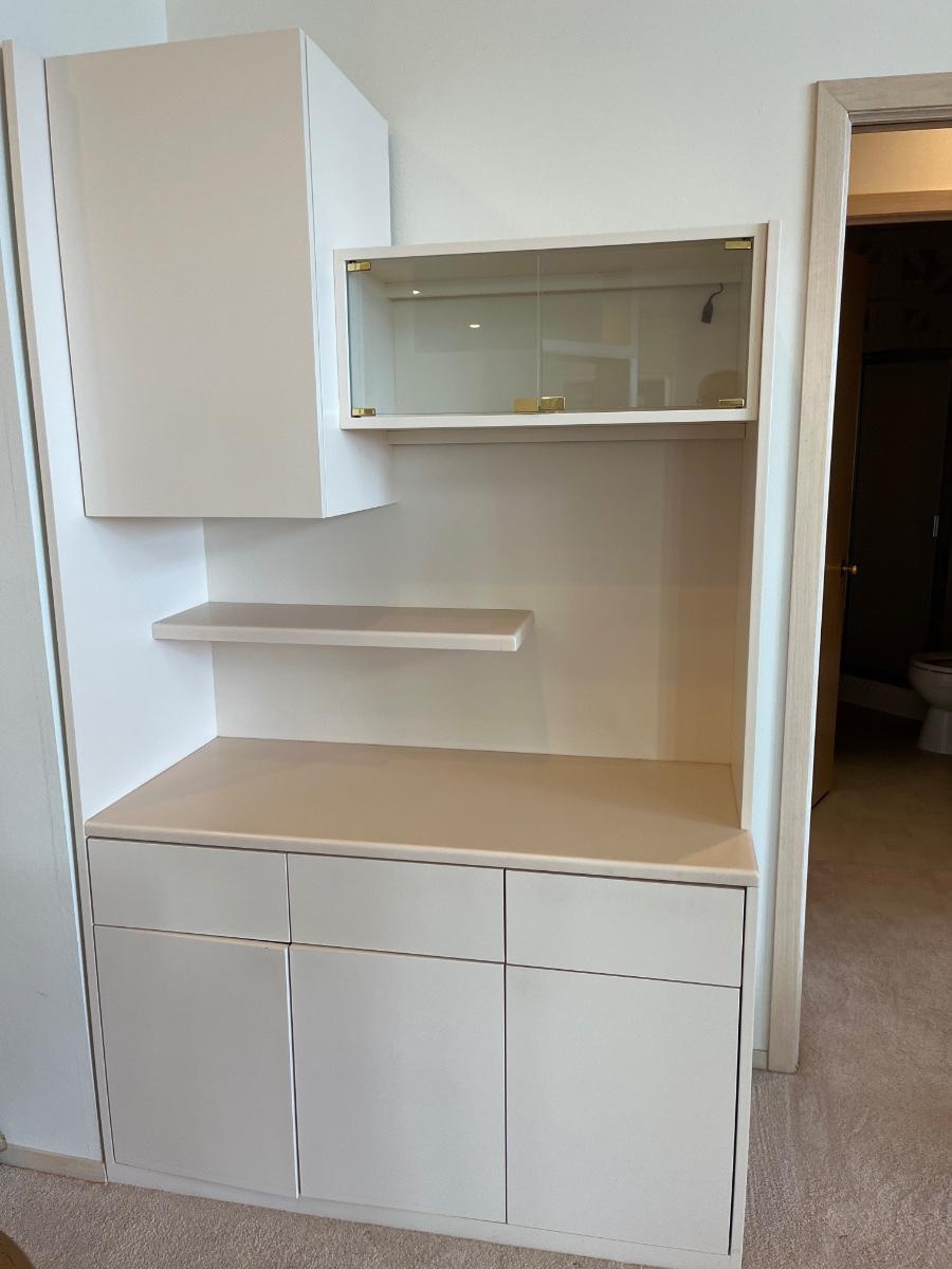 Custom-made. Doors/drawers are spring-loaded. 4’w x 22”d x 82”h