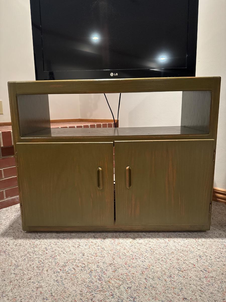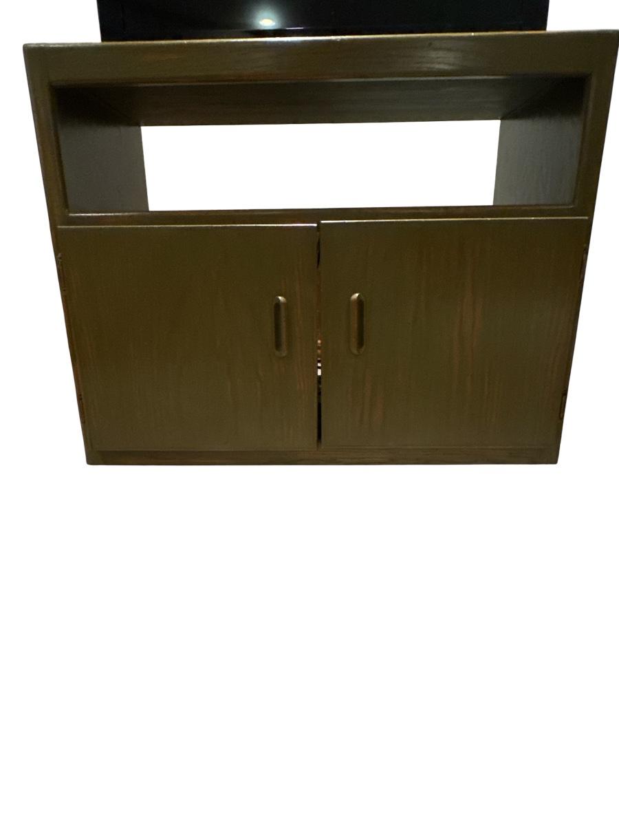 This is a retro-style wooden cabinet with a minimalist, mid-century modern design. It features a rectangular frame with clean lines, a large open shelf above, and a pair of cabinet doors below. The cabinet doors have integrated vertical pulls carved into the wood, maintaining the sleek aesthetic. The finish is a warm, glossy brown that highlights the wood grain. Ideal for use as a media console, entryway piece, or compact storage unit.