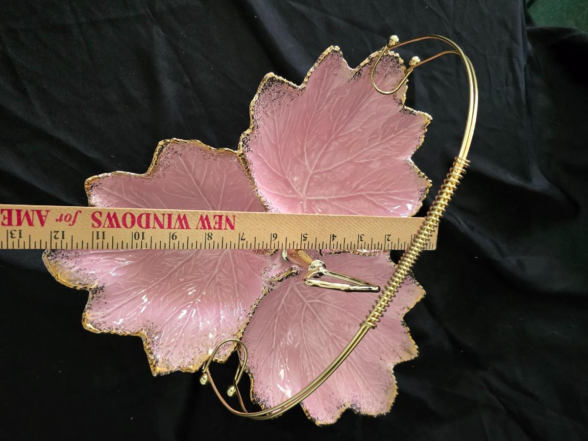 The dish is divided into three leaf-shaped sections, often with impressed vein detailing. Originally intended as a serving dish for nuts, candies, or relishes, some listings also describe them as ashtrays.