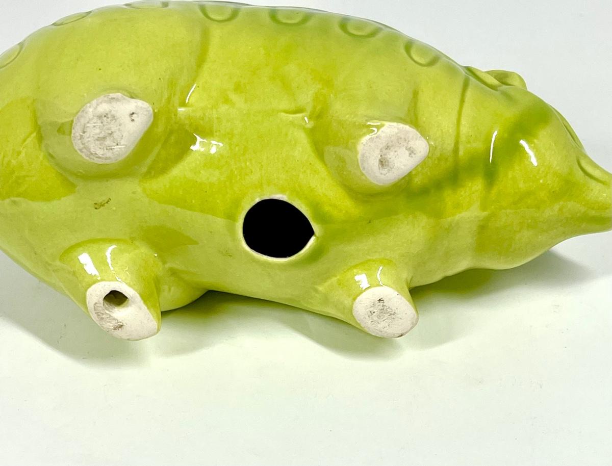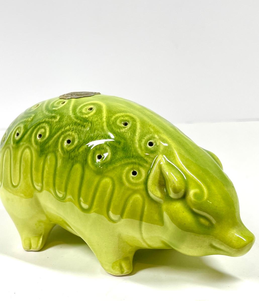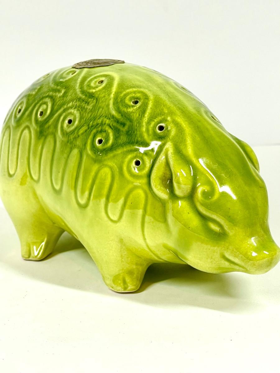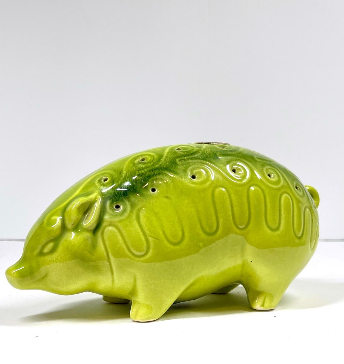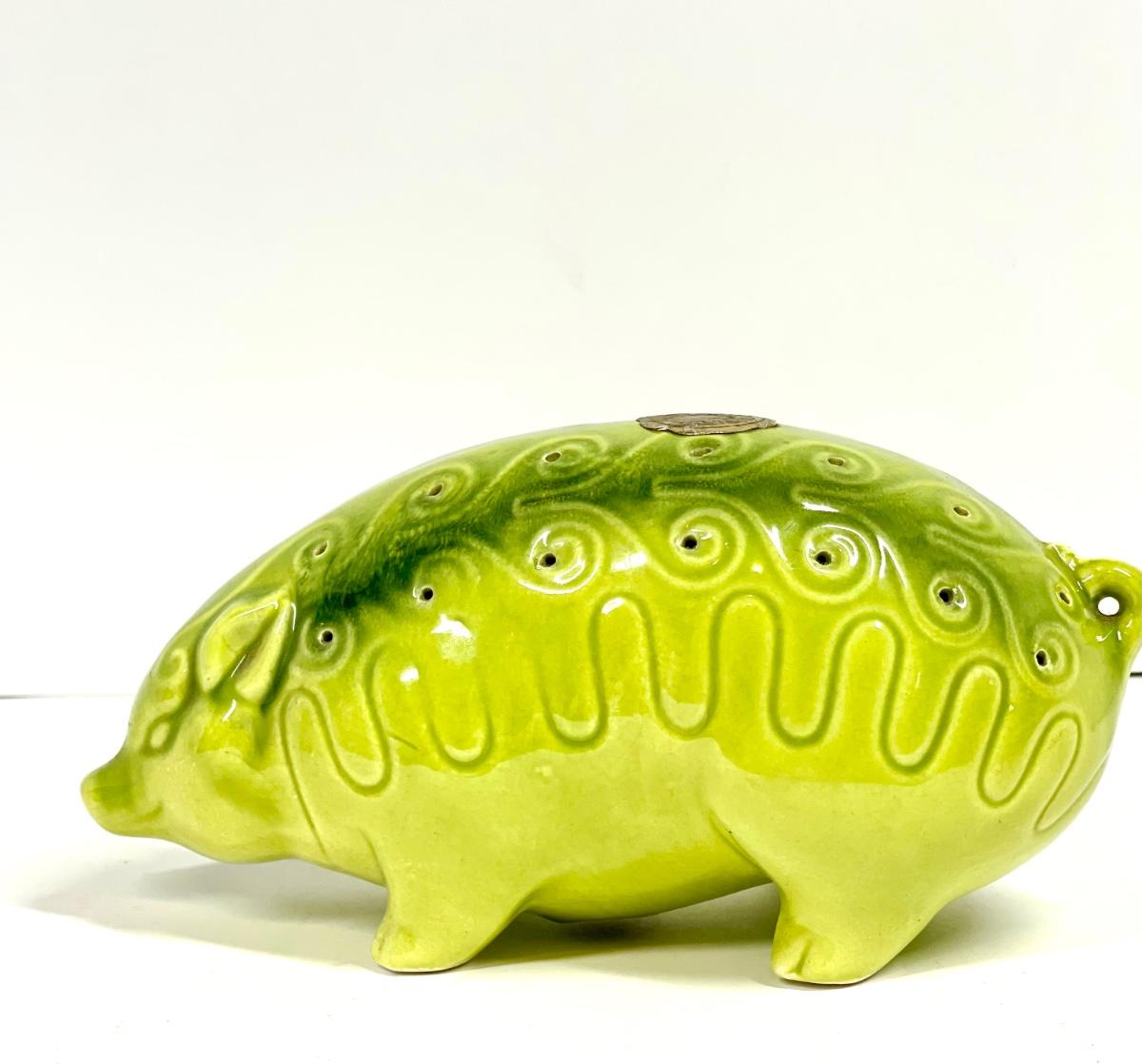 What a cute pig- but it’s more than just a pig- it’s a mid century hors d’oeuvres toothpick holder. What a cute piece to have in a vintage kitchen. Fill this pig up with little hors d’oeuvres and put it beside your charcuterie board. What a great match up!! Sierra Bevan Kilns- Calif. Pottery see sticker.