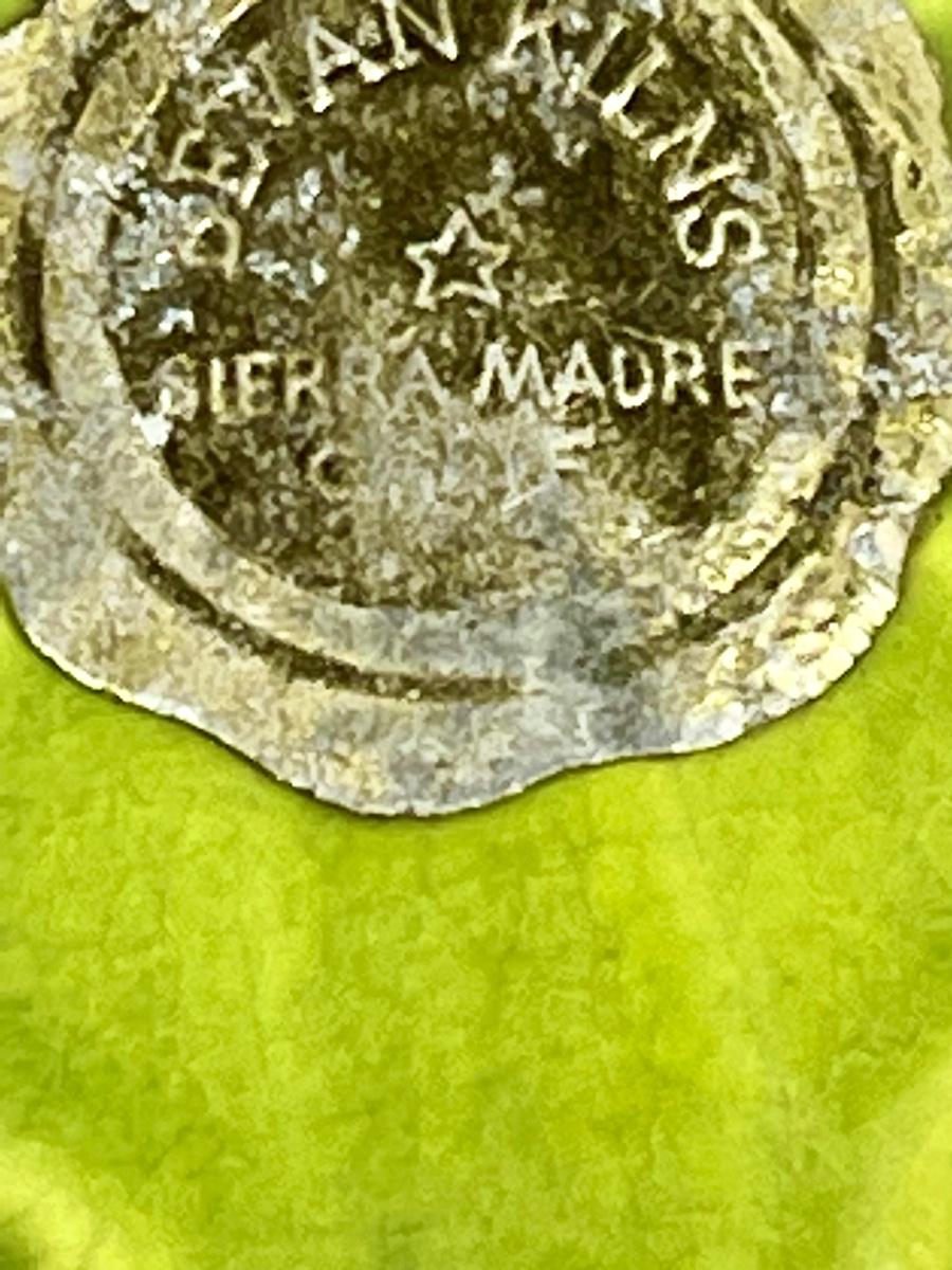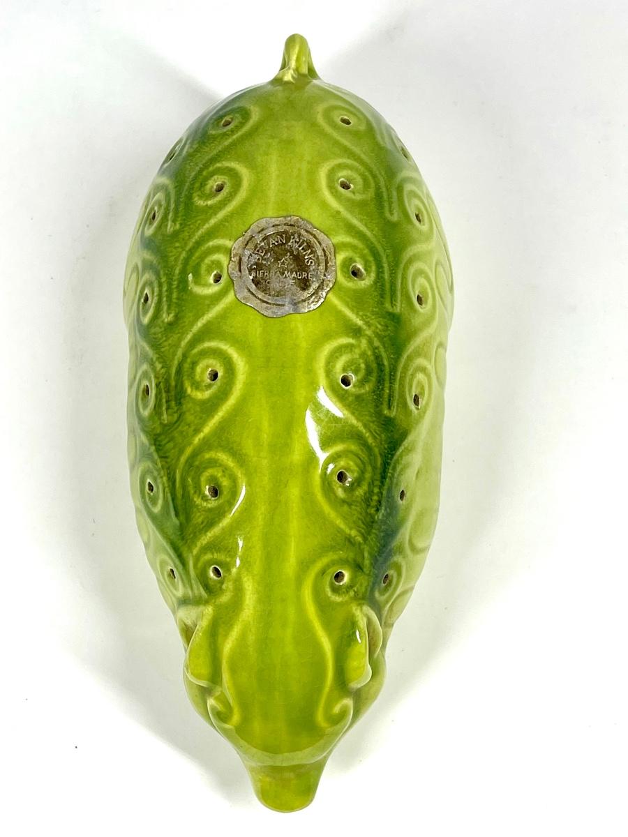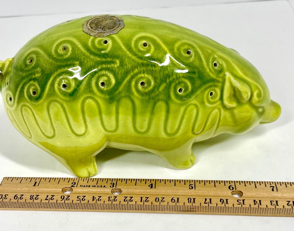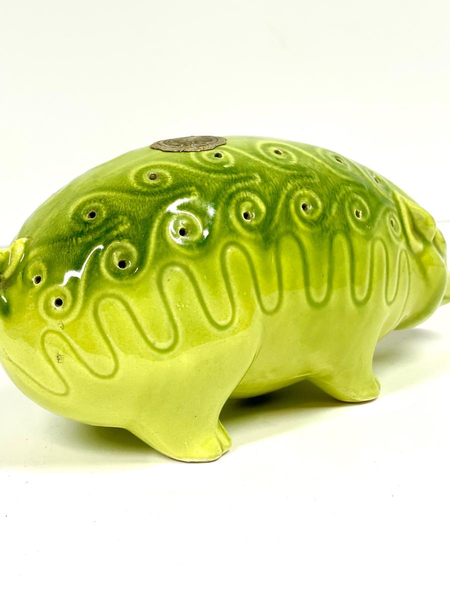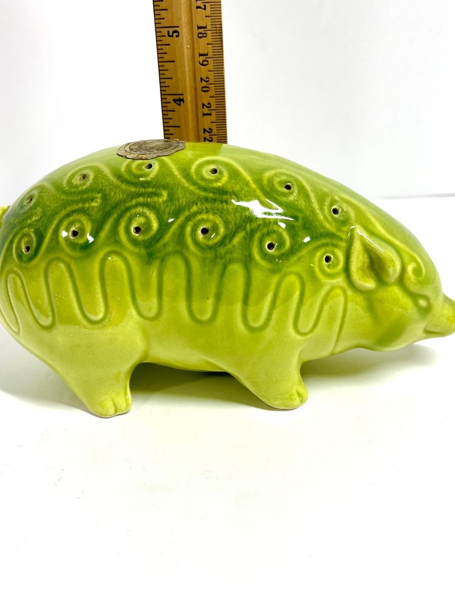 What a cute pig- but it’s more than just a pig- it’s a mid century hors d’oeuvres toothpick holder. What a cute piece to have in a vintage kitchen. Fill this pig up with little hors d’oeuvres and put it beside your charcuterie board. What a great match up!! Sierra Bevan Kilns- Calif. Pottery see sticker.