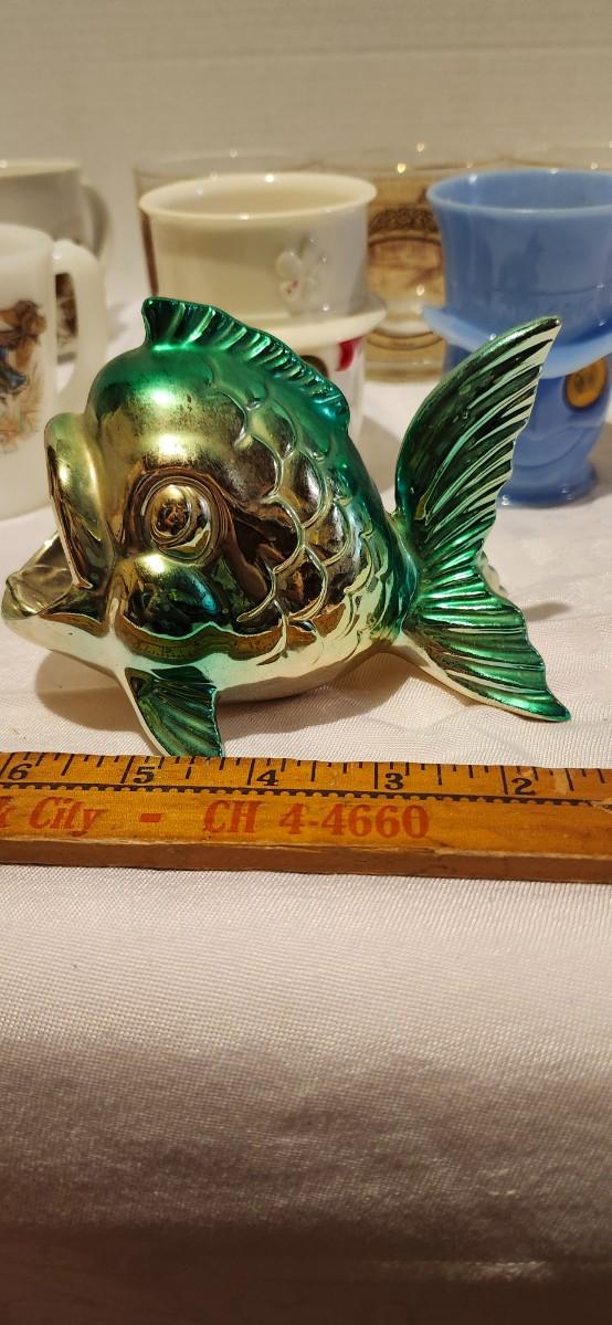 1960s Ceramic Fish. Vintage Big Mouth Airbrushed Green Gold Lustre Glaze Pottery. MCM Decorative Kitsch Collectible Japanese Figurine