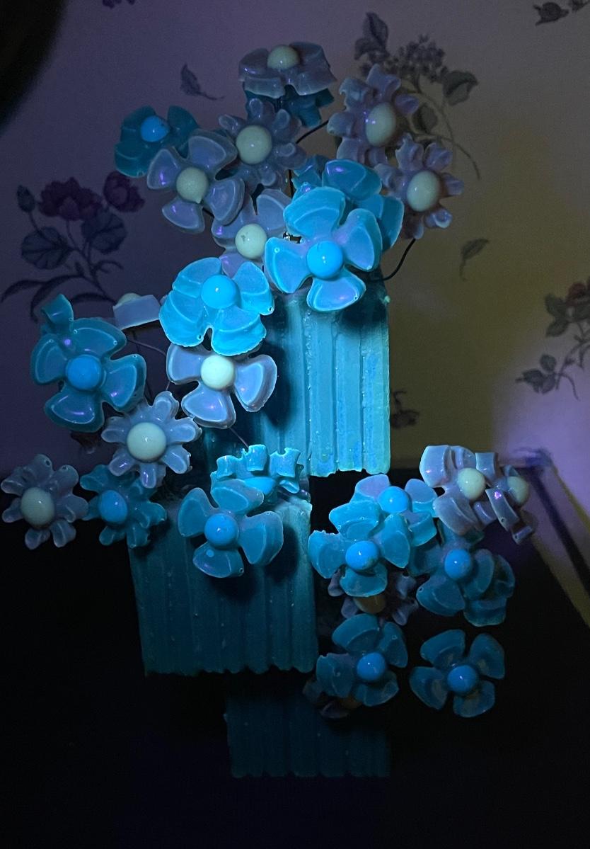 This is pretty cool! Please look up this brand. It’s a pretty sought after MCM Decor item. Grab this for yourself or a friend! it is very dusty and will need to be cleaned by the buyer. It glows under UV.