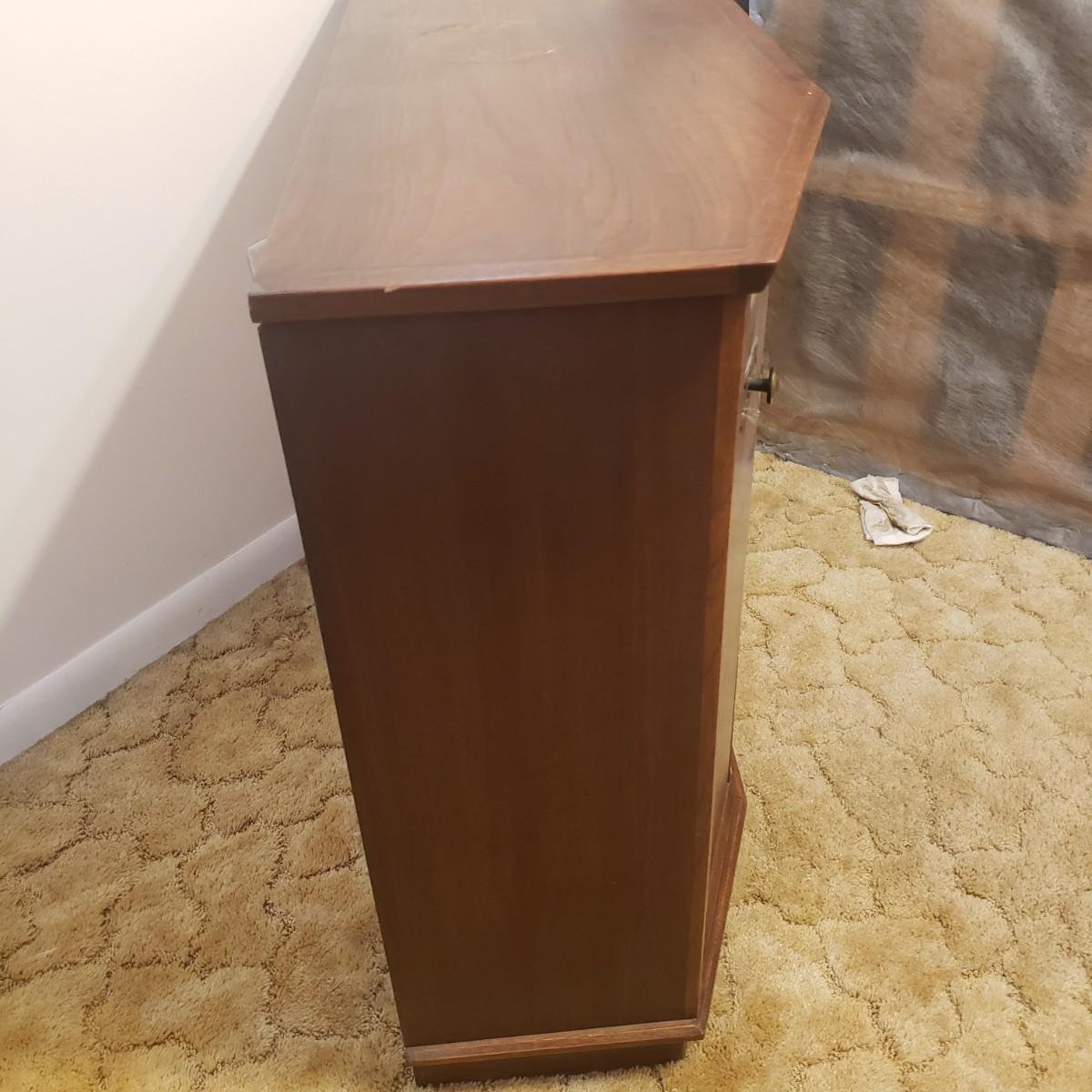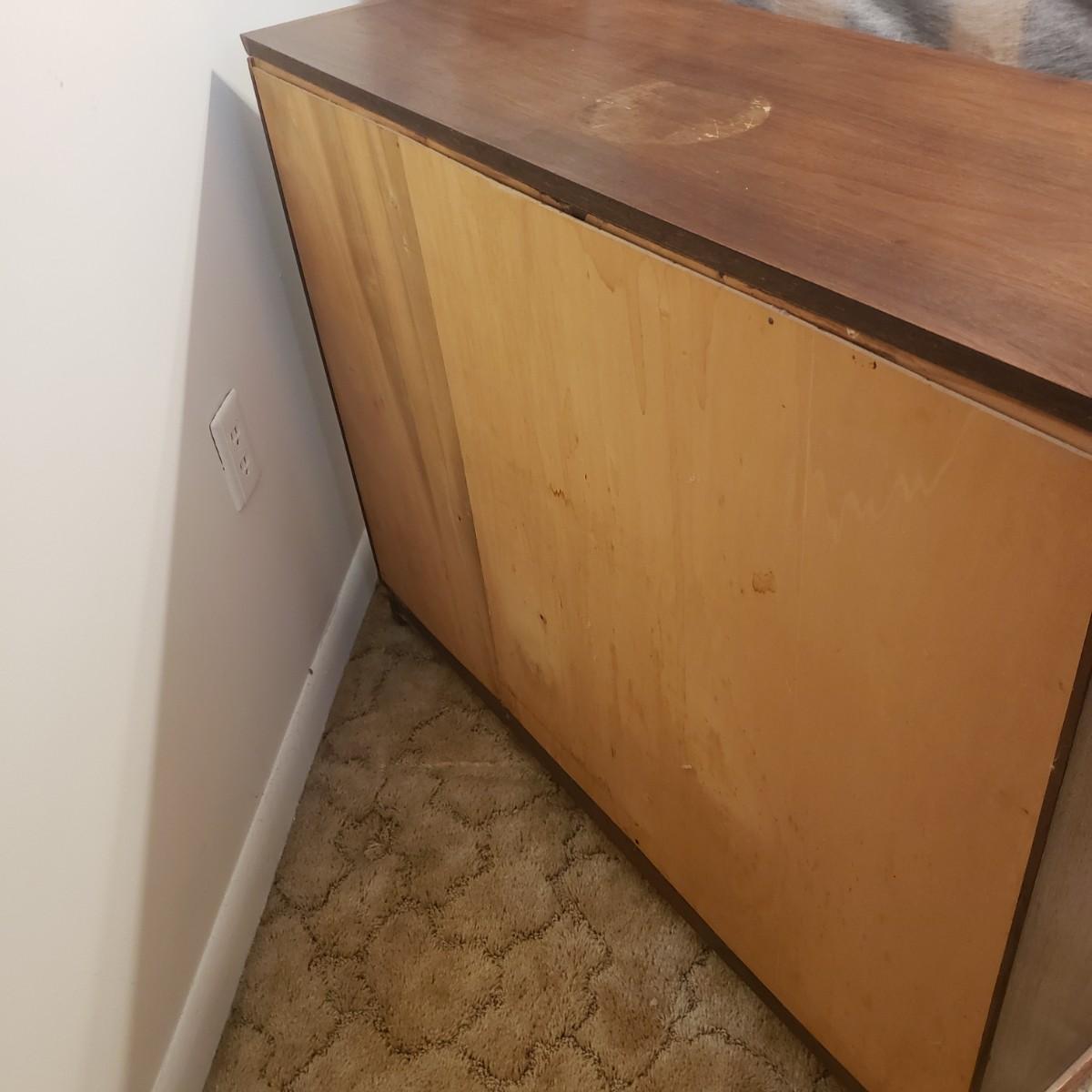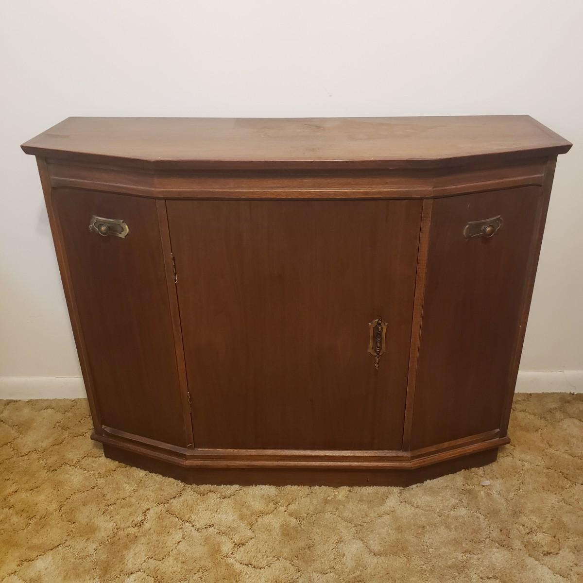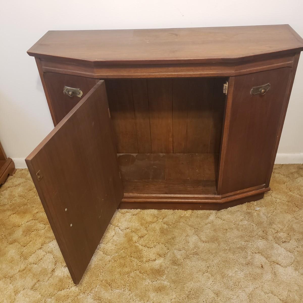 This is an MCM console cabinet. The two side doors do not open. The large door is magnetic. There are holes on the inside to attach a shelf, if you want to add one. No shelf included. There is a blemish on the top from a plant. The console measures 40" x 14" x 31"H. The console is beveled, see top picture.