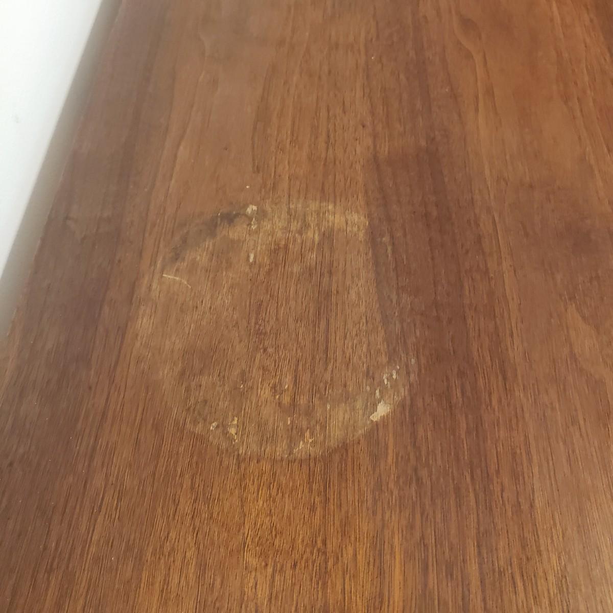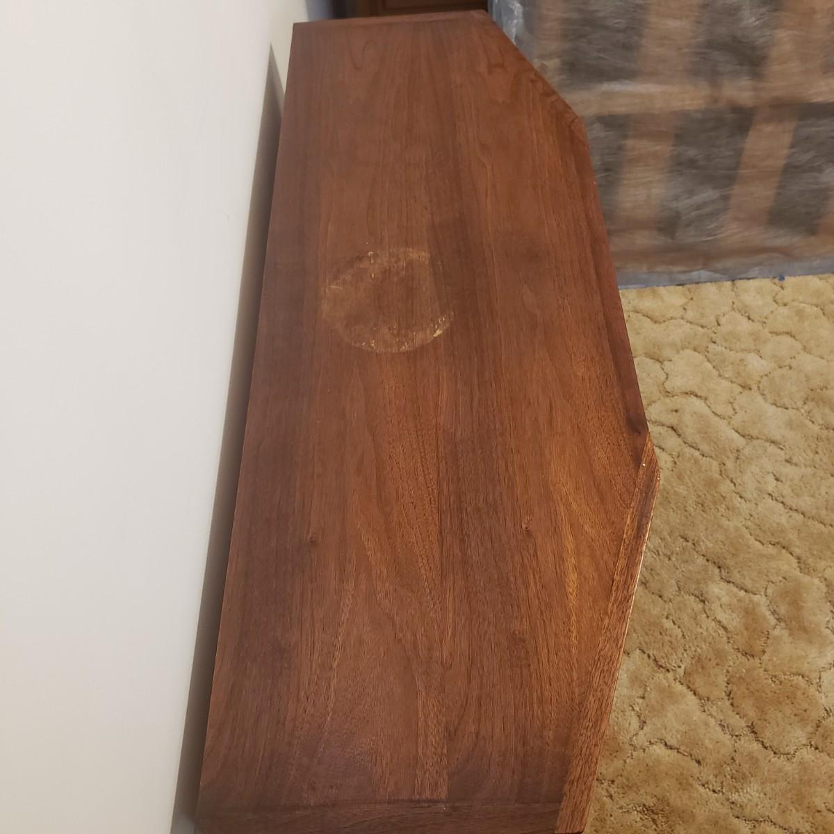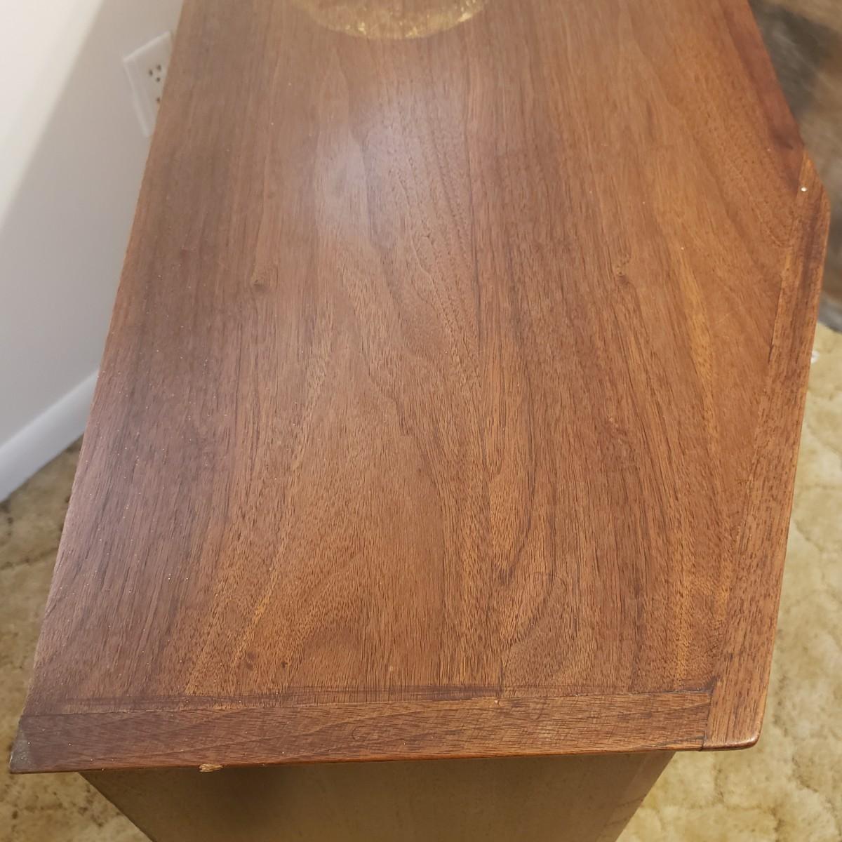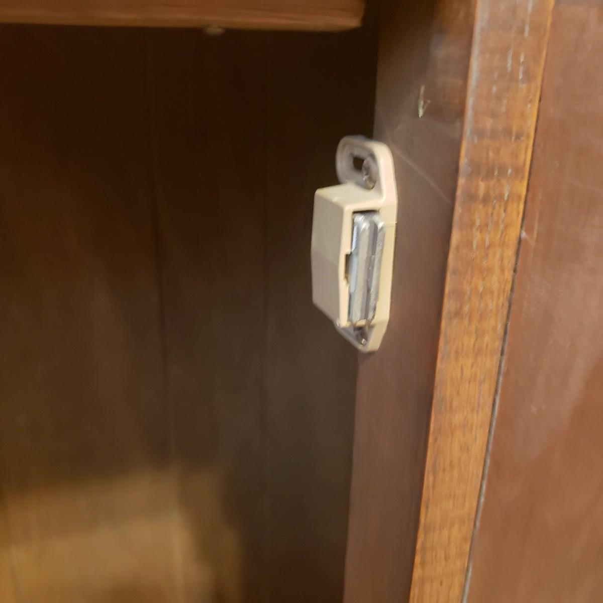 This is an MCM console cabinet. The two side doors do not open. The large door is magnetic. There are holes on the inside to attach a shelf, if you want to add one. No shelf included. There is a blemish on the top from a plant. The console measures 40" x 14" x 31"H. The console is beveled, see top picture.