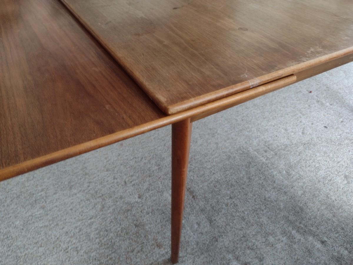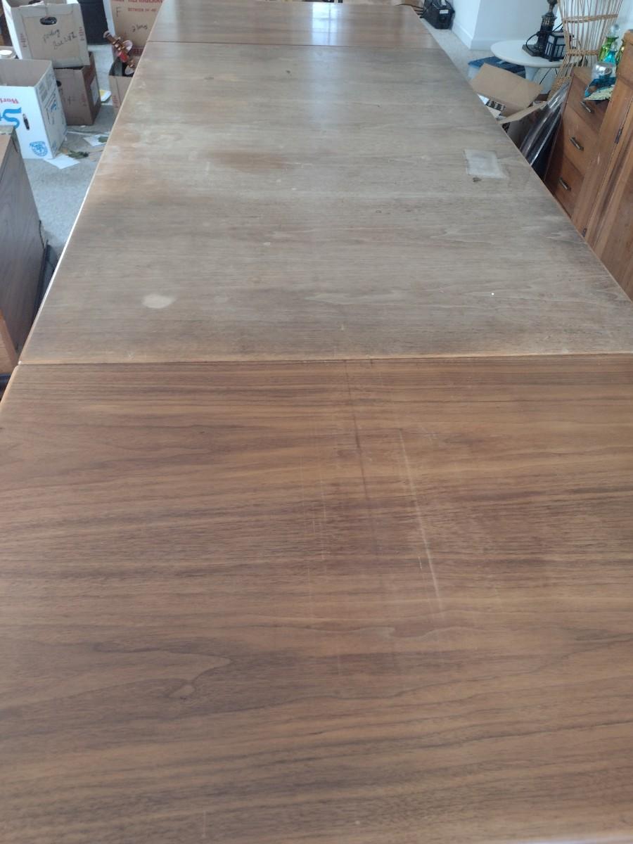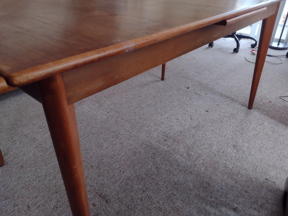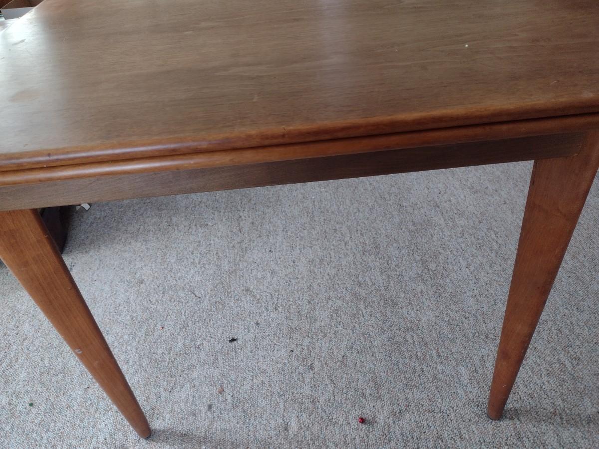 MCM Design Table with Leaf Extensions . Was used as a crafting work table. Has some stains and marks on the surface finish.