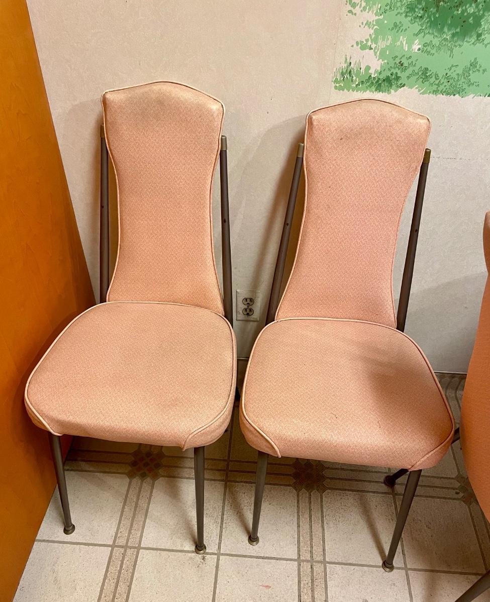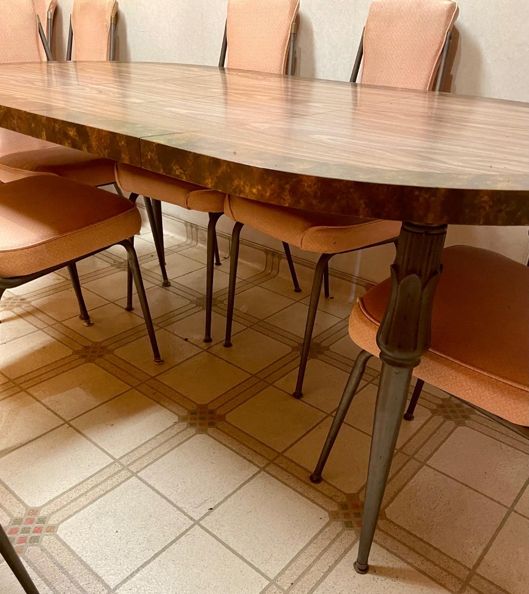 Has 2 leaves, table and all 8 chairs are in good condition (no holes, splits or damage, but they need to be cleaned). Table is approx. 72” x 36”.