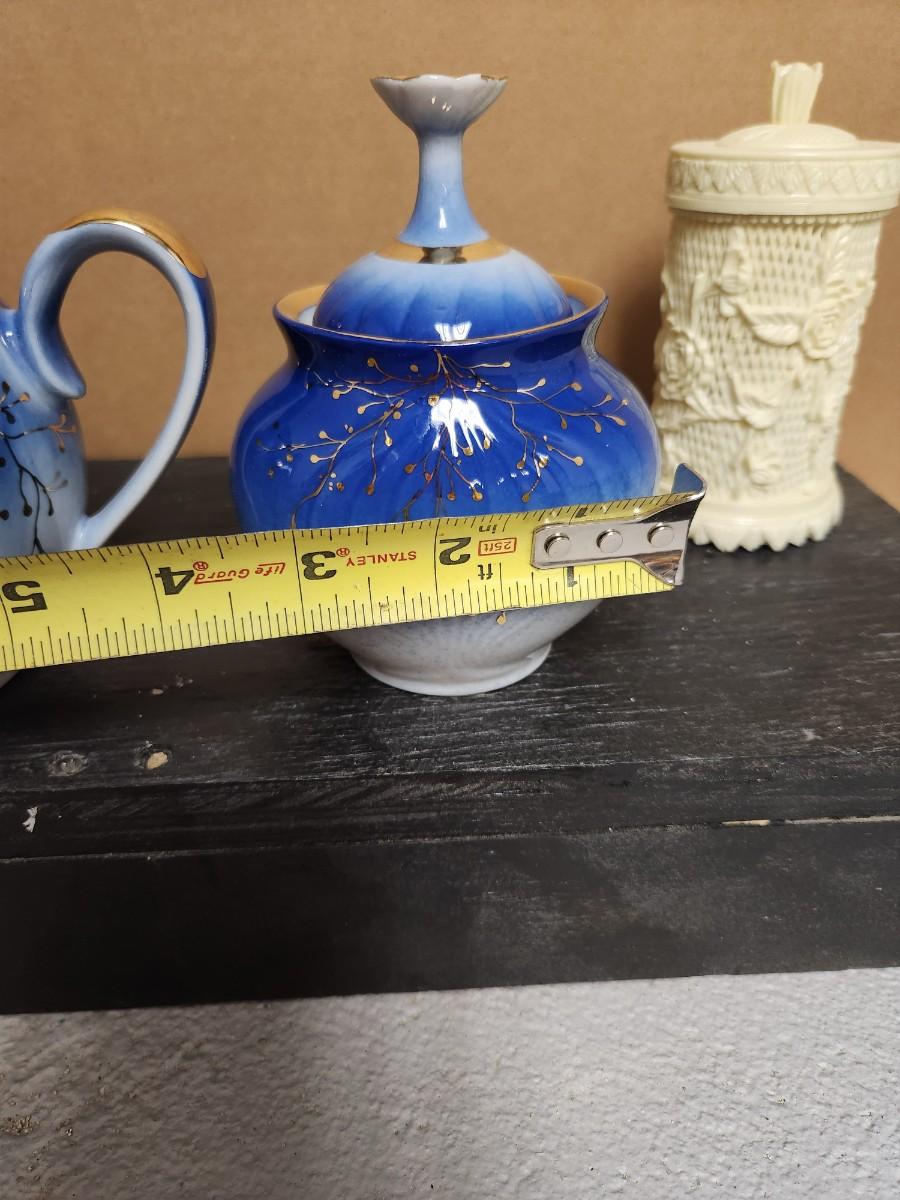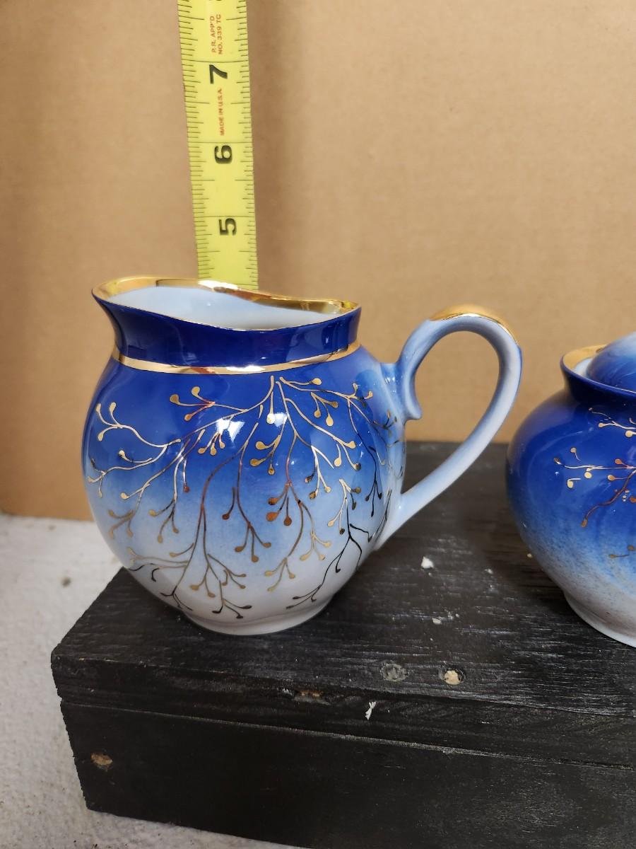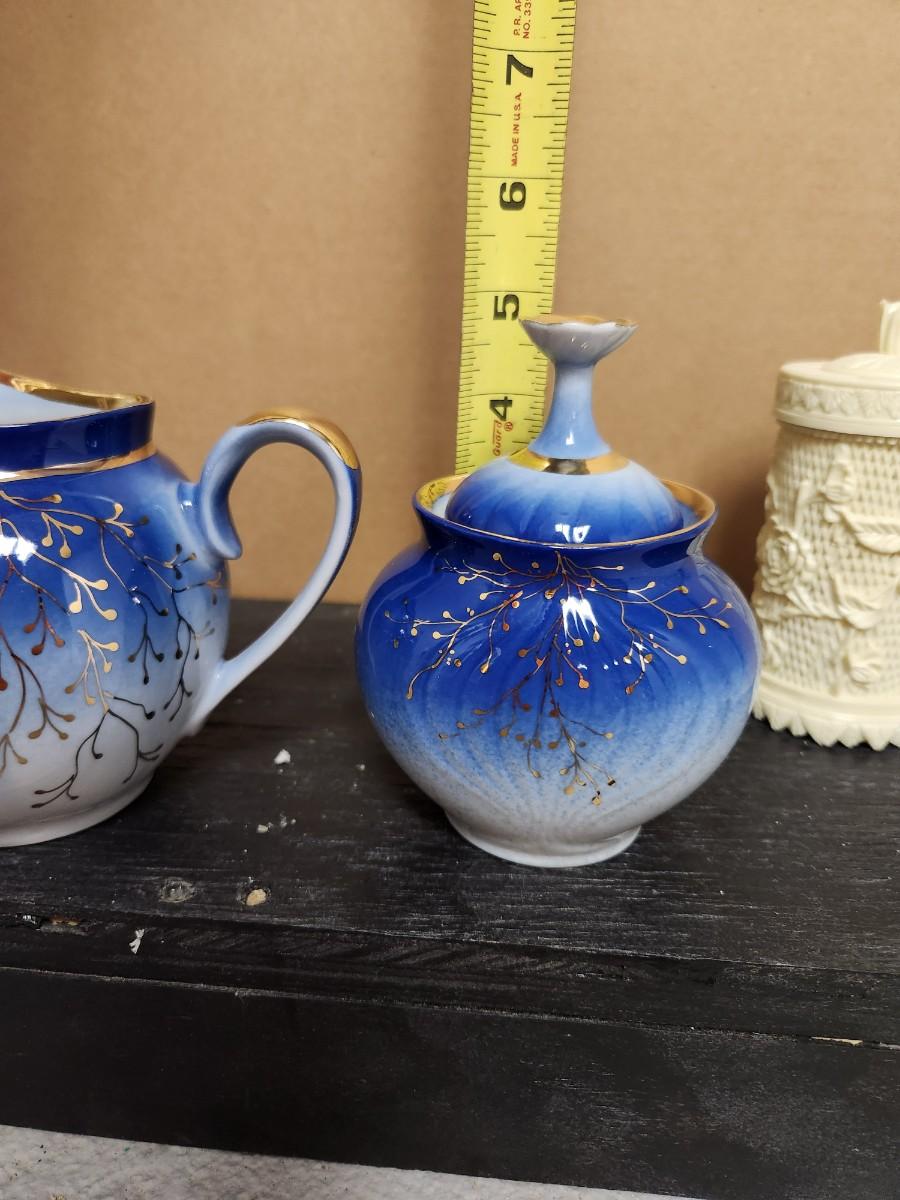 Funky blue cream and sugar and a made in Hong Kong plastic pic set.