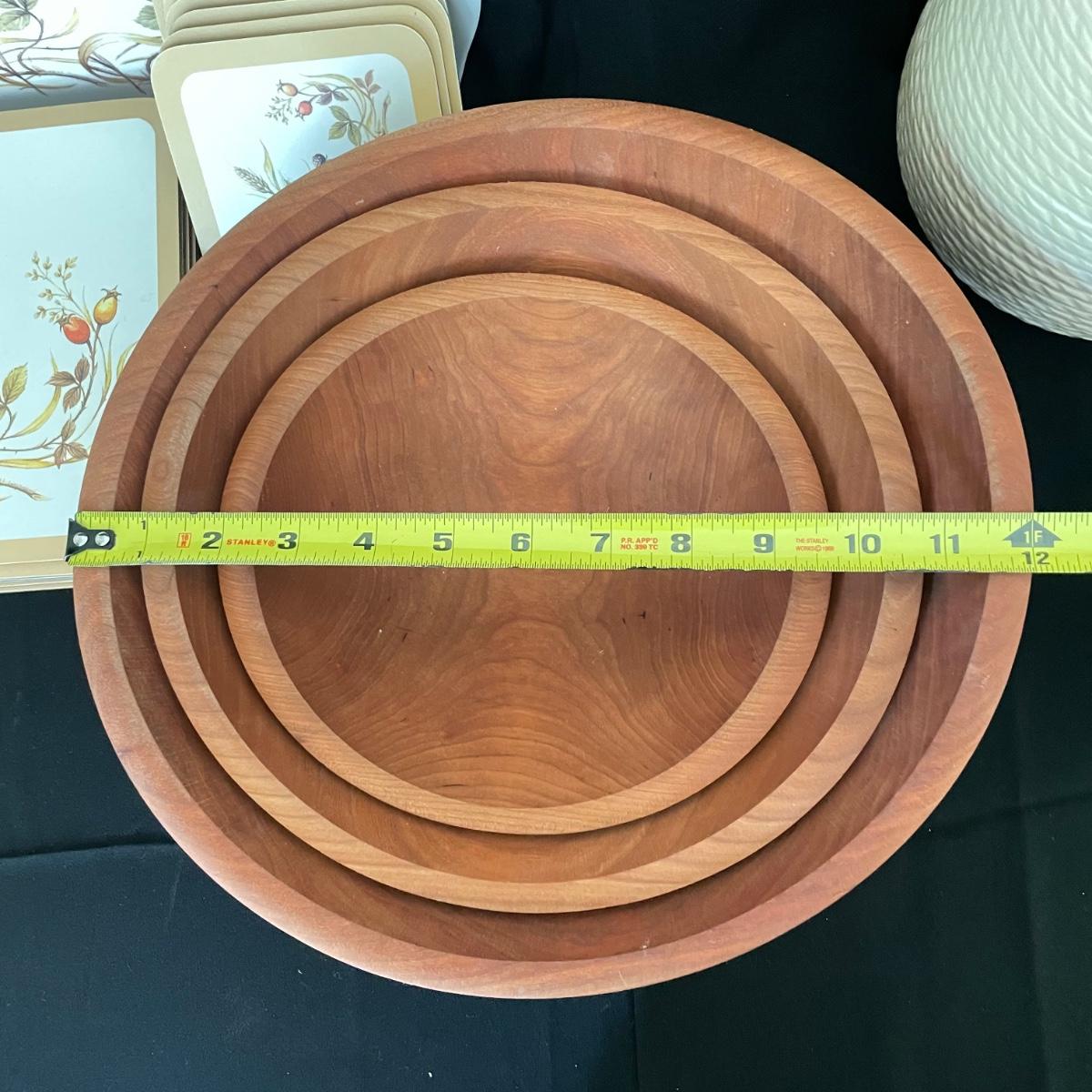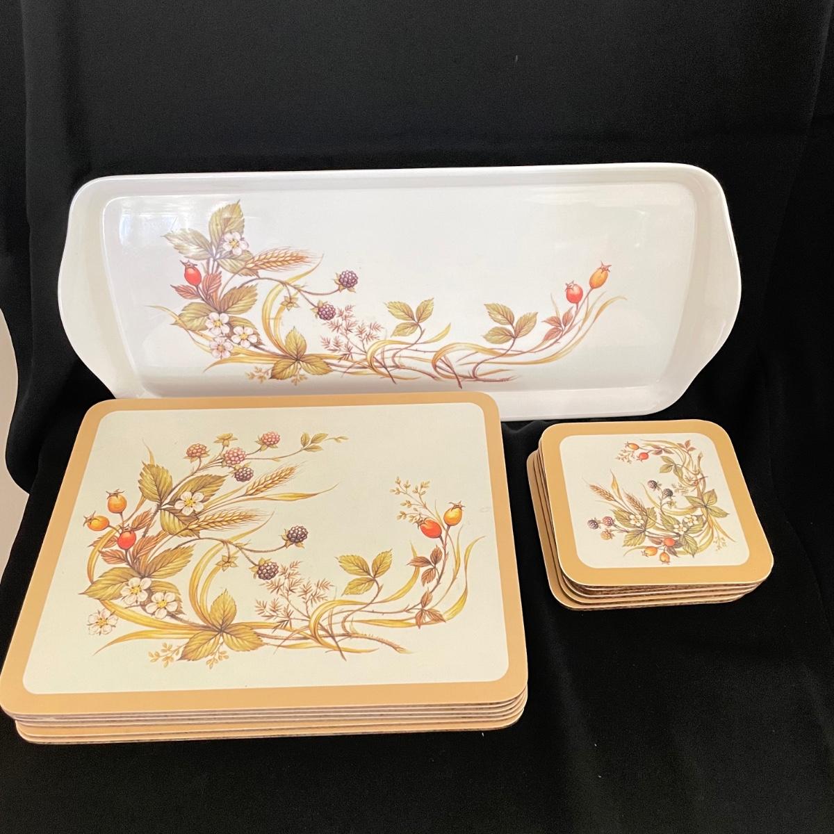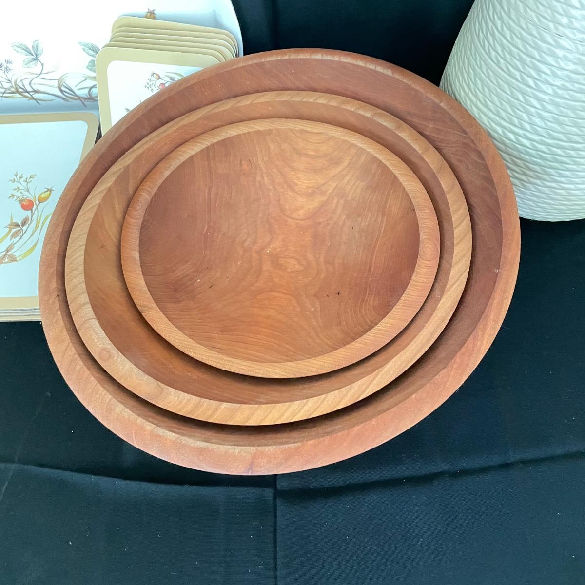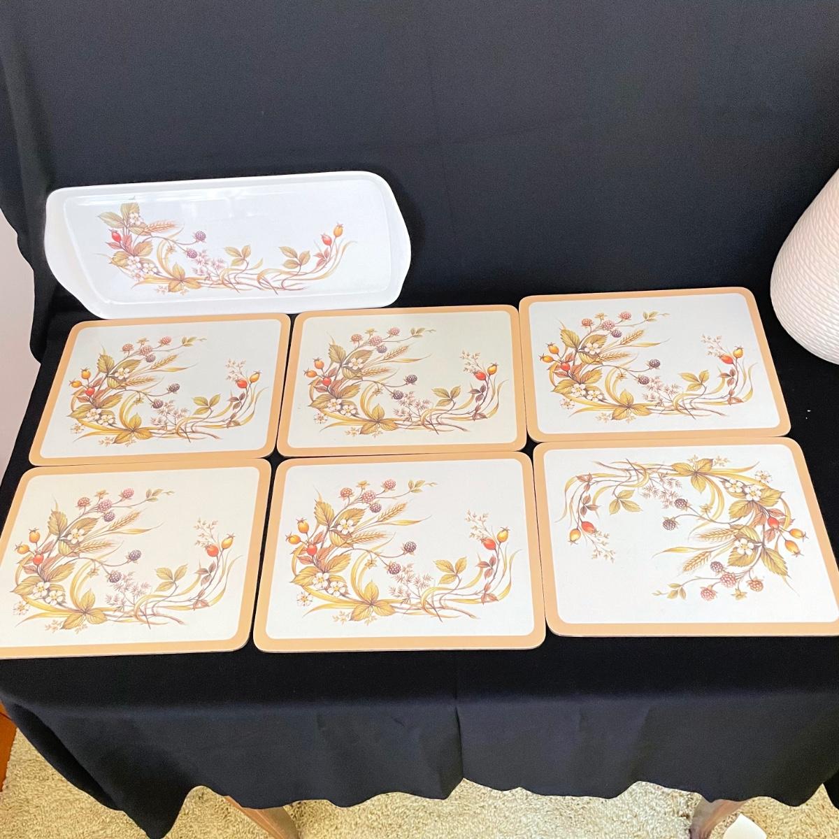 Fun vintage MCM style entertaining. A set of St. Michael’s cork placemats and coasters with a rectangle dish. Lot includes three wooden from handmade bowls by The Bowl Mill which are just slightly oval shaped. Lot also includes six wooden napkin rings and an English stoneware pitcher measuring about 8” x 10”. See images. Shipping available.