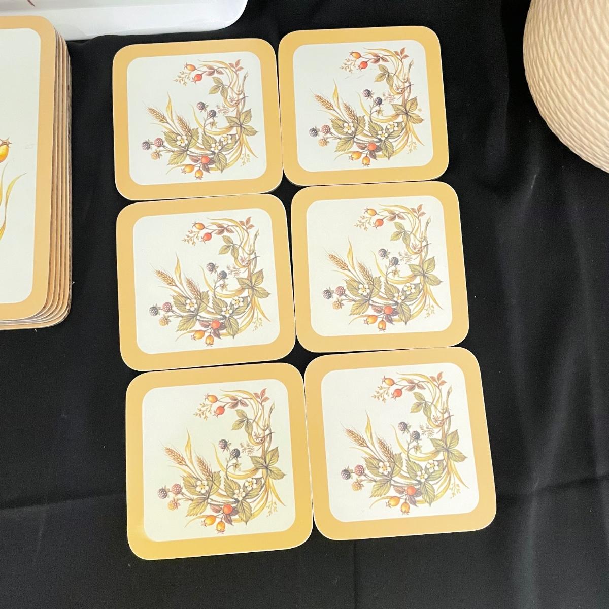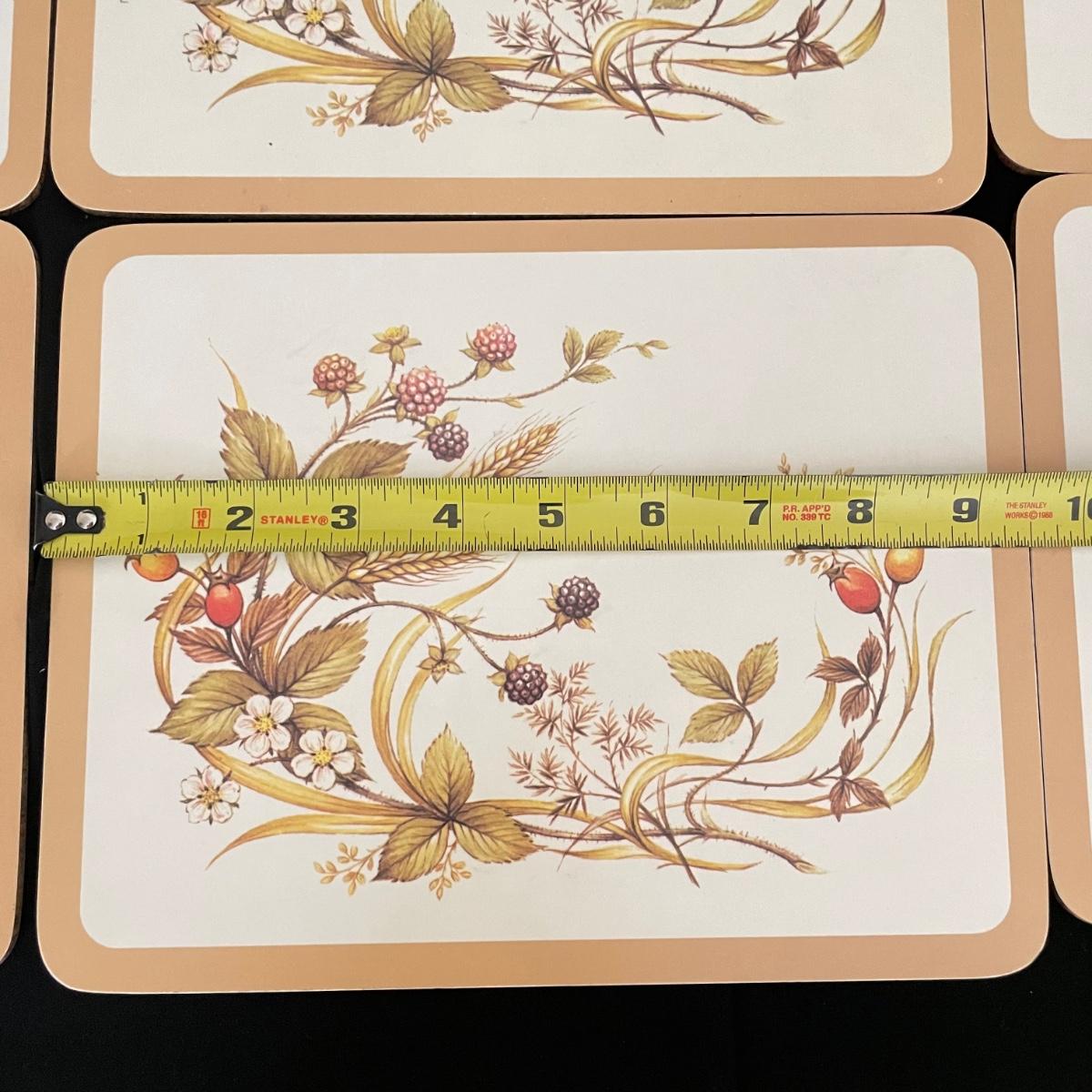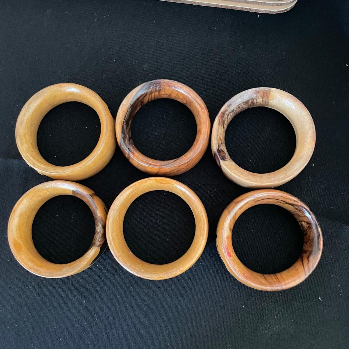 Fun vintage MCM style entertaining. A set of St. Michael’s cork placemats and coasters with a rectangle dish. Lot includes three wooden from handmade bowls by The Bowl Mill which are just slightly oval shaped. Lot also includes six wooden napkin rings and an English stoneware pitcher measuring about 8” x 10”. See images. Shipping available.