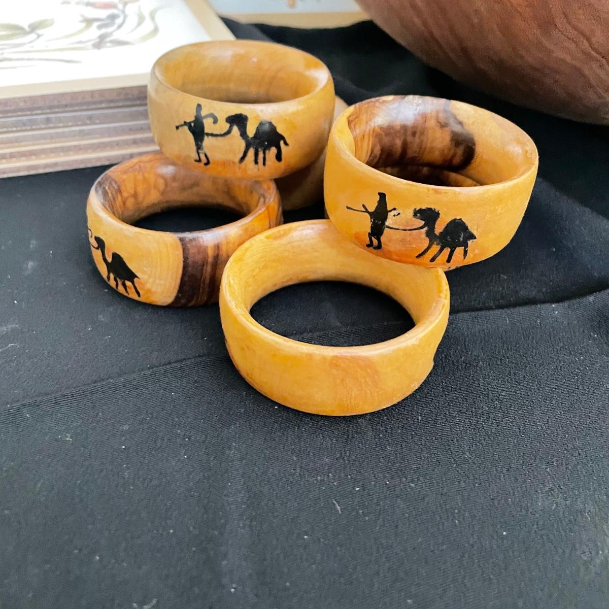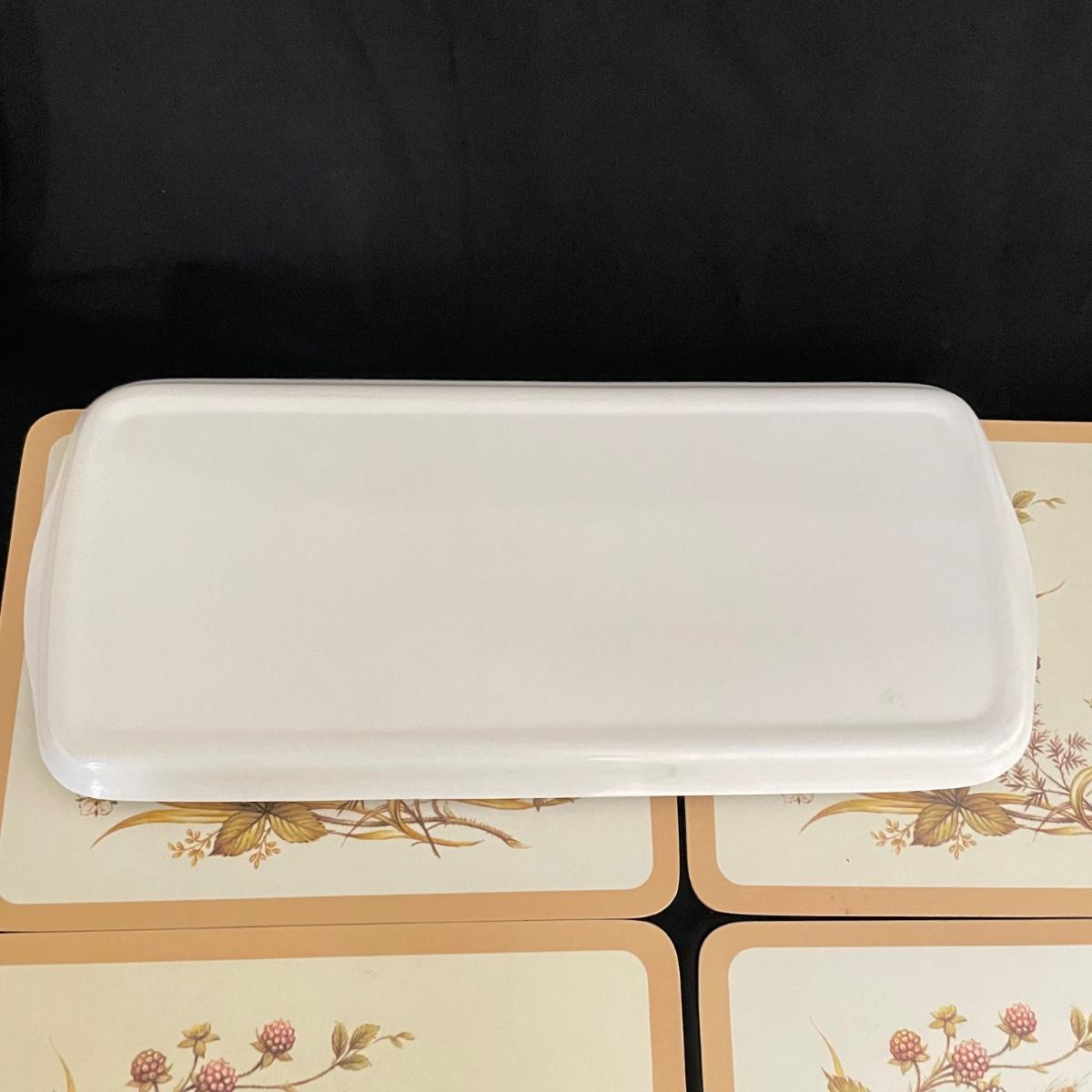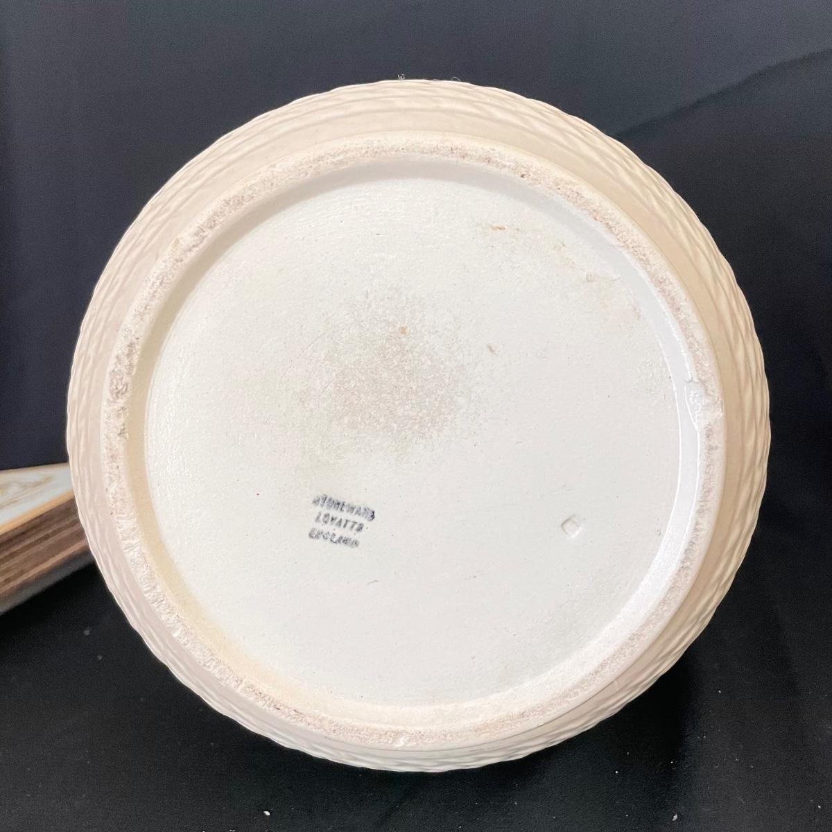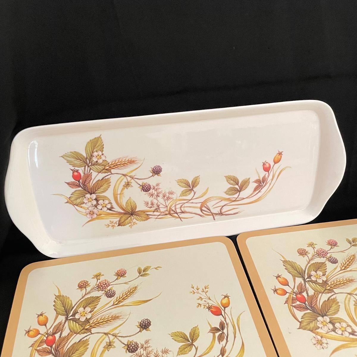 Fun vintage MCM style entertaining. A set of St. Michael’s cork placemats and coasters with a rectangle dish. Lot includes three wooden from handmade bowls by The Bowl Mill which are just slightly oval shaped. Lot also includes six wooden napkin rings and an English stoneware pitcher measuring about 8” x 10”. See images. Shipping available.