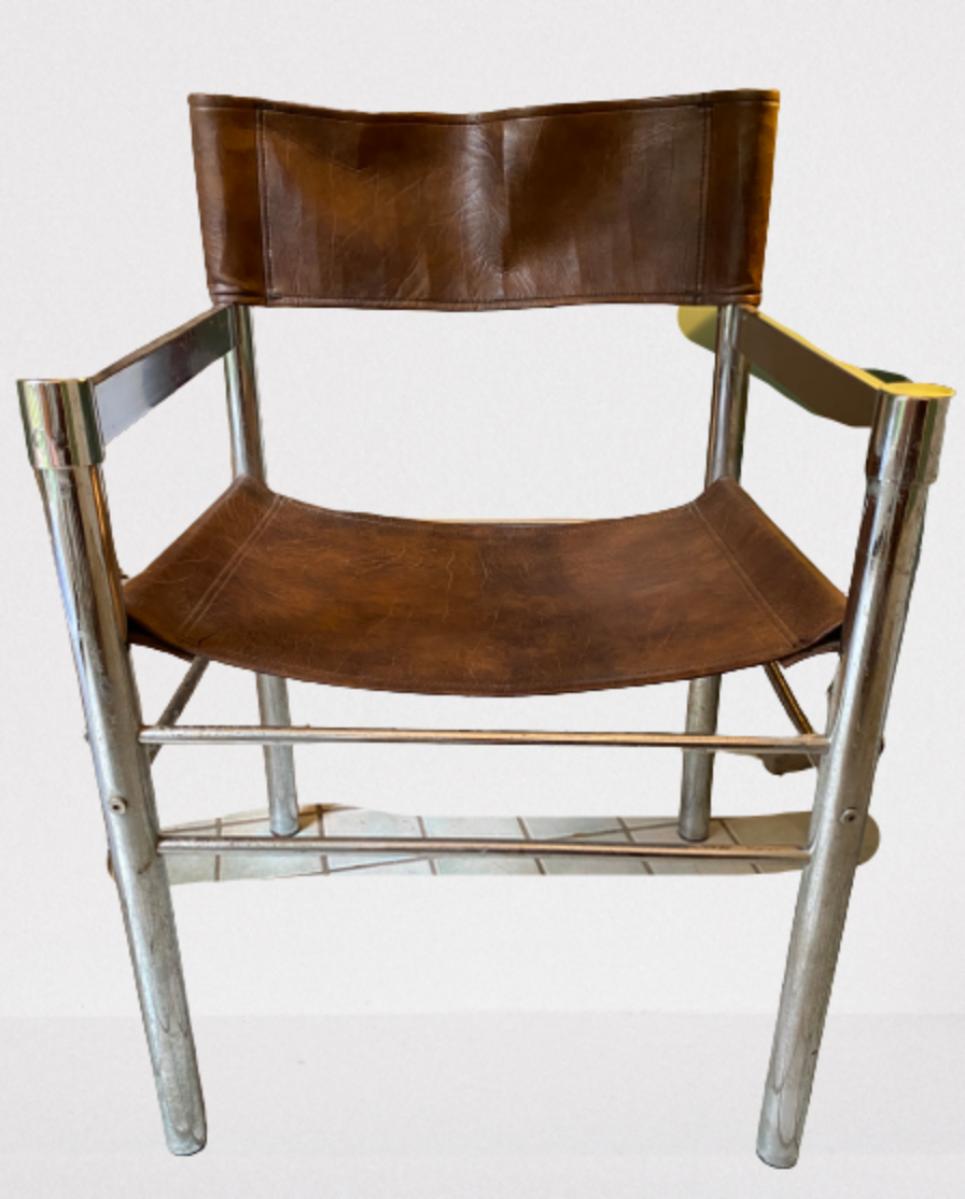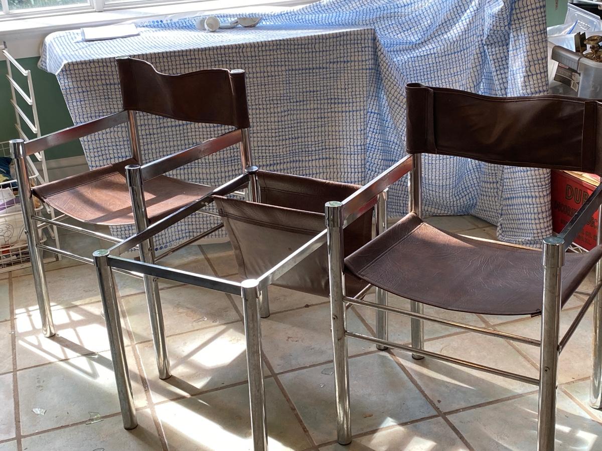 Wonderful mid century set straight from the 60s! Tubular chrome director chairs with Naugahyde sling backs and seats and a coordinating tubular table with a sling magazine rack. The glass top from the table is missing but easily cut to size at Home Depot.