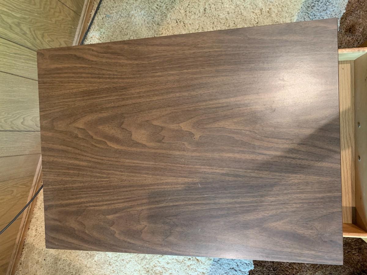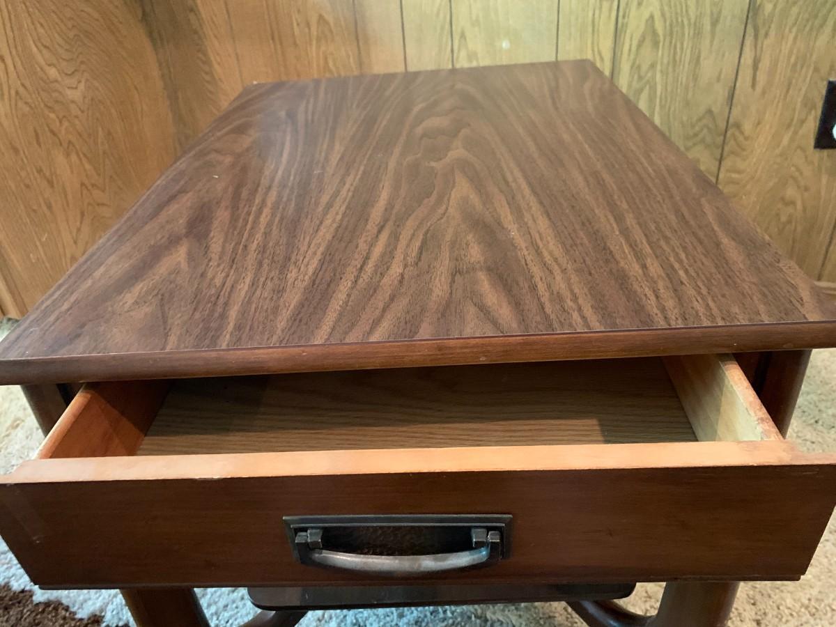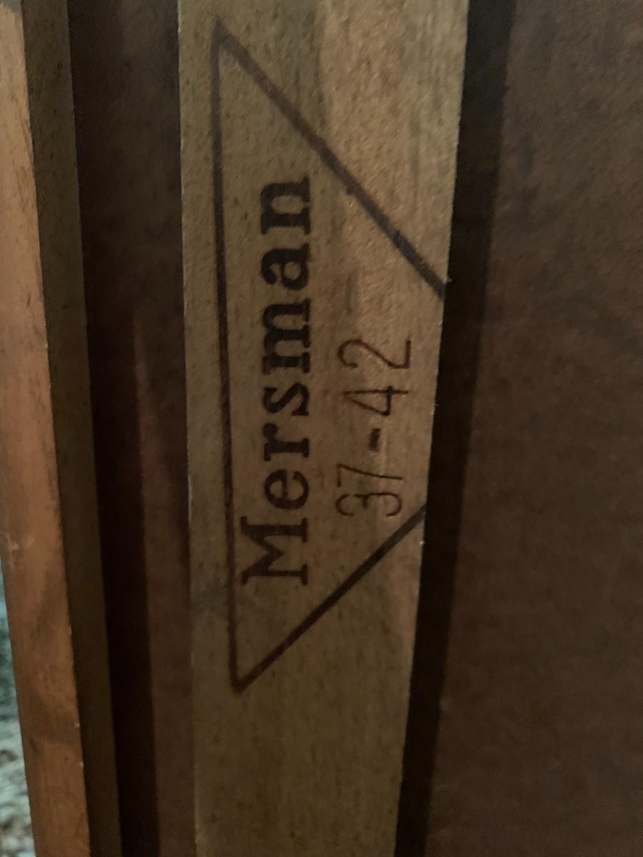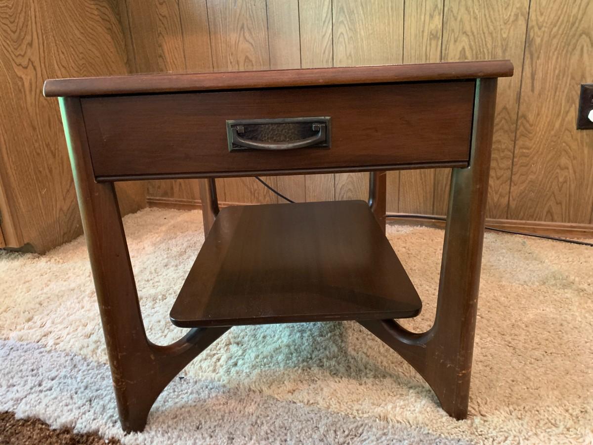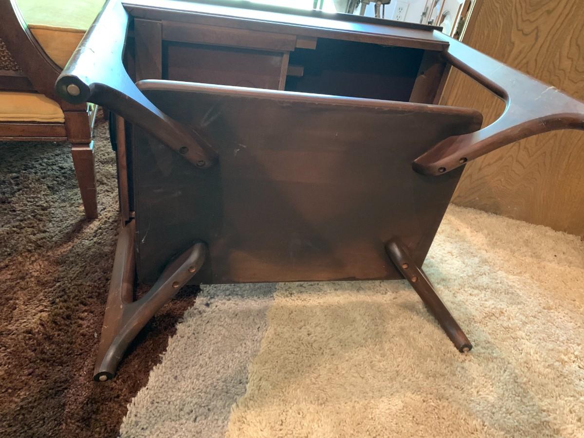 The mid century table is made by Mersman 37-42. The front legs have scuff marks and scratches (possibly from a wheel chair). It measures 20' wide x 27 3/4" deep x 20" tall.