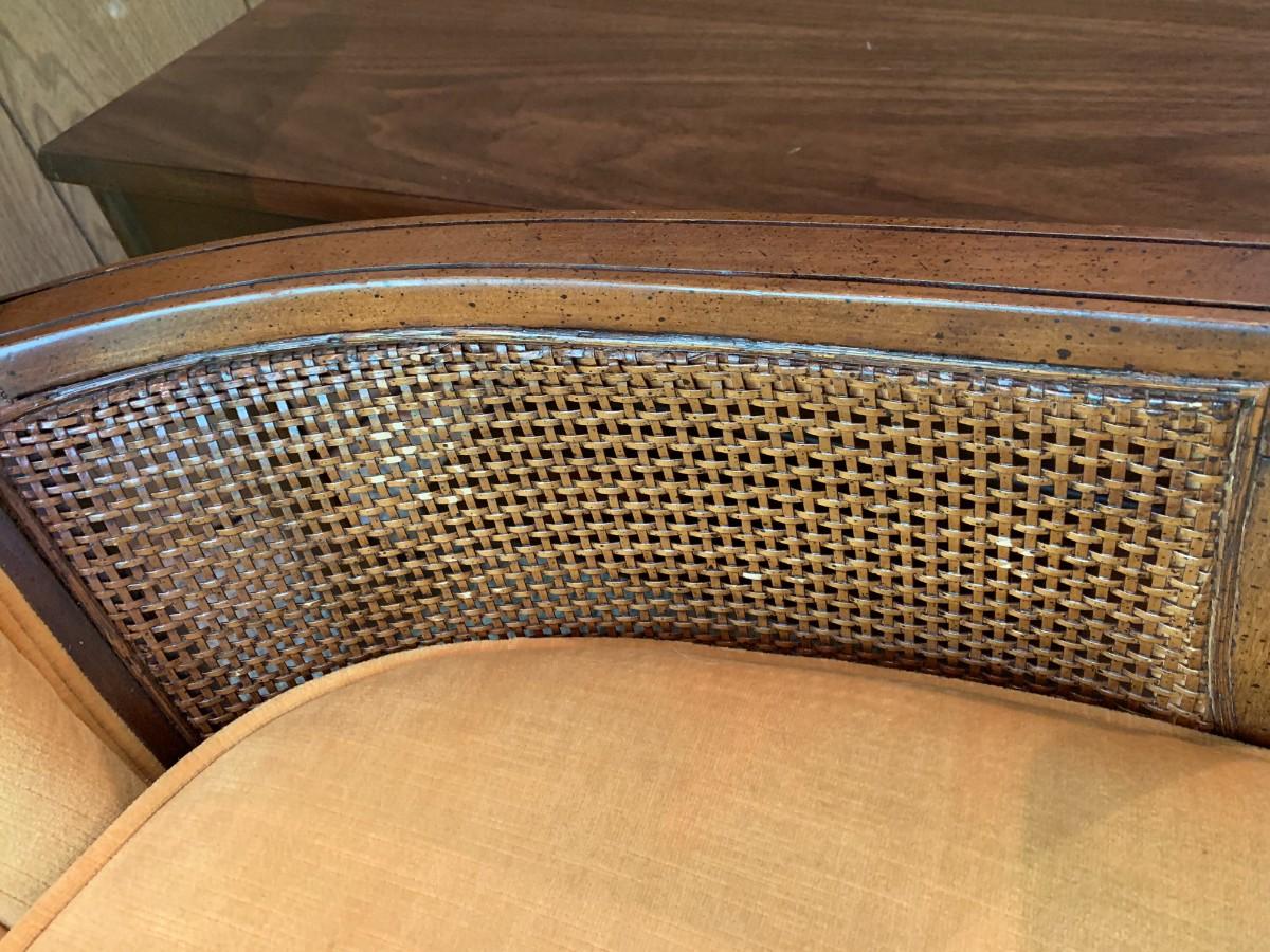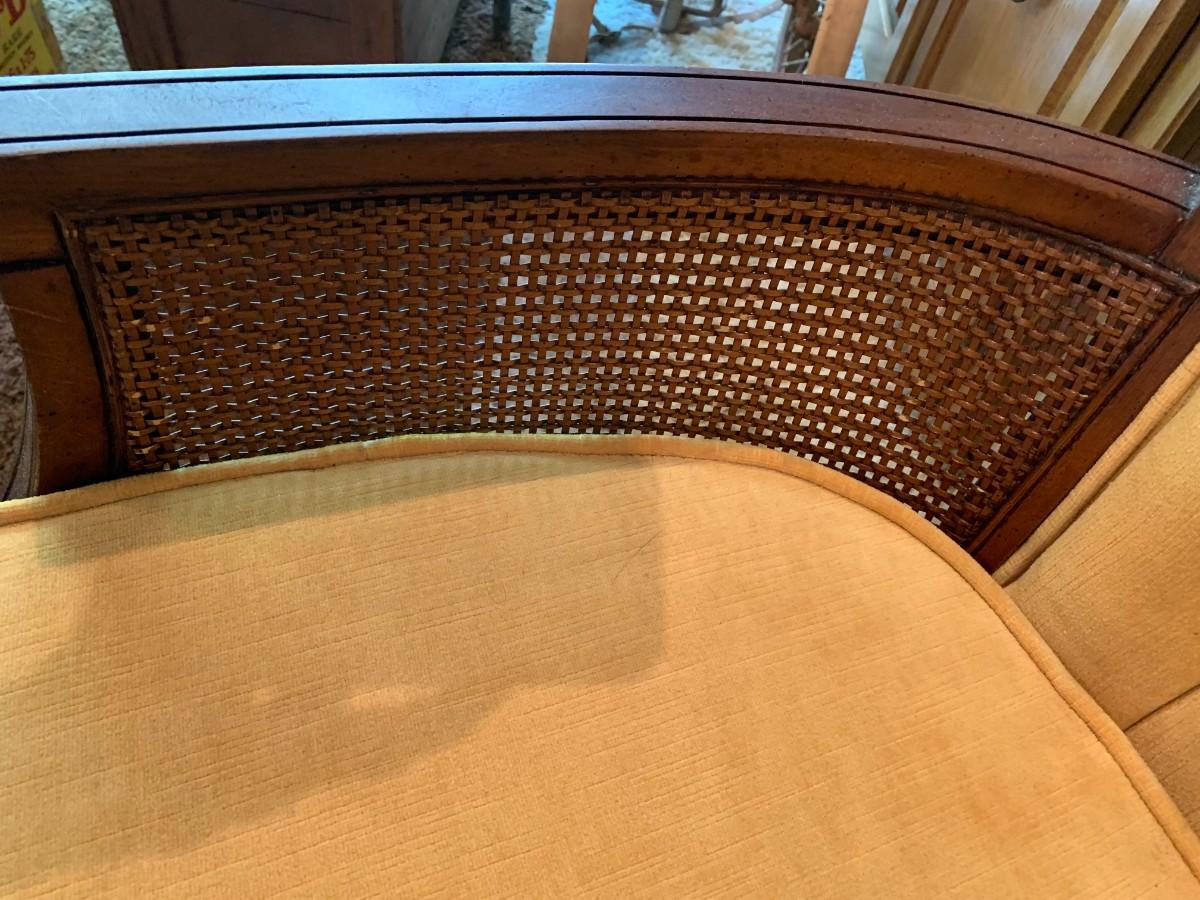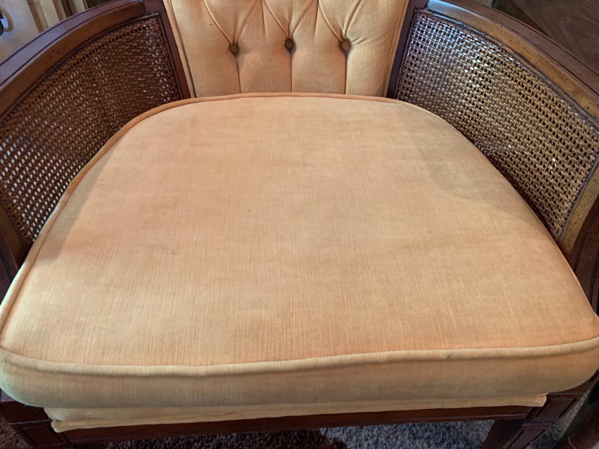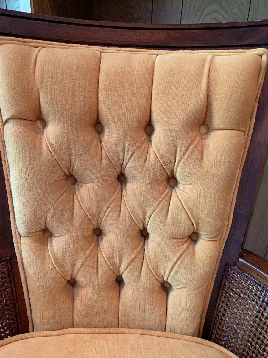 Mid century upholstered Fairfield chair with tufted back. Very good condition. Legs of chair have scuff marks and scratches that can be easily touched up. The cane is in excellent condition...no breaks or holes. Pretty amazing for its age! I have included a picture of a current Ebay listing.