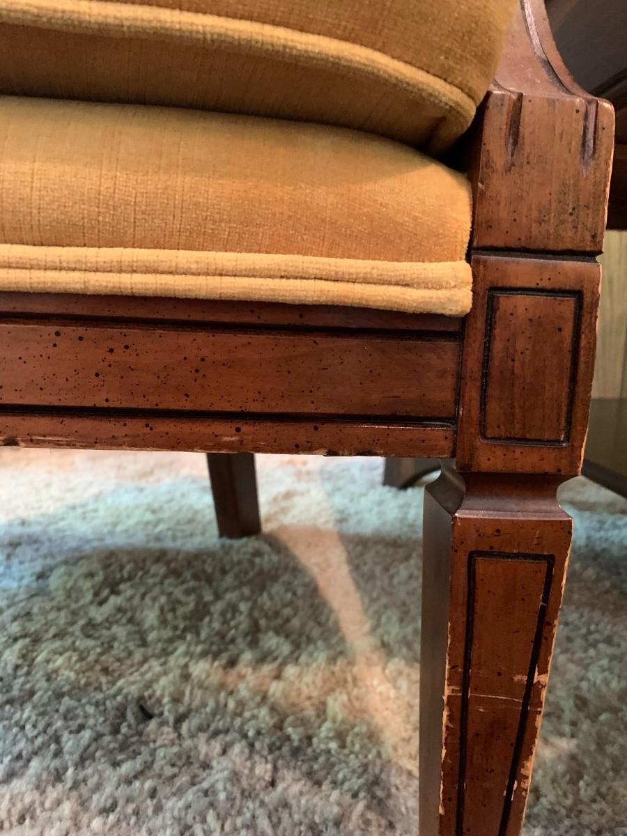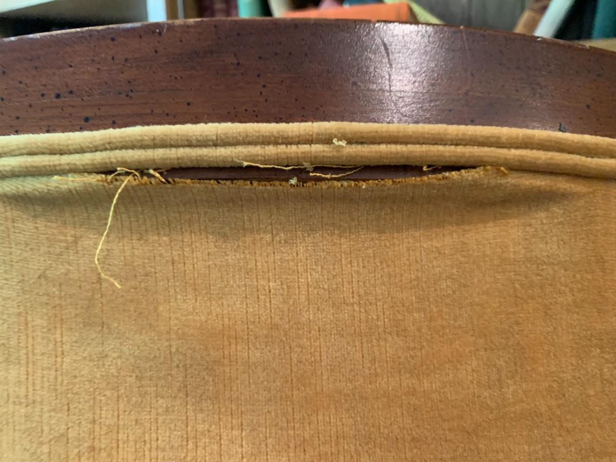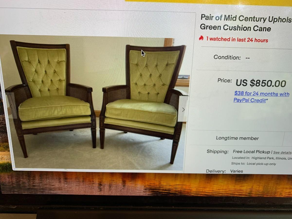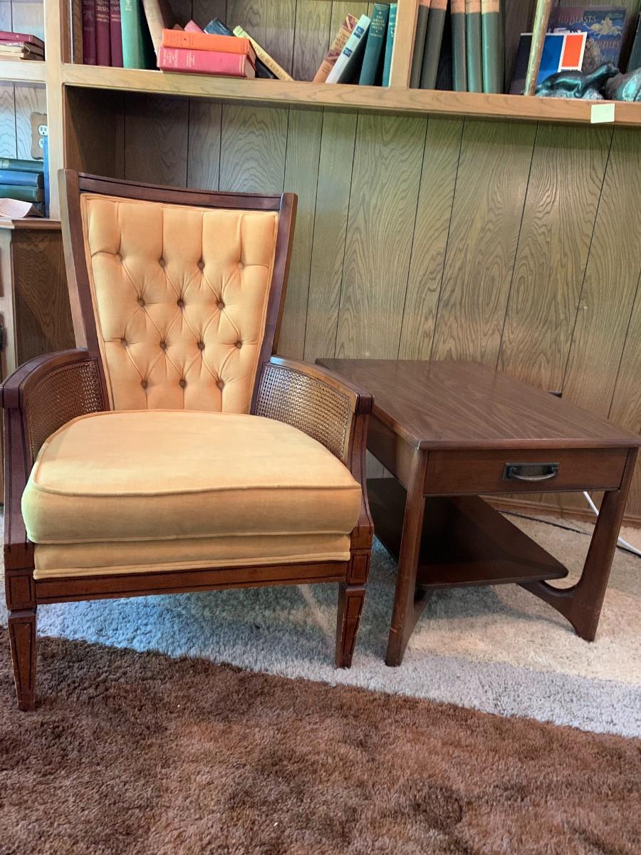 Mid century upholstered Fairfield chair with tufted back. Very good condition. Legs of chair have scuff marks and scratches that can be easily touched up. The cane is in excellent condition...no breaks or holes. Pretty amazing for its age! I have included a picture of a current Ebay listing.