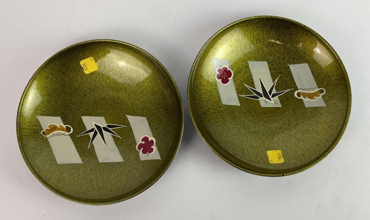 From post war importer Fred Roberts of San Francisco here are a pair of Mid Century Modern designer plastic bowls made in Japan...8" x 1.5"h...as shown..they still retain original store labels..no sign of use.