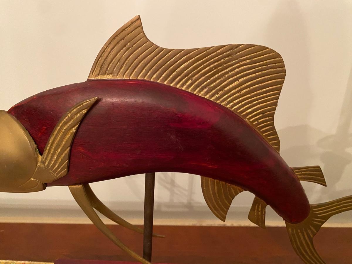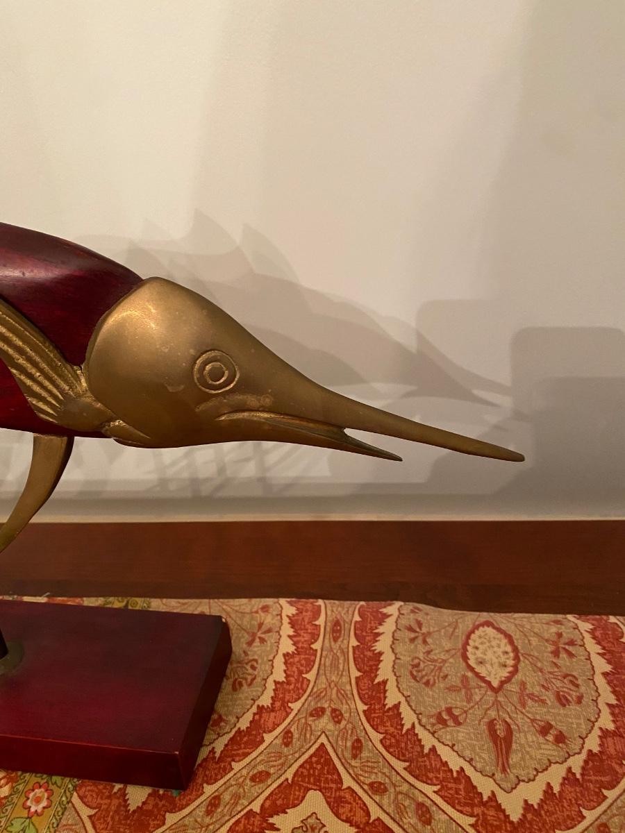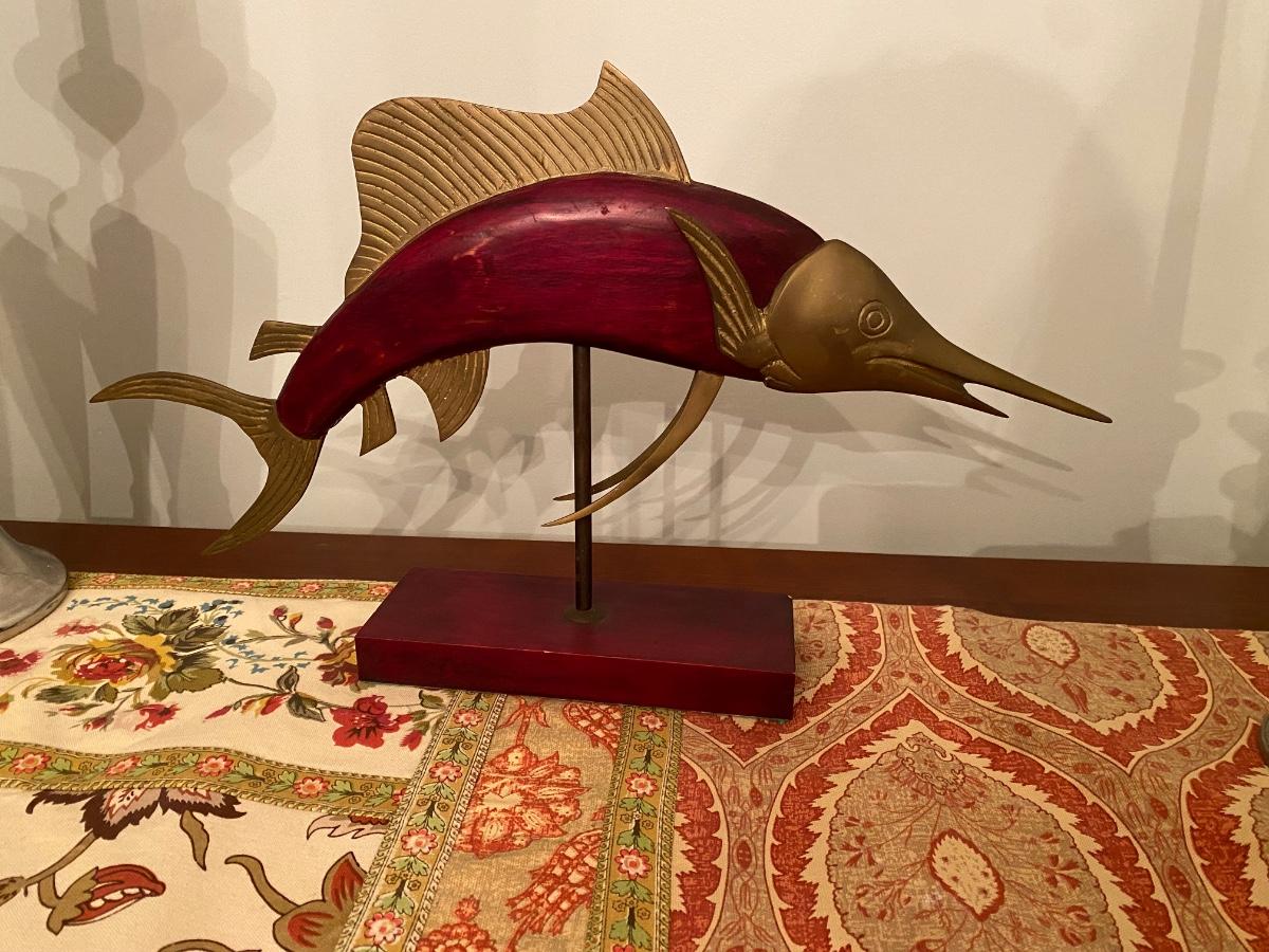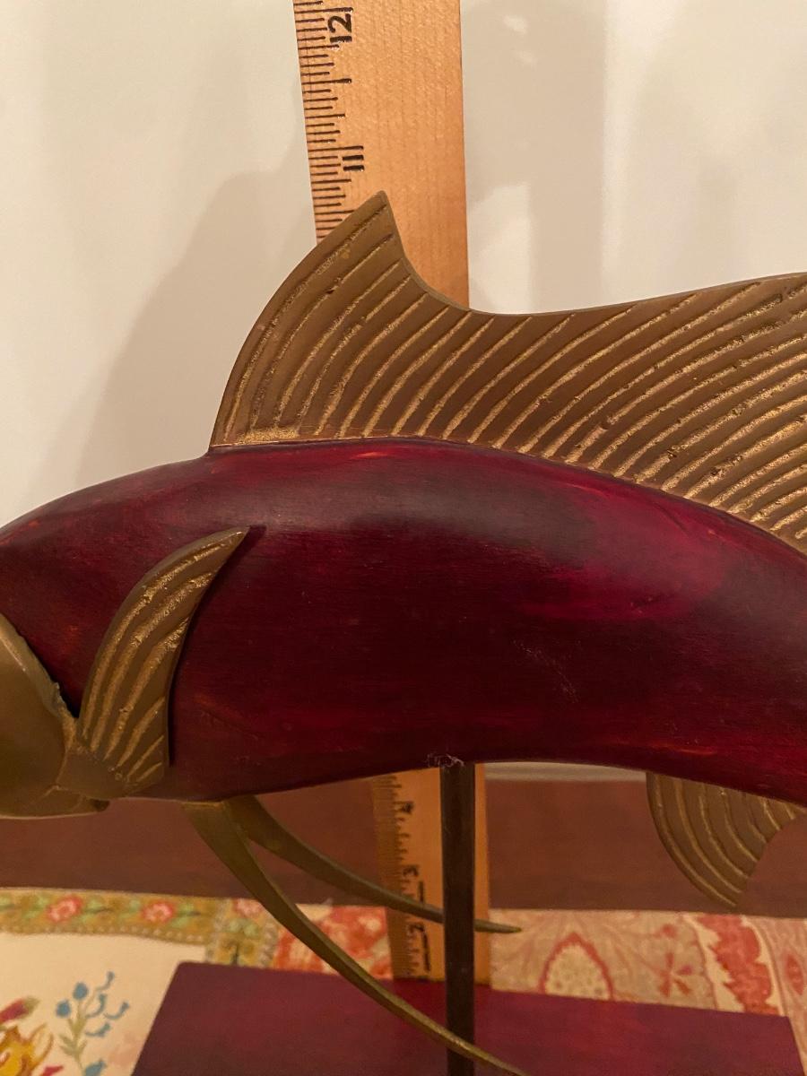 Vintage Mid Century Modern Frederick Cooper Style Brass Wood Marlin Sculpture. Unsigned It does have some scratches and minor dings on the base. Measures 16'5" X 10" tall