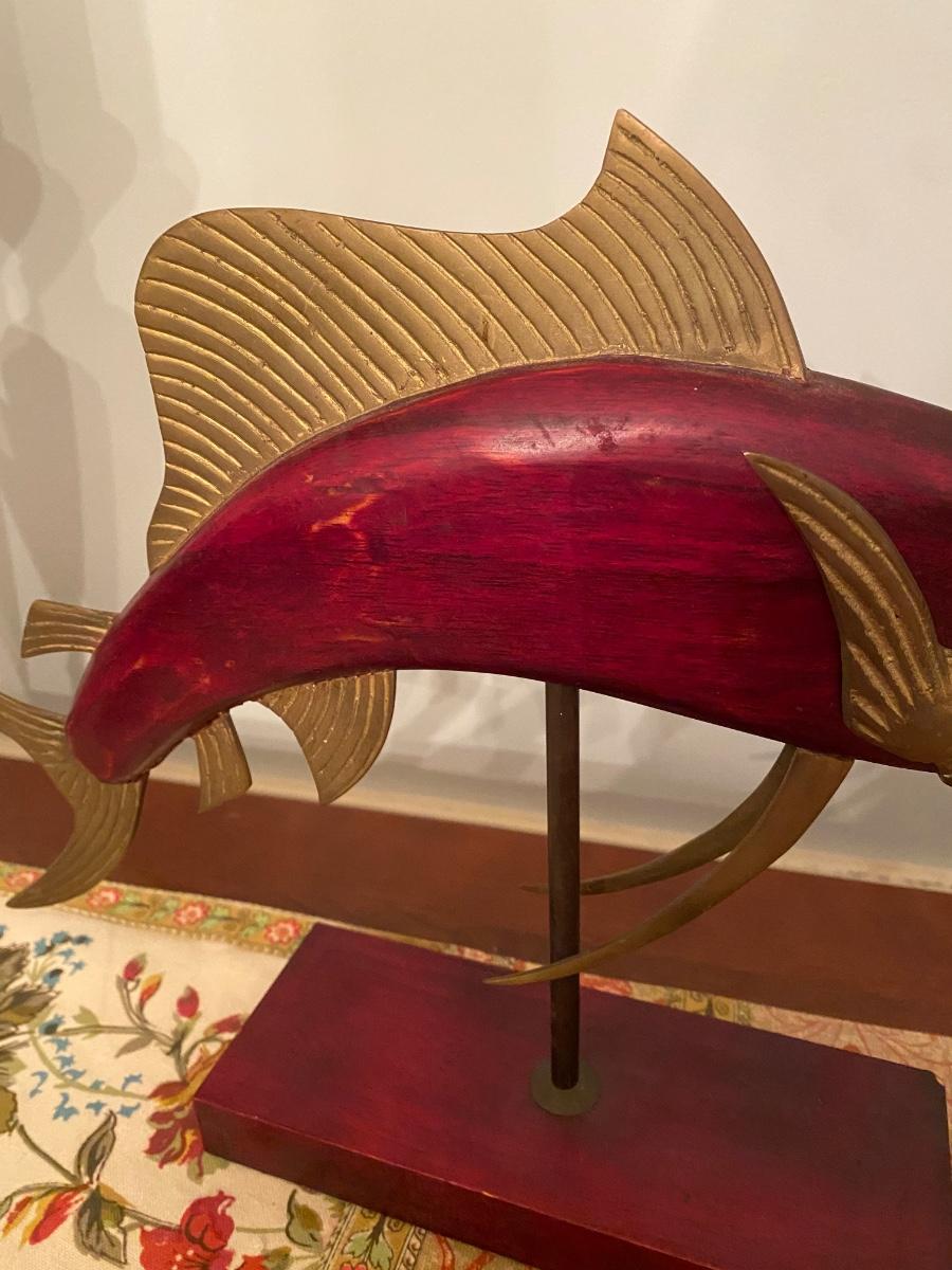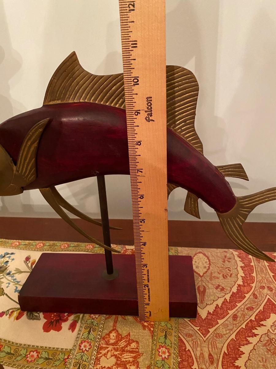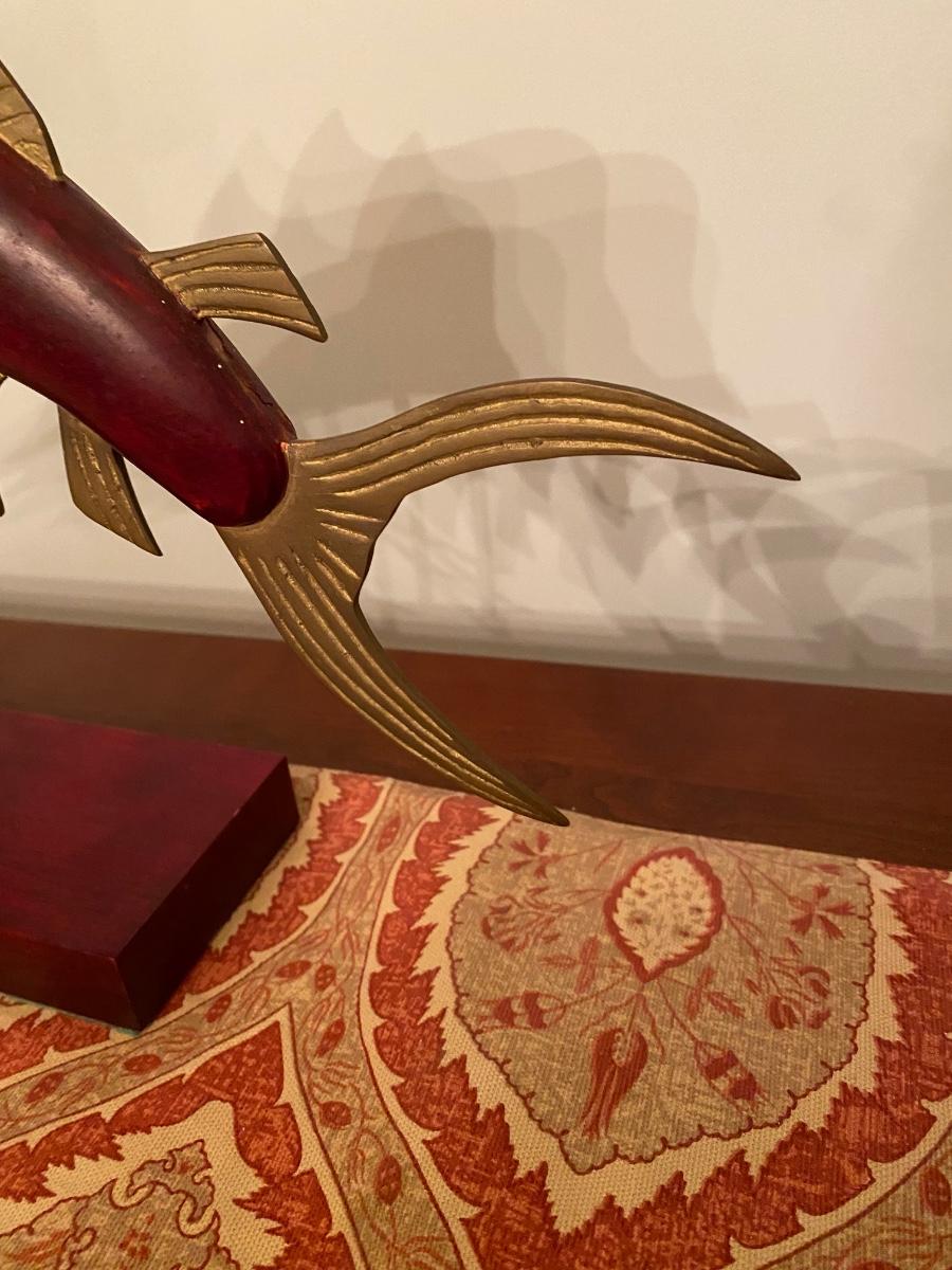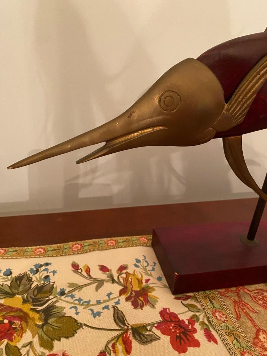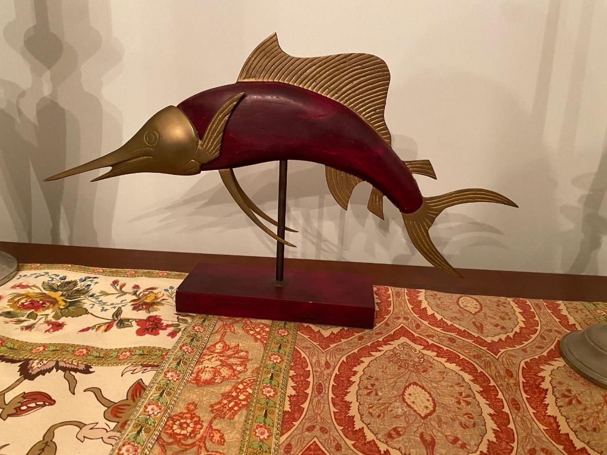 Vintage Mid Century Modern Frederick Cooper Style Brass Wood Marlin Sculpture. Unsigned It does have some scratches and minor dings on the base. Measures 16'5" X 10" tall