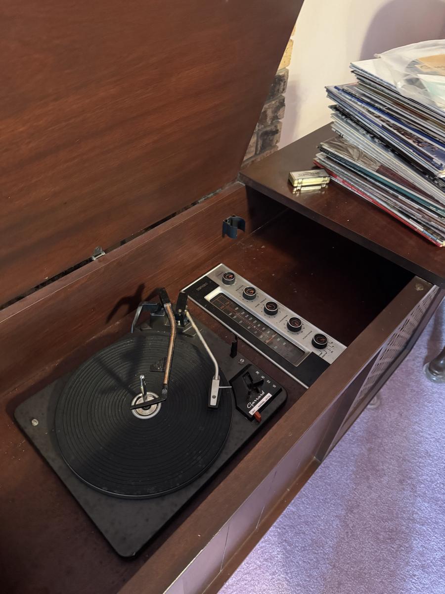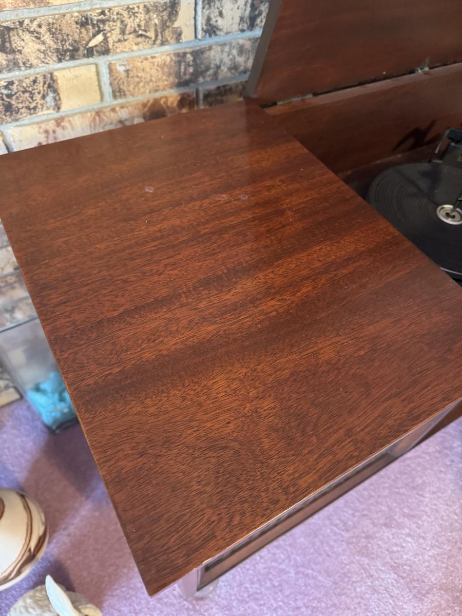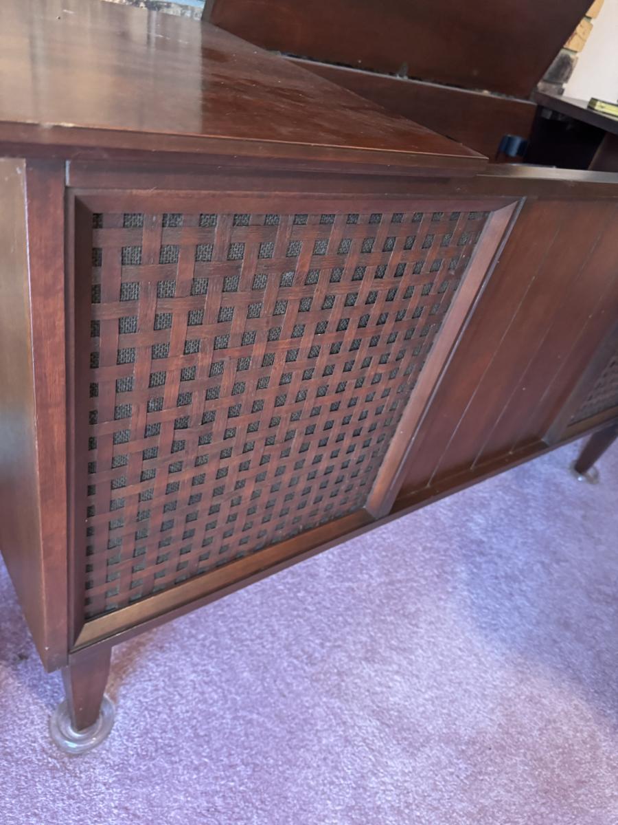 MCM console stereo as shown. Working condition but we couldn’t pick up a station. Missing the 45 holder and has two spots that need to be cleaned from duct tape. She had a picture stuck on it.