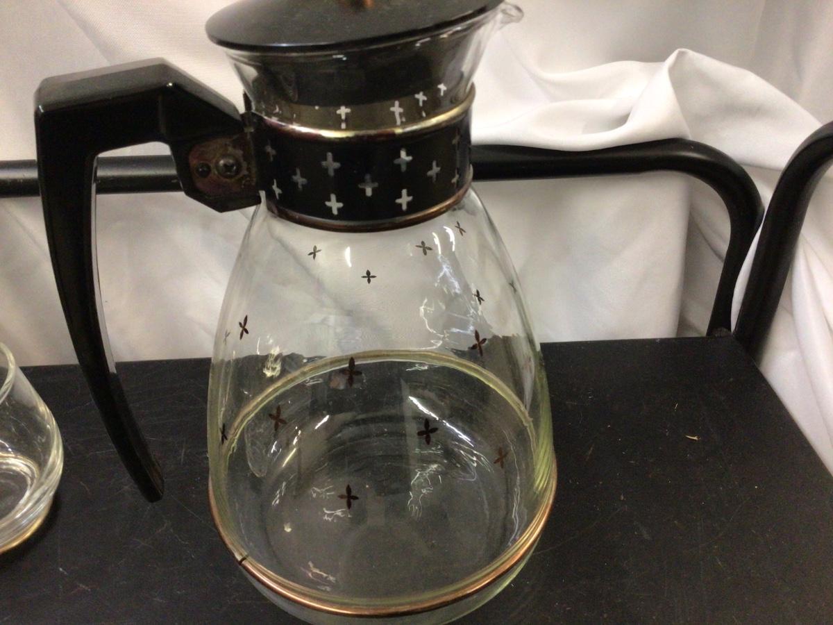 You get a great MCM coffee craft with gold starbursts decoration. They both work four glass coffee cups have brass handles. Very MCM.