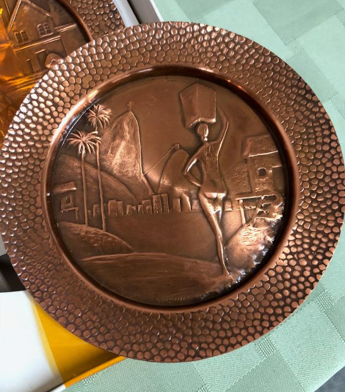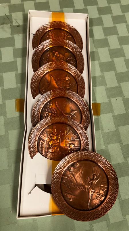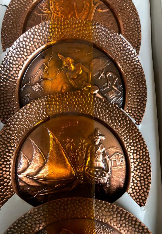 Like new condition on this set of hand hammered copper coaster set from Brazil....Vintage...with original box...