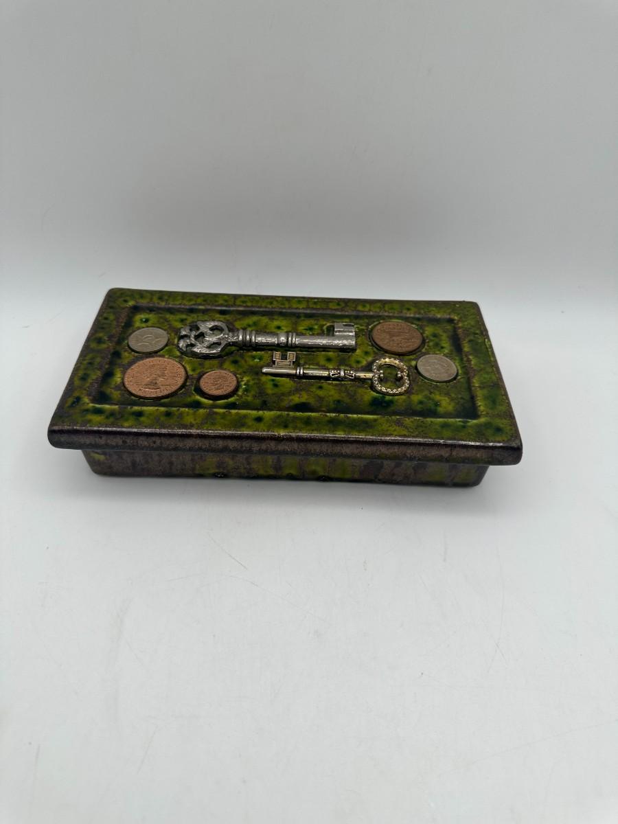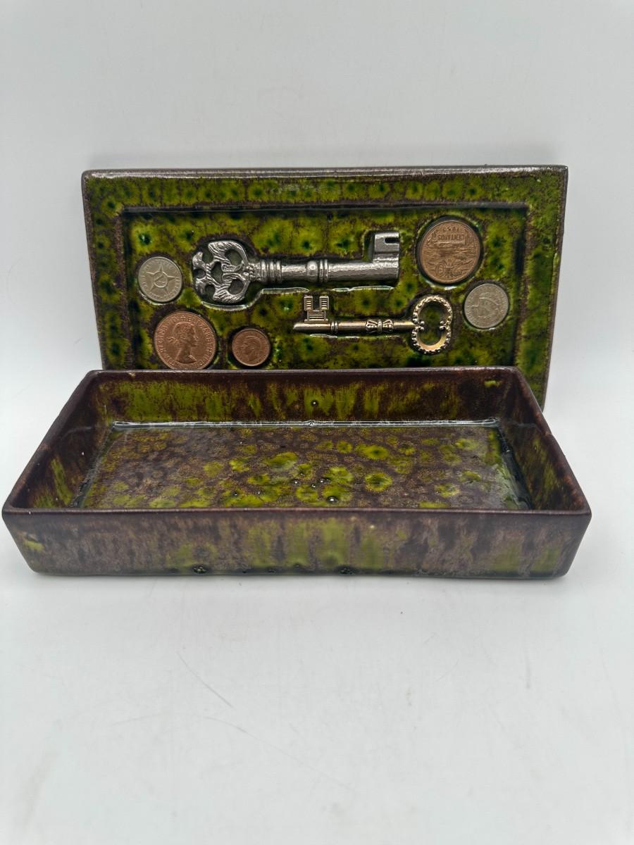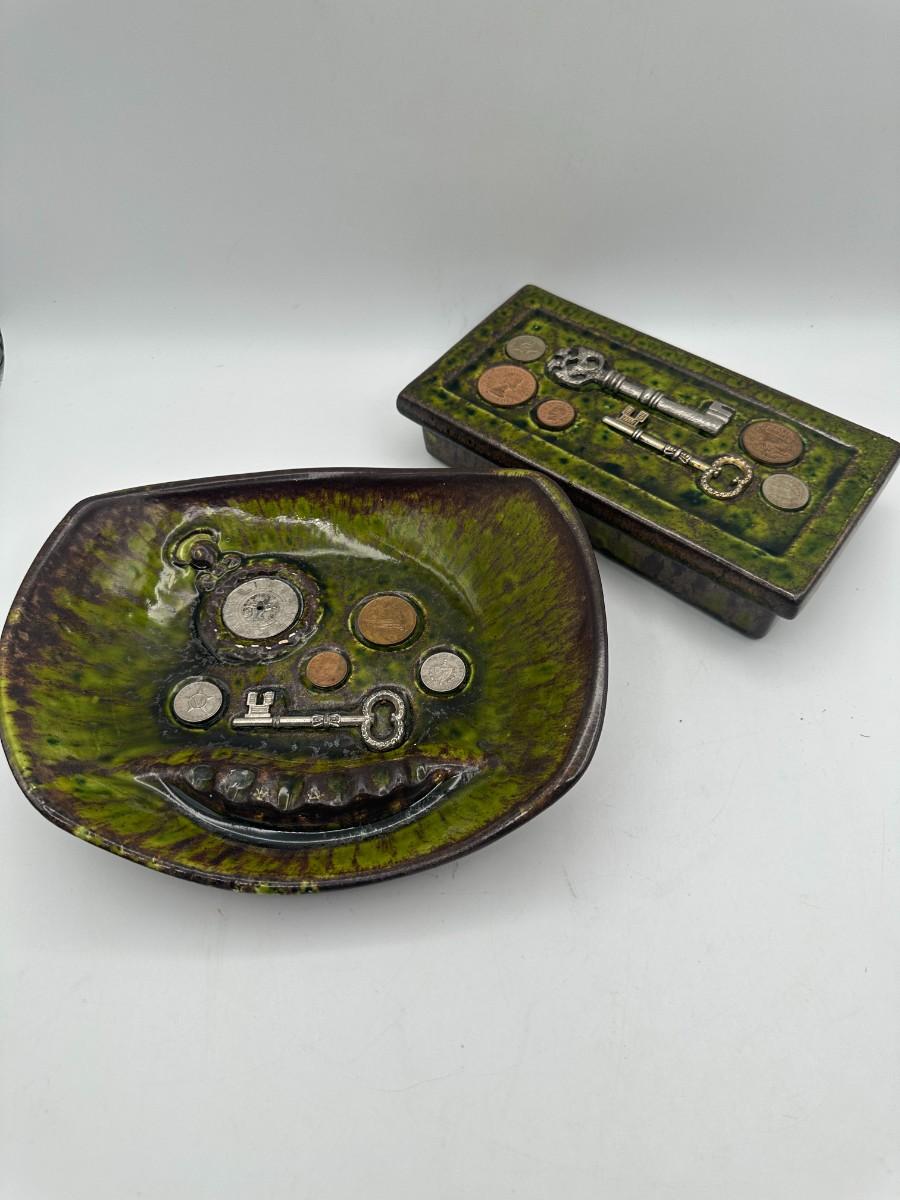 MCM Hayden Lewis Keys & Coins Glazed Pottery Ashtray & Cigarette Box