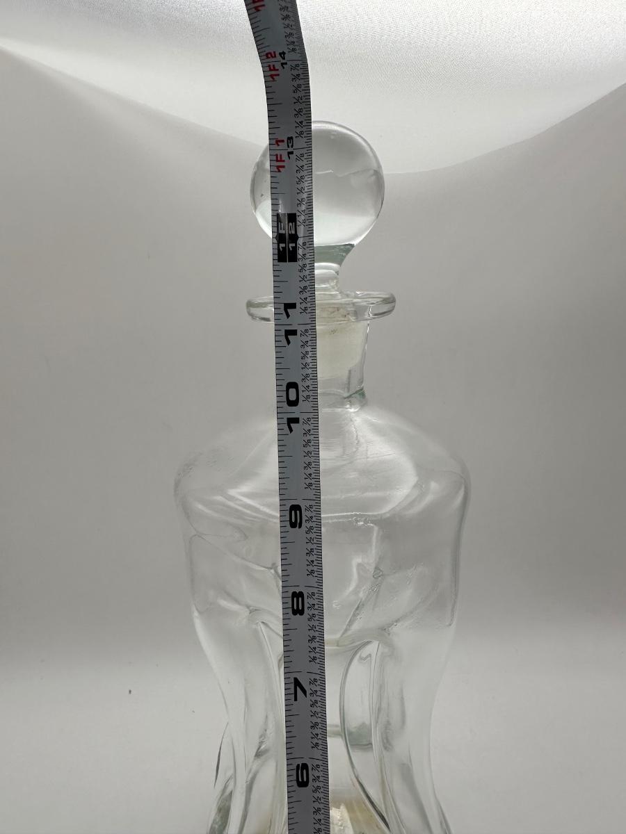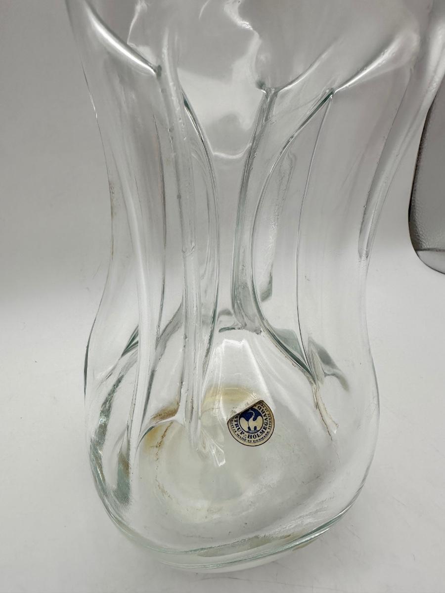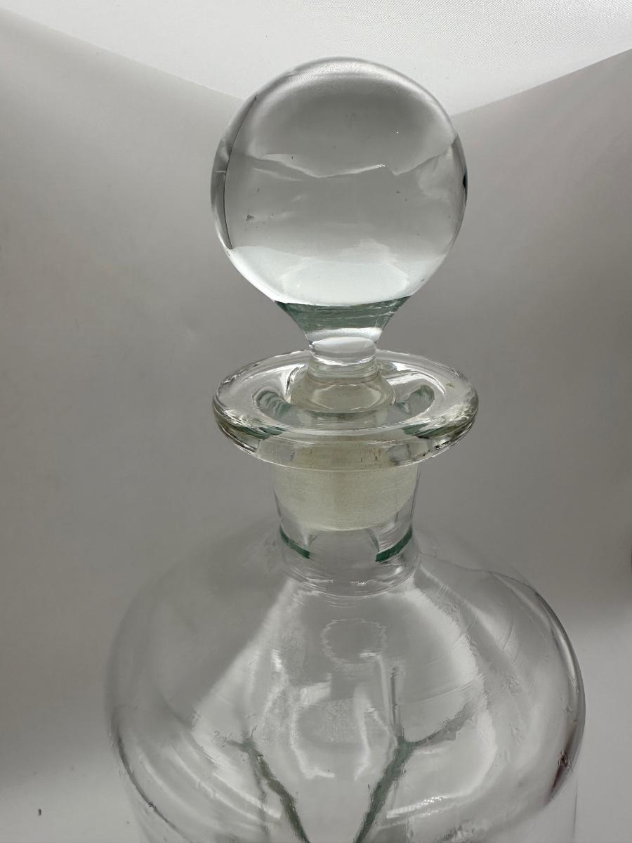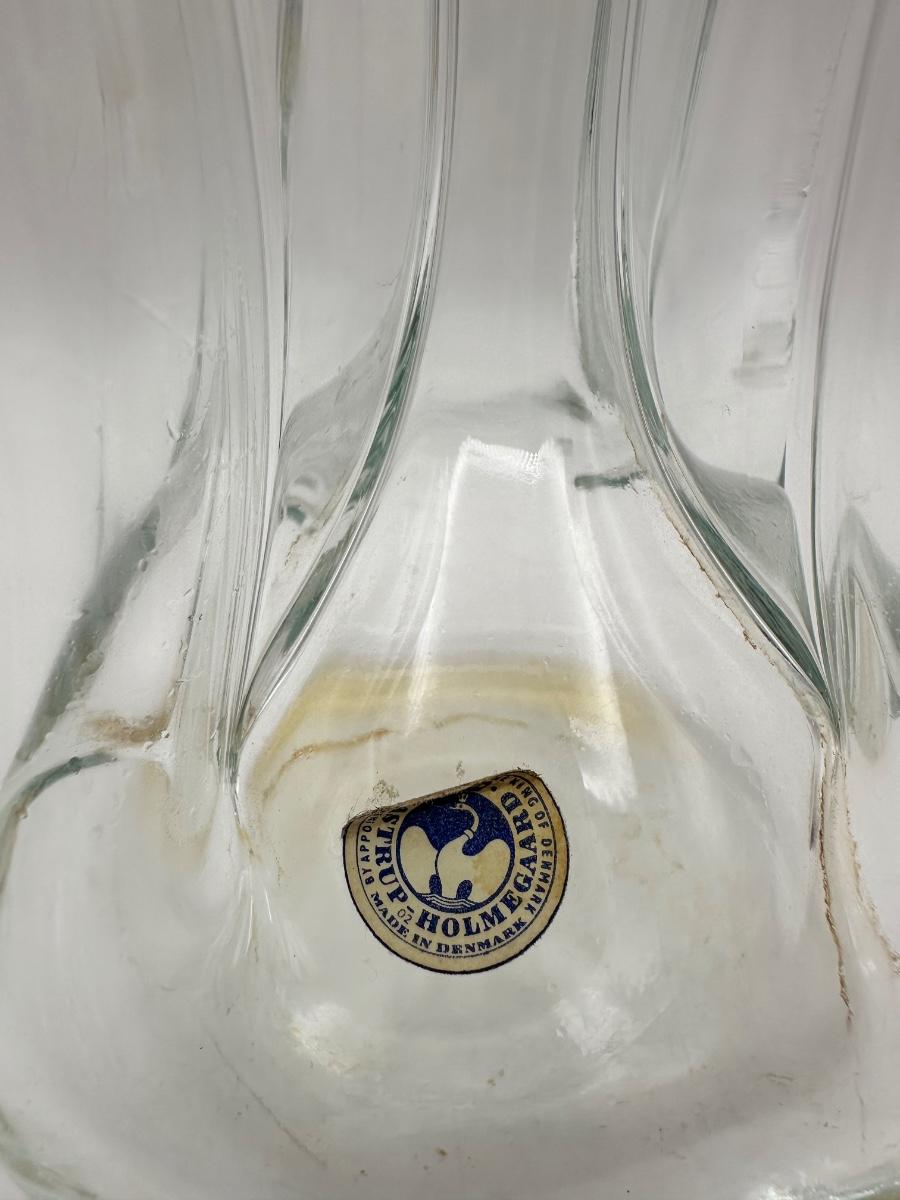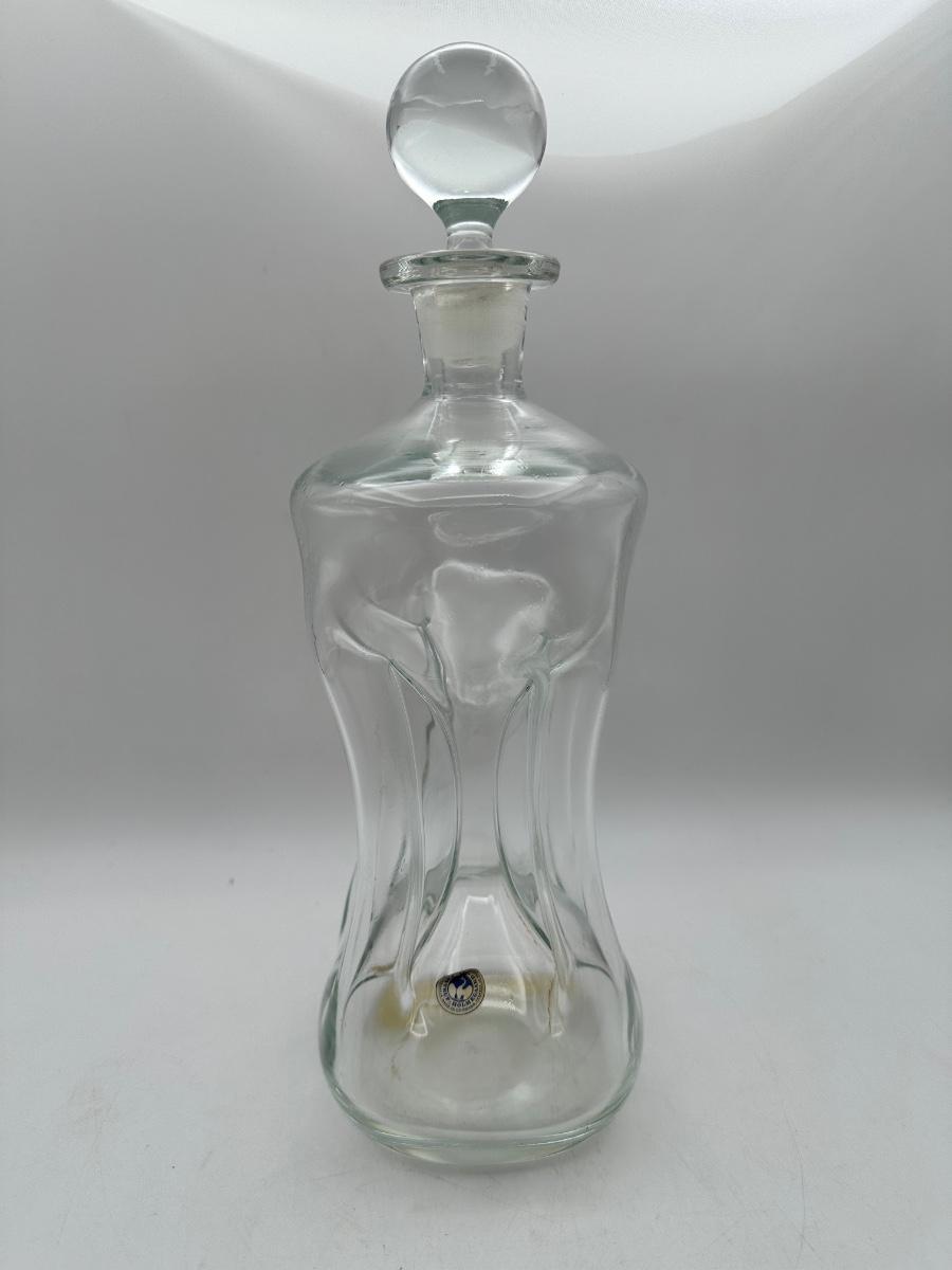 Also known as the “glug glug” bottle because of the distinctive sound it makes when liquid is poured from it. Designed by Jacob E Bang, Danish, pinched 3 column design, mouth-blown clear glass.