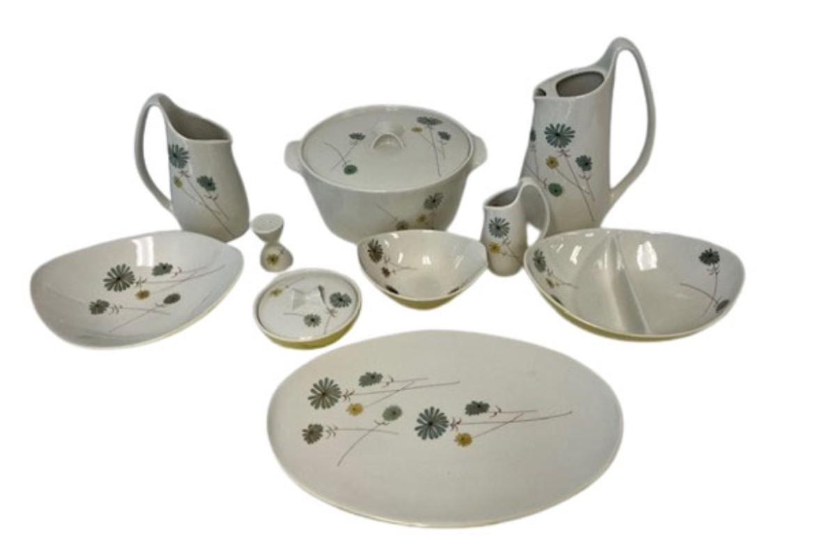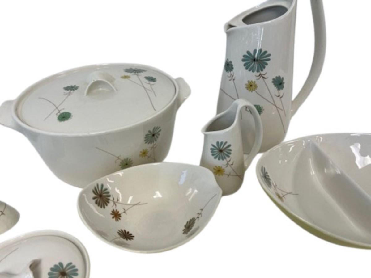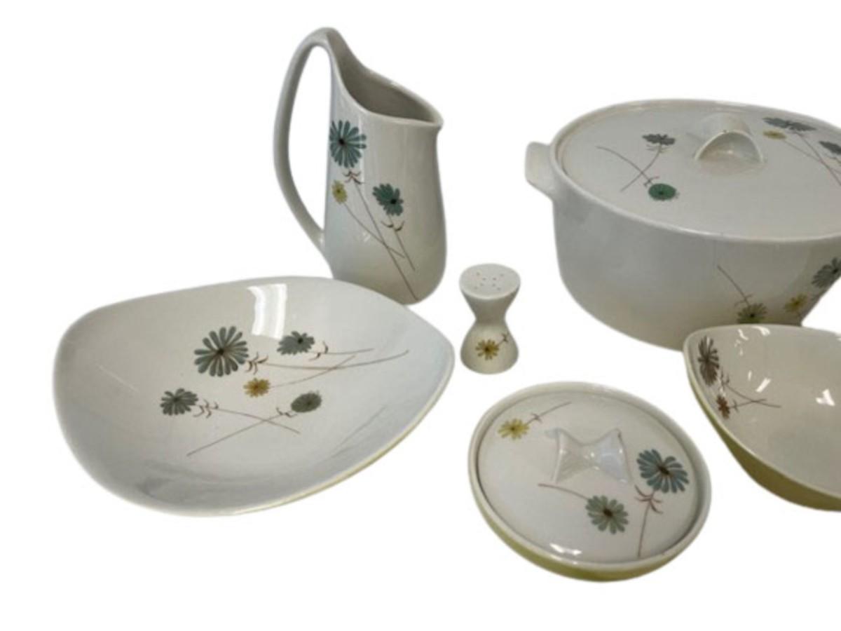 Includes a covered casserole, a divided serving bowl, a serving bowl, a platter, a creamer, a sugar bowl, a pitcher, and more. Total of 10 pieces. The lid on the sugar bowl is chipped (pictured). [EC]