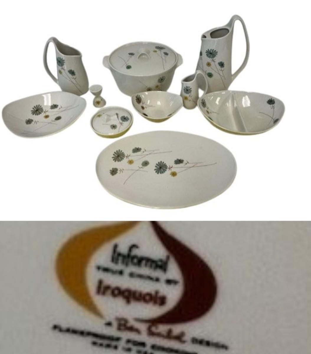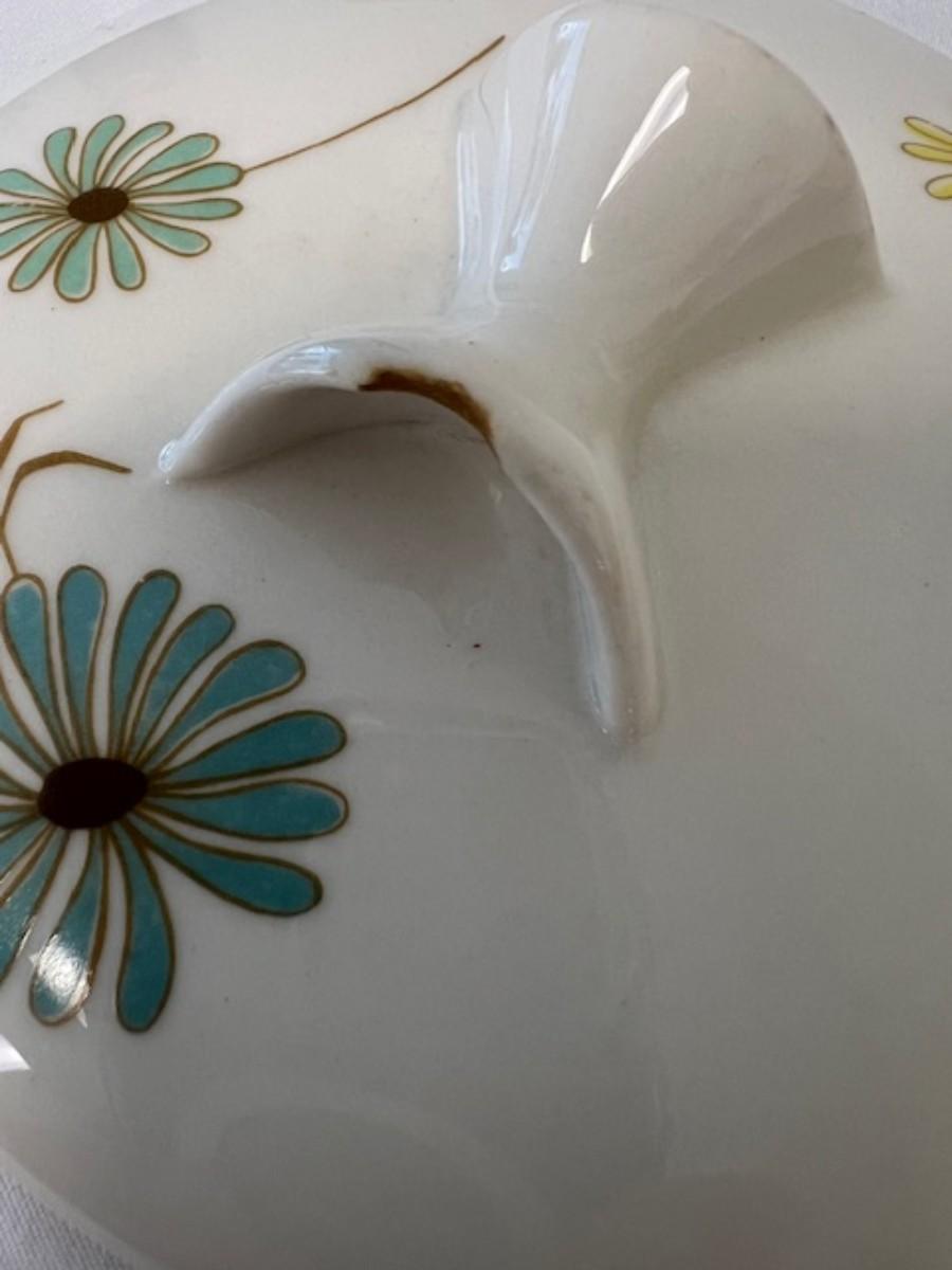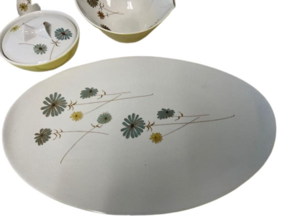 Includes a covered casserole, a divided serving bowl, a serving bowl, a platter, a creamer, a sugar bowl, a pitcher, and more. Total of 10 pieces. The lid on the sugar bowl is chipped (pictured). [EC]