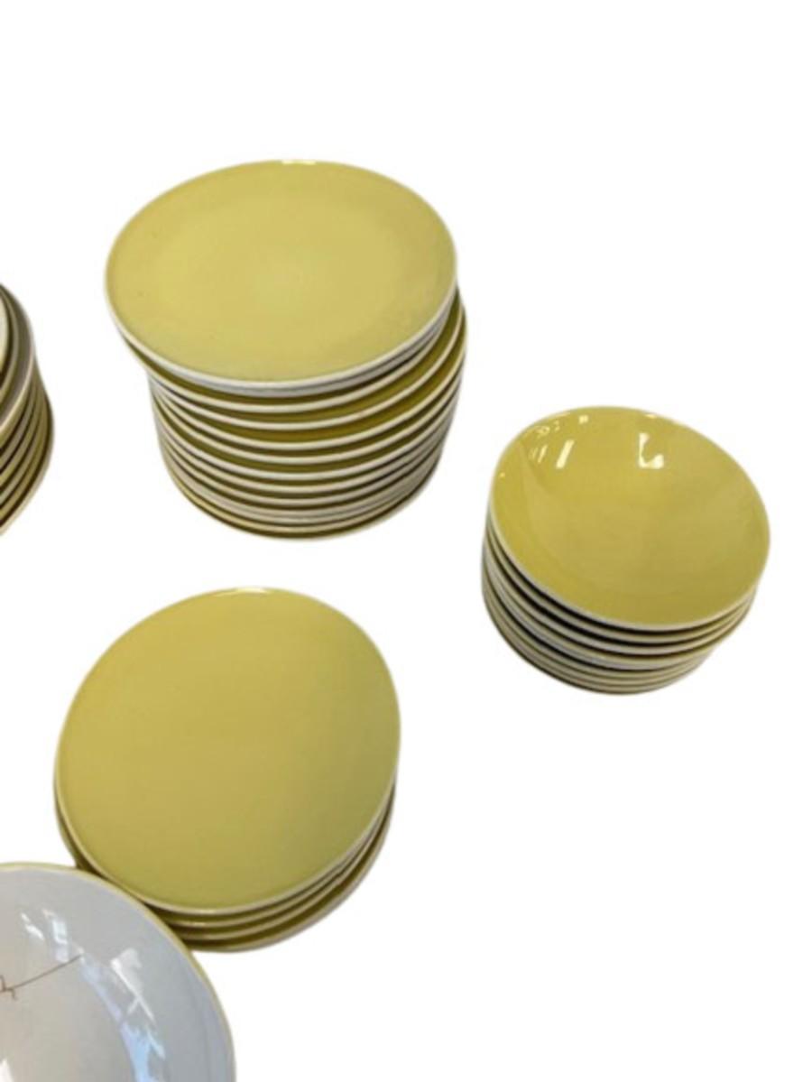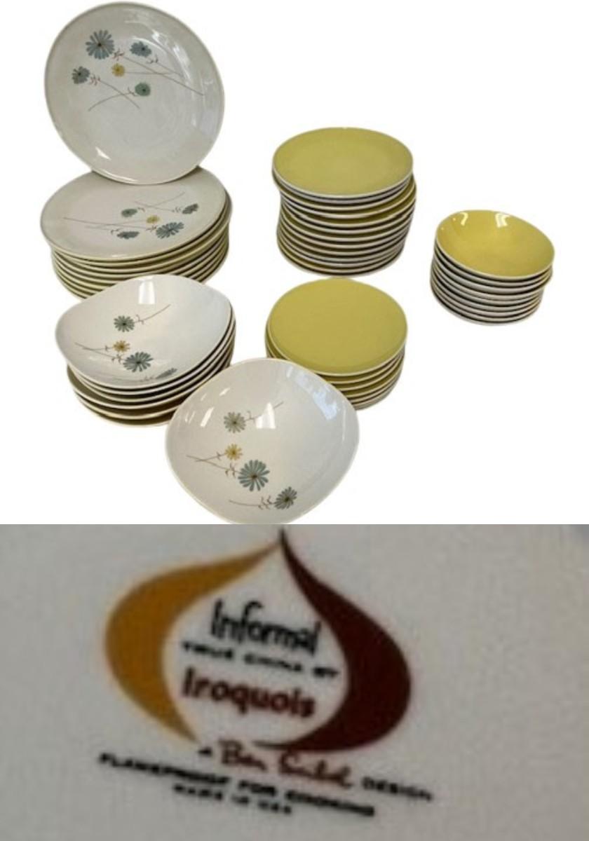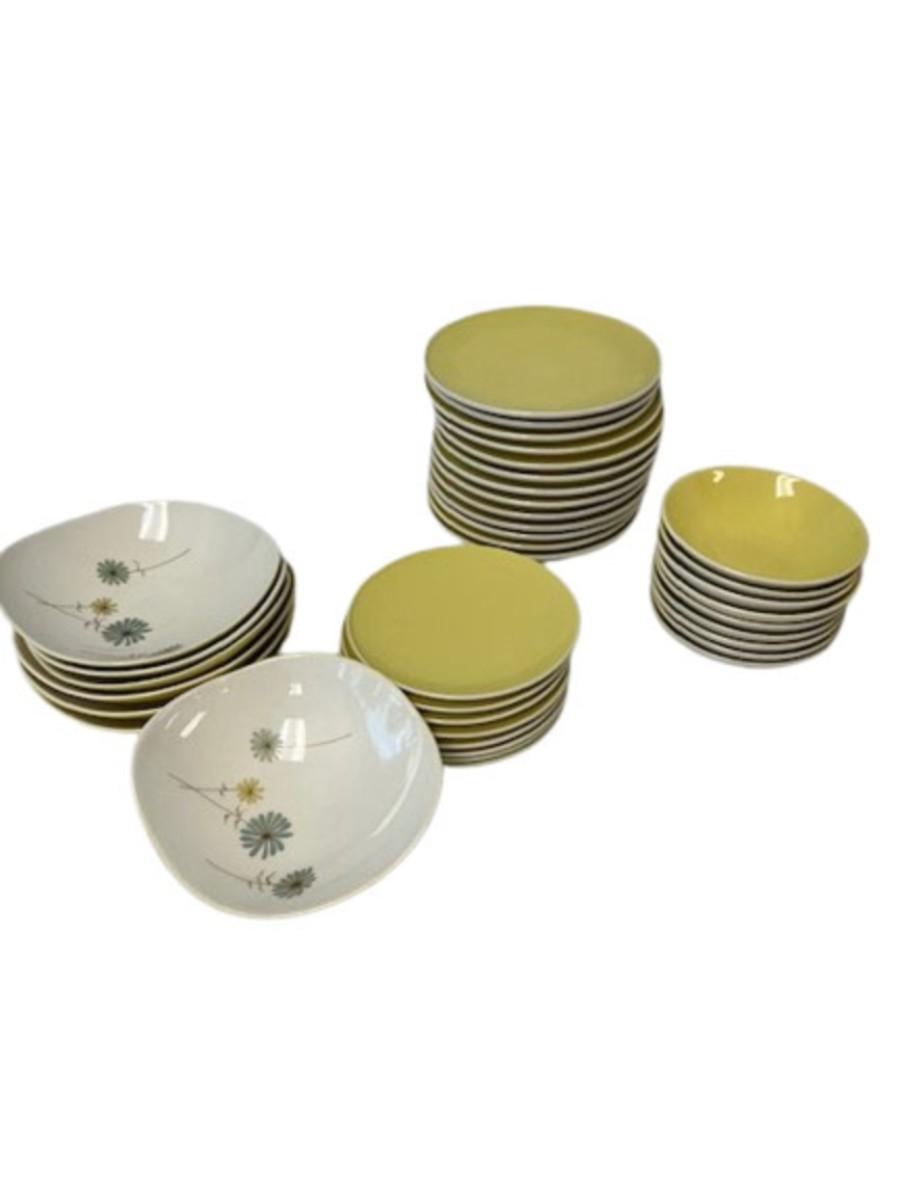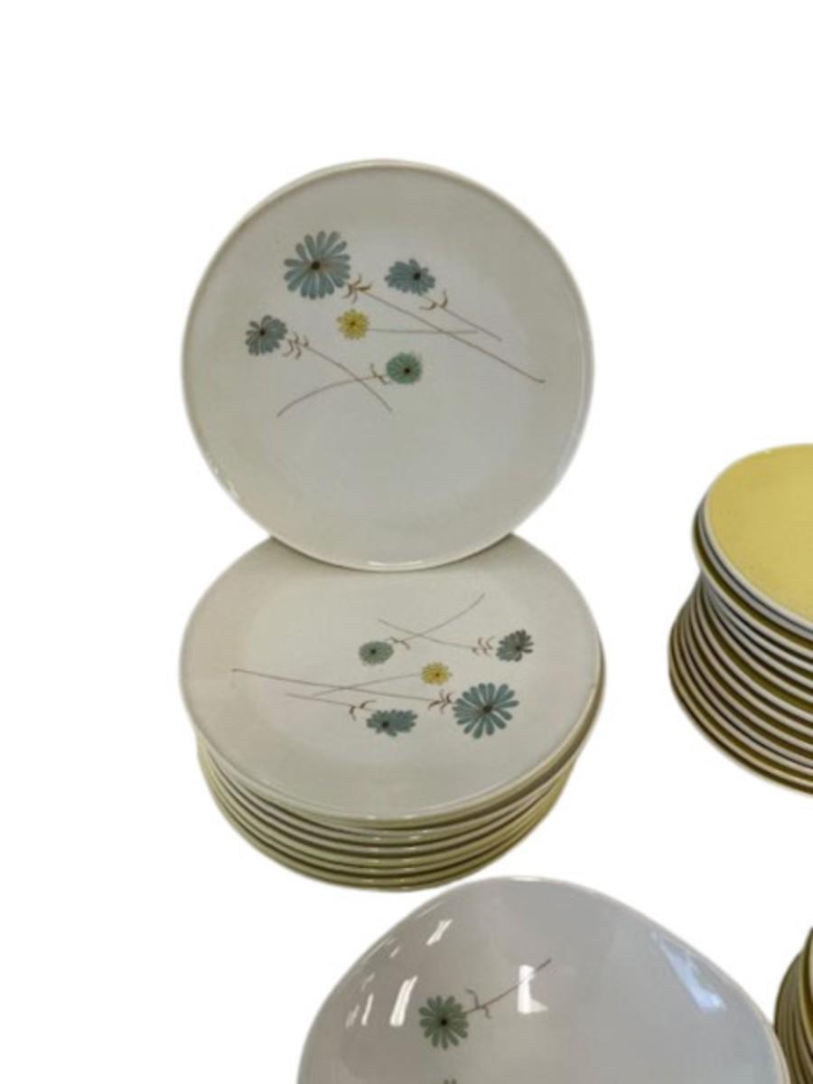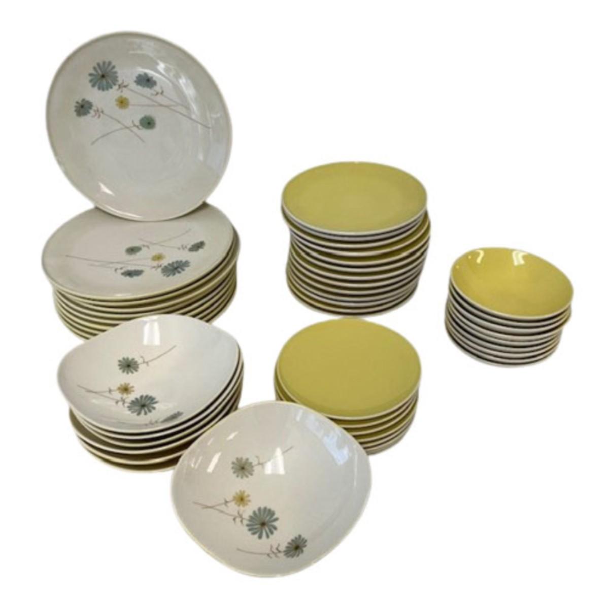 Includes 10 dinner plates, 13 salad plates, 9 bread plates, 6 soup bowls, and 9 fruit bowls. Total of 47 pieces. Three of the dinner plates have chips (pictured). [EC]