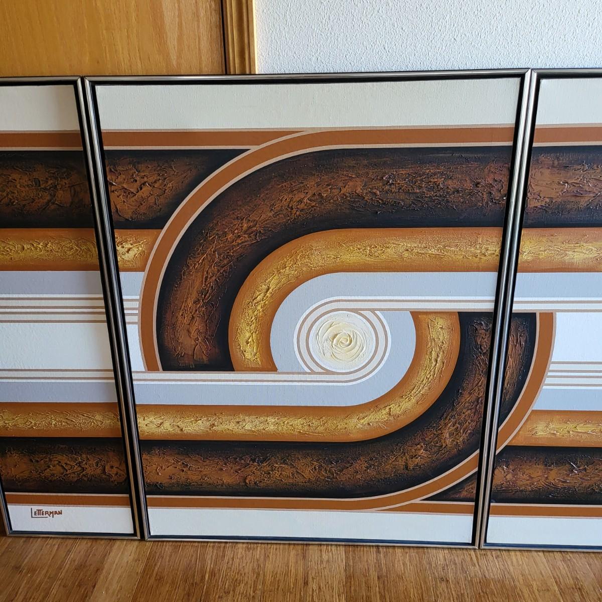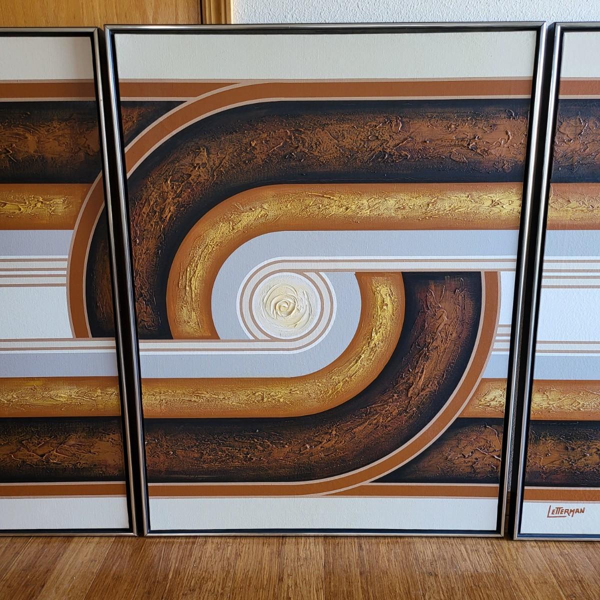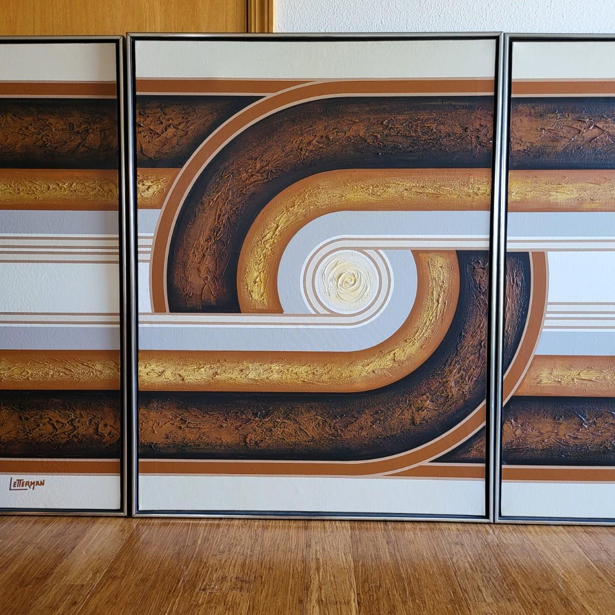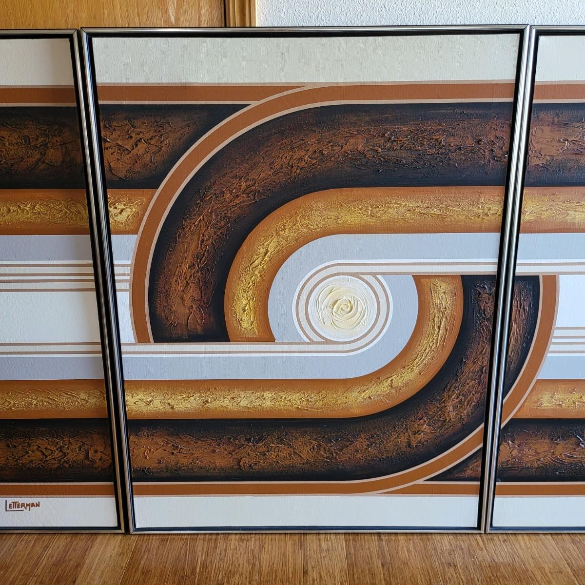 MCM abstract, Triptych textured painting on canvas - Three panel serigraph artwork (silk screening) - 1970s geometric design, signed Letterman. Measures 68” (with no spacing) wide x 42” tall.