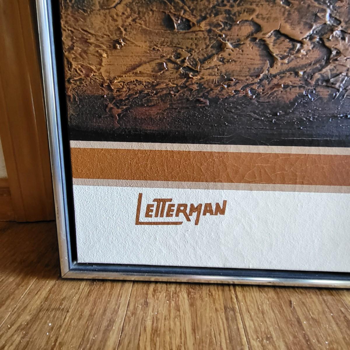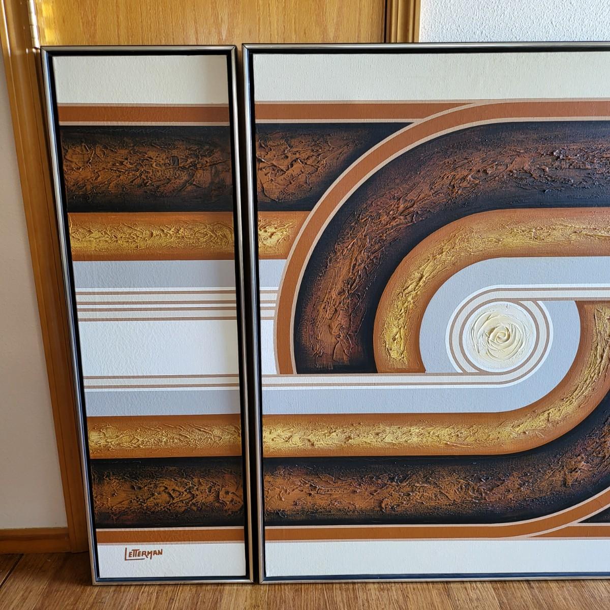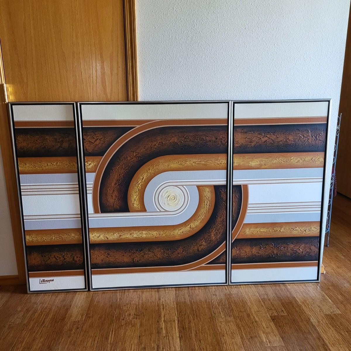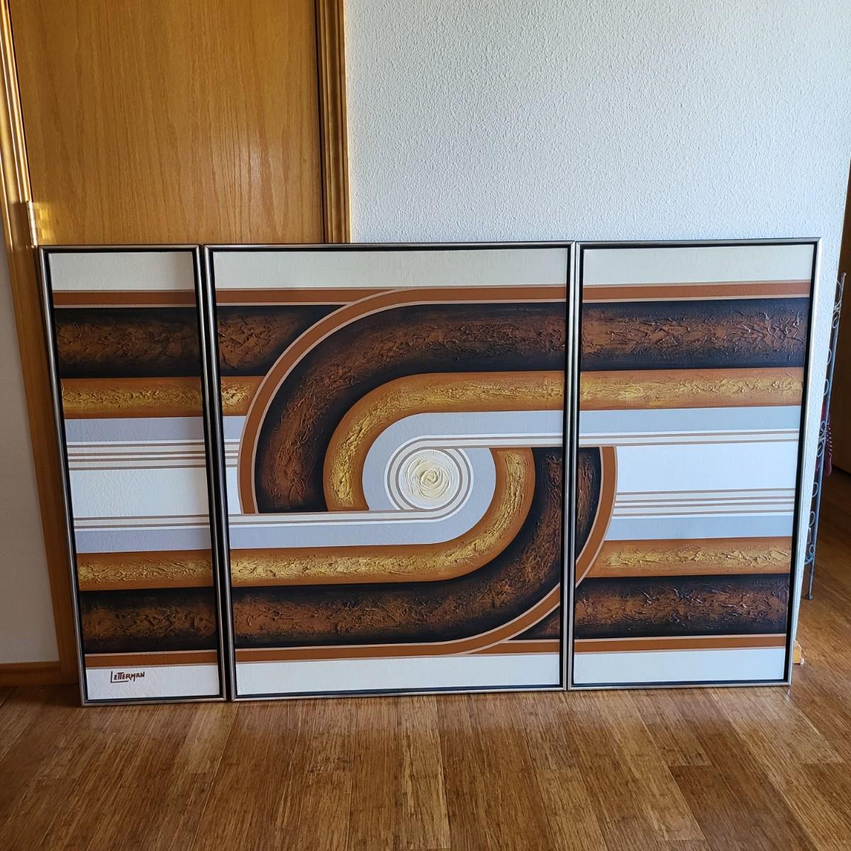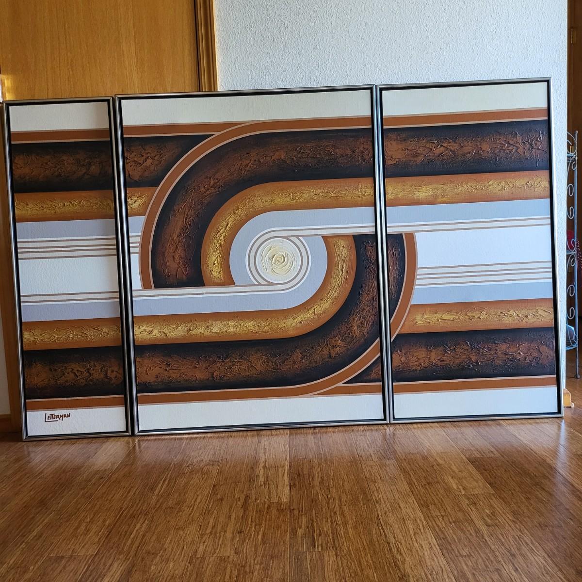 MCM abstract, Triptych textured painting on canvas - Three panel serigraph artwork (silk screening) - 1970s geometric design, signed Letterman. Measures 68” (with no spacing) wide x 42” tall.