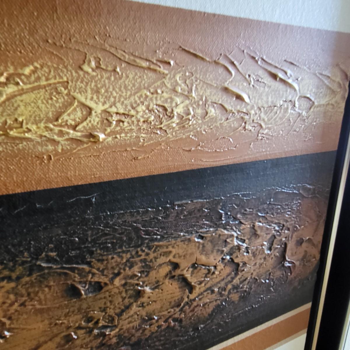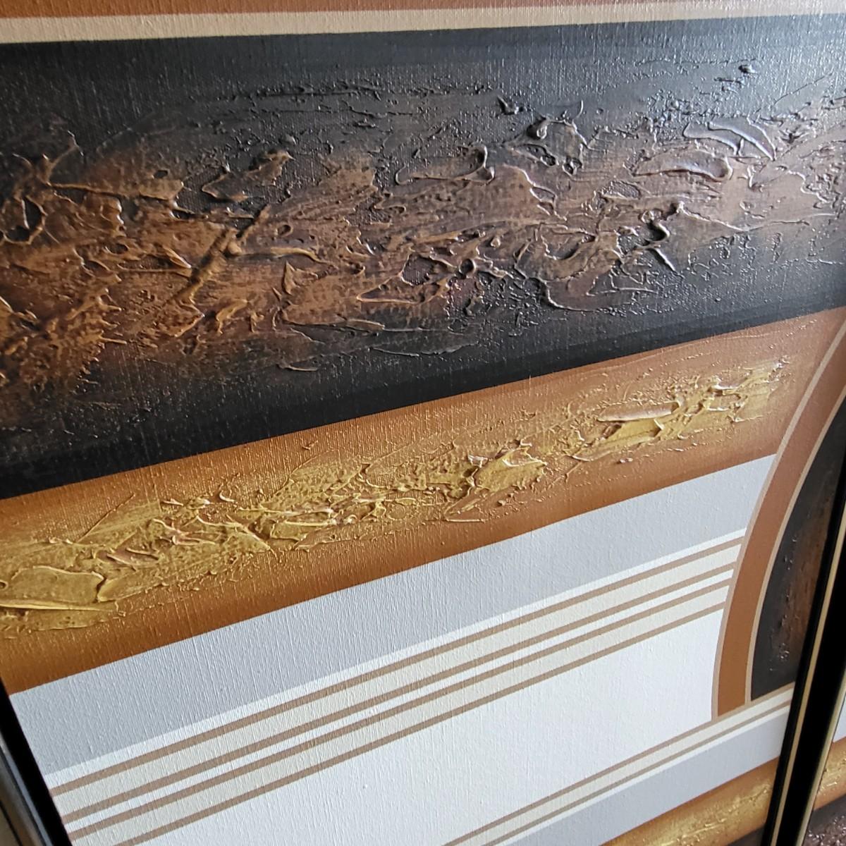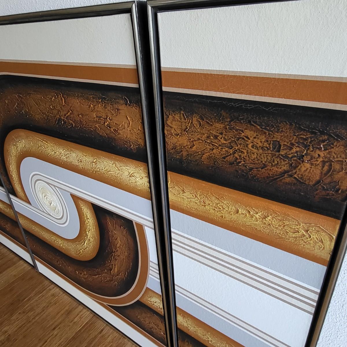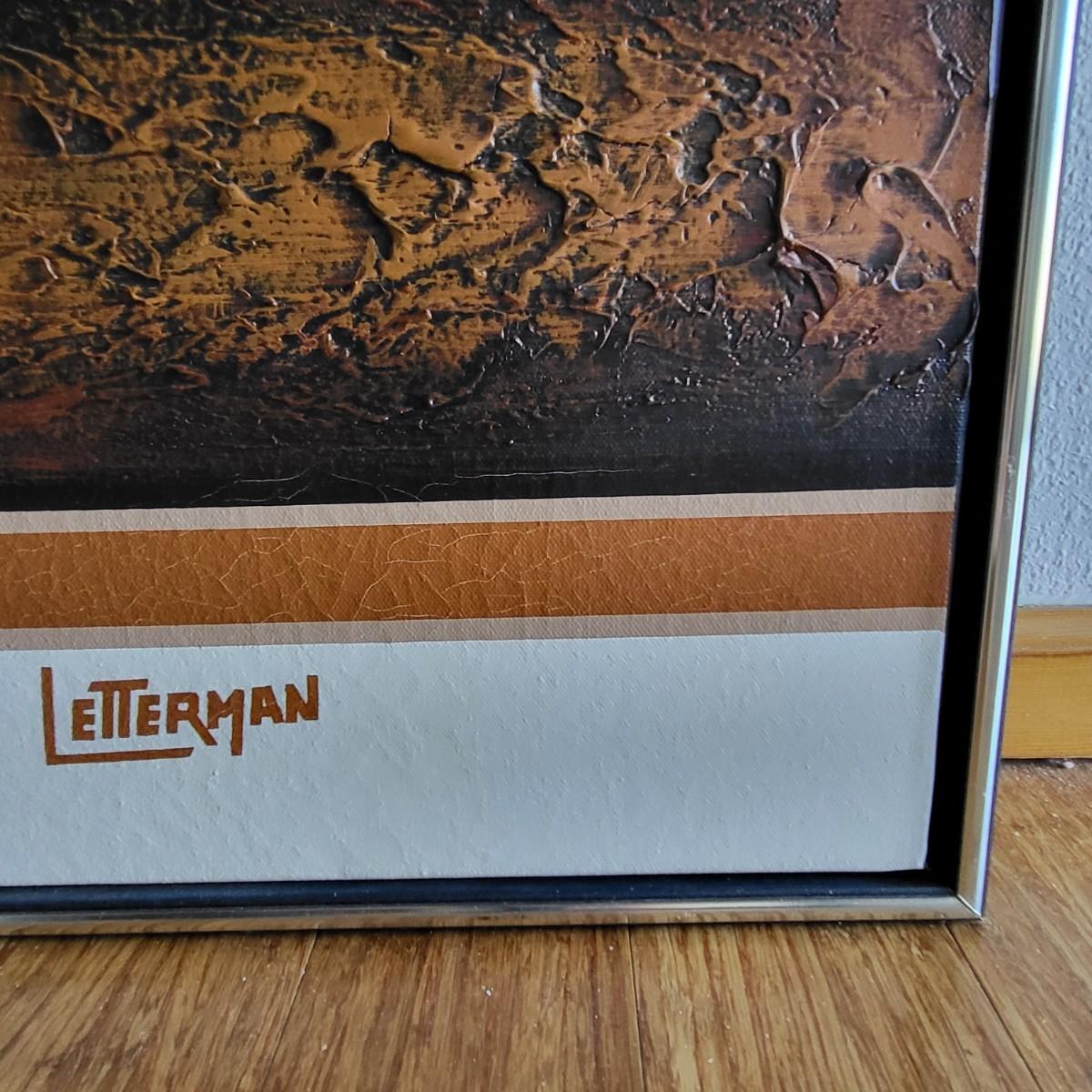 MCM abstract, Triptych textured painting on canvas - Three panel serigraph artwork (silk screening) - 1970s geometric design, signed Letterman. Measures 68” (with no spacing) wide x 42” tall.