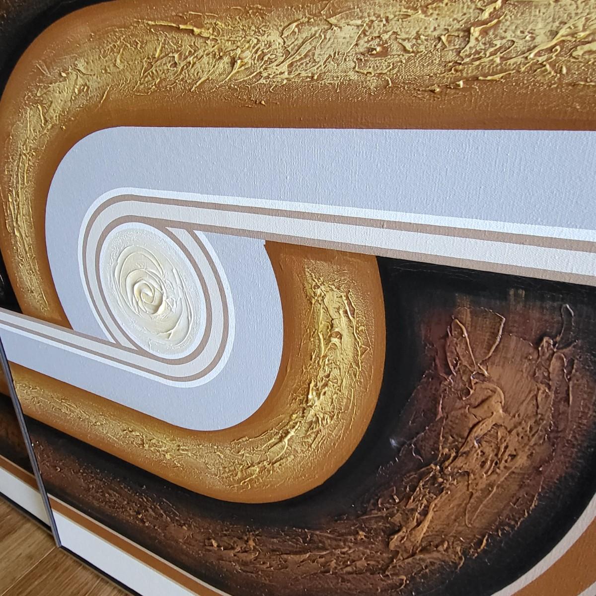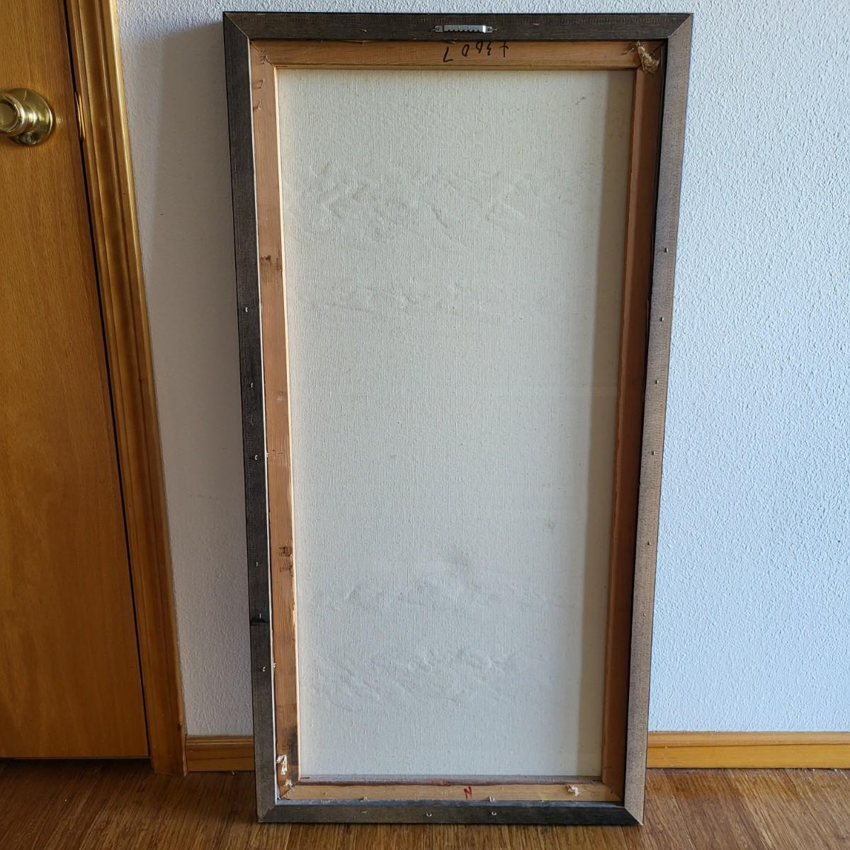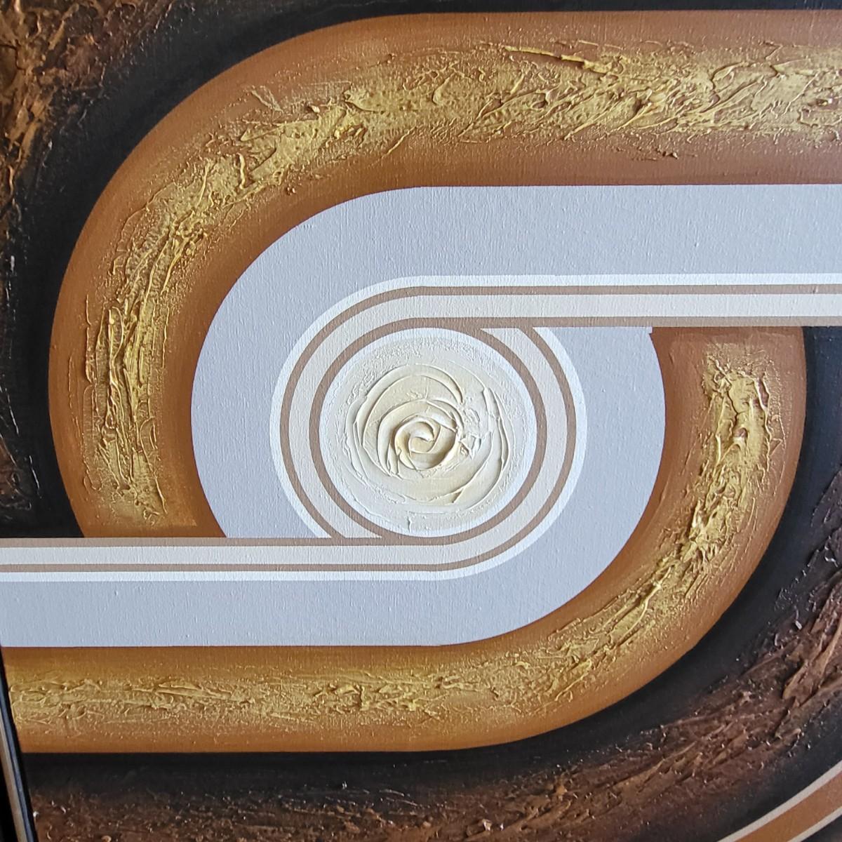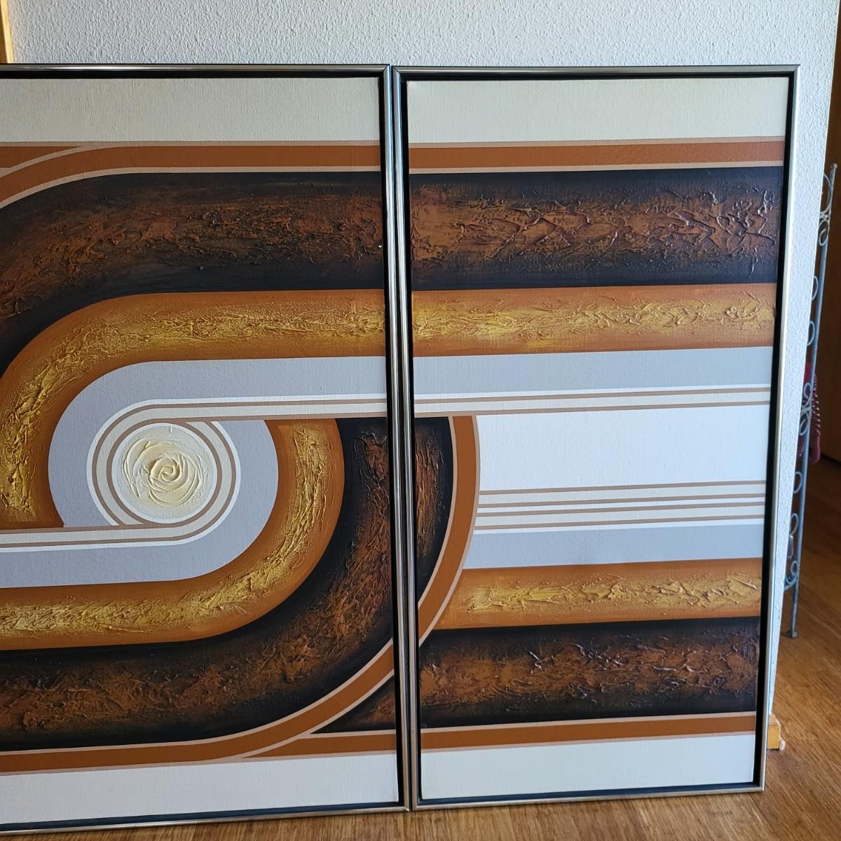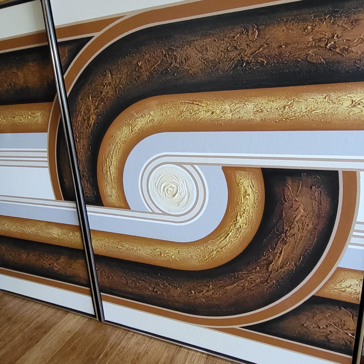 MCM abstract, Triptych textured painting on canvas - Three panel serigraph artwork (silk screening) - 1970s geometric design, signed Letterman. Measures 68” (with no spacing) wide x 42” tall.