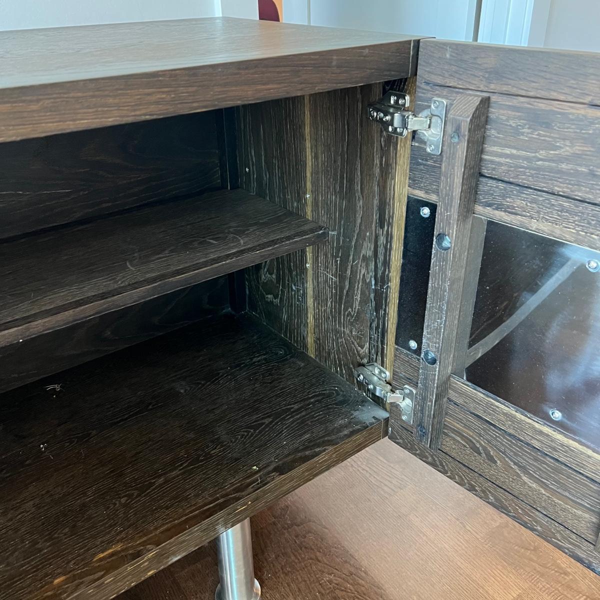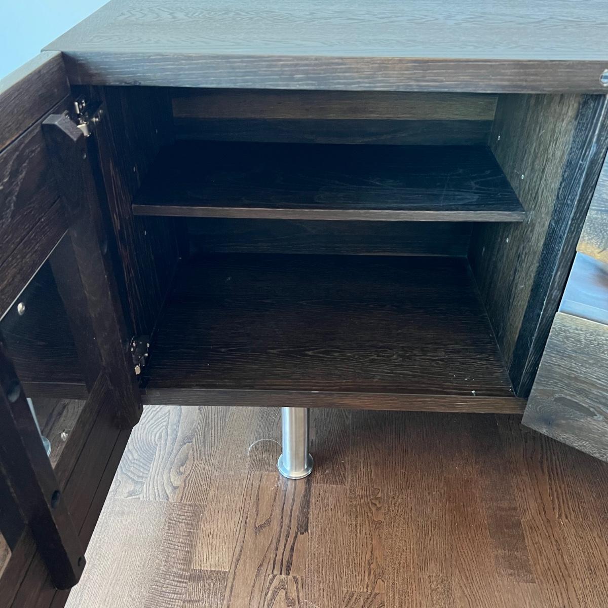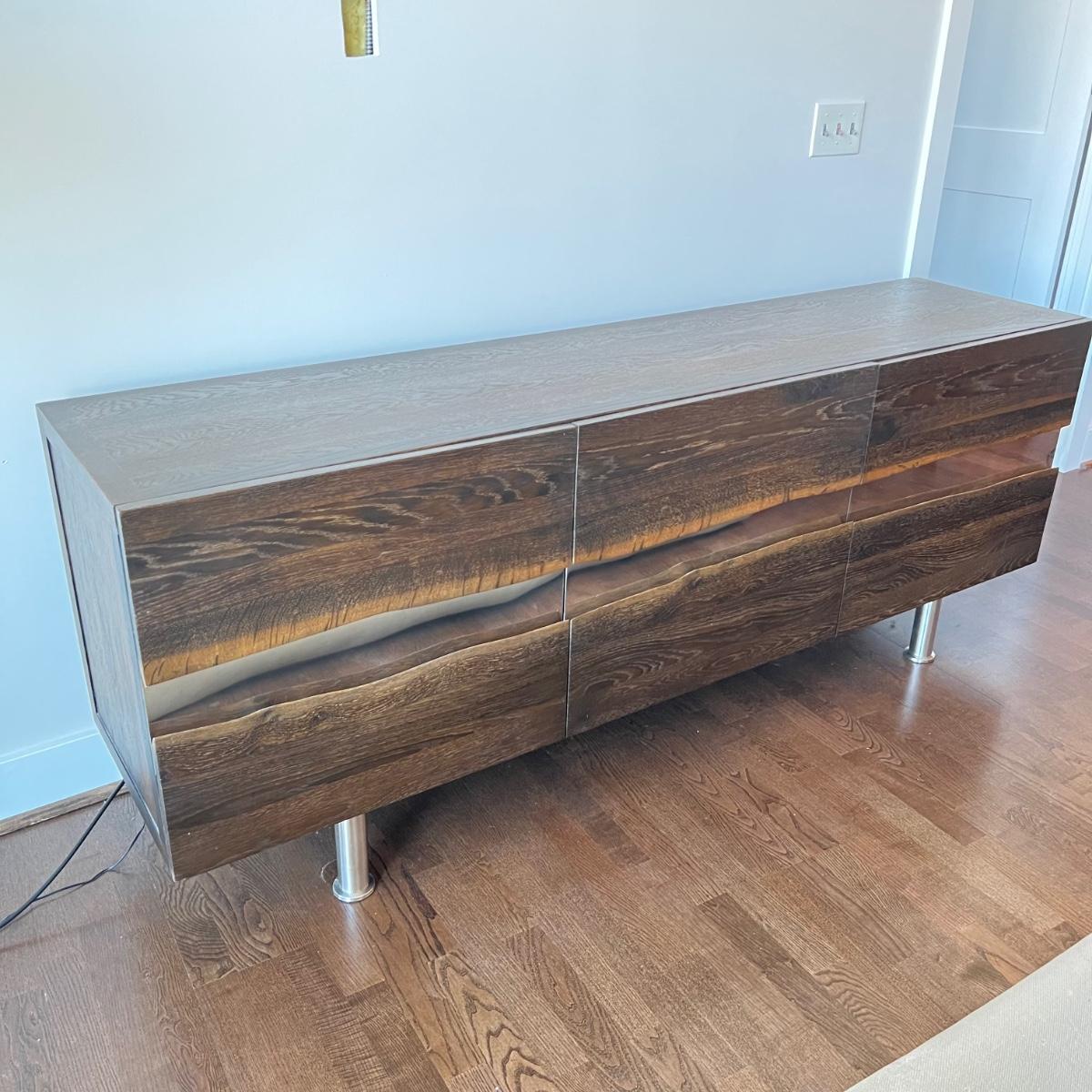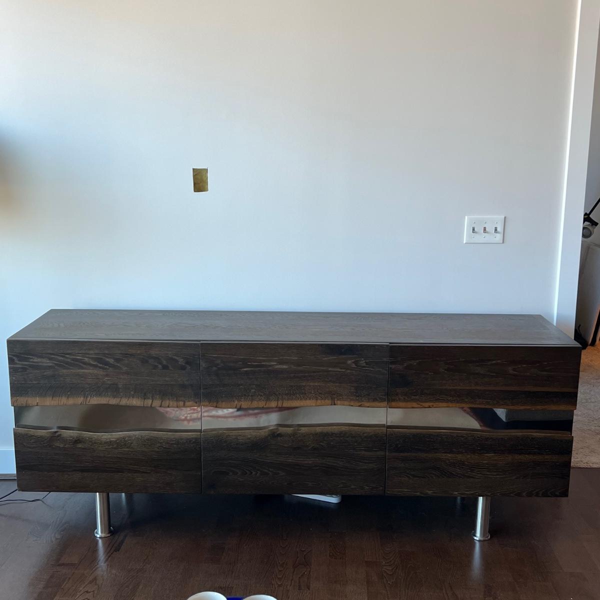 This MCM inspired wood cabinet is most likely raw oak with live edges running across the front that also has an undulating strip of highly polished stainless steel (so highly polished it looks like a mirror and like a mirror shows reflections which couldn’t be avoided in photos). Measuring 79” wide x 18.5” deep x 30” high, it offers plenty of storage space inside two cabinets with one fixed shelf in each. This modern piece sits on industrial style polished steel legs.