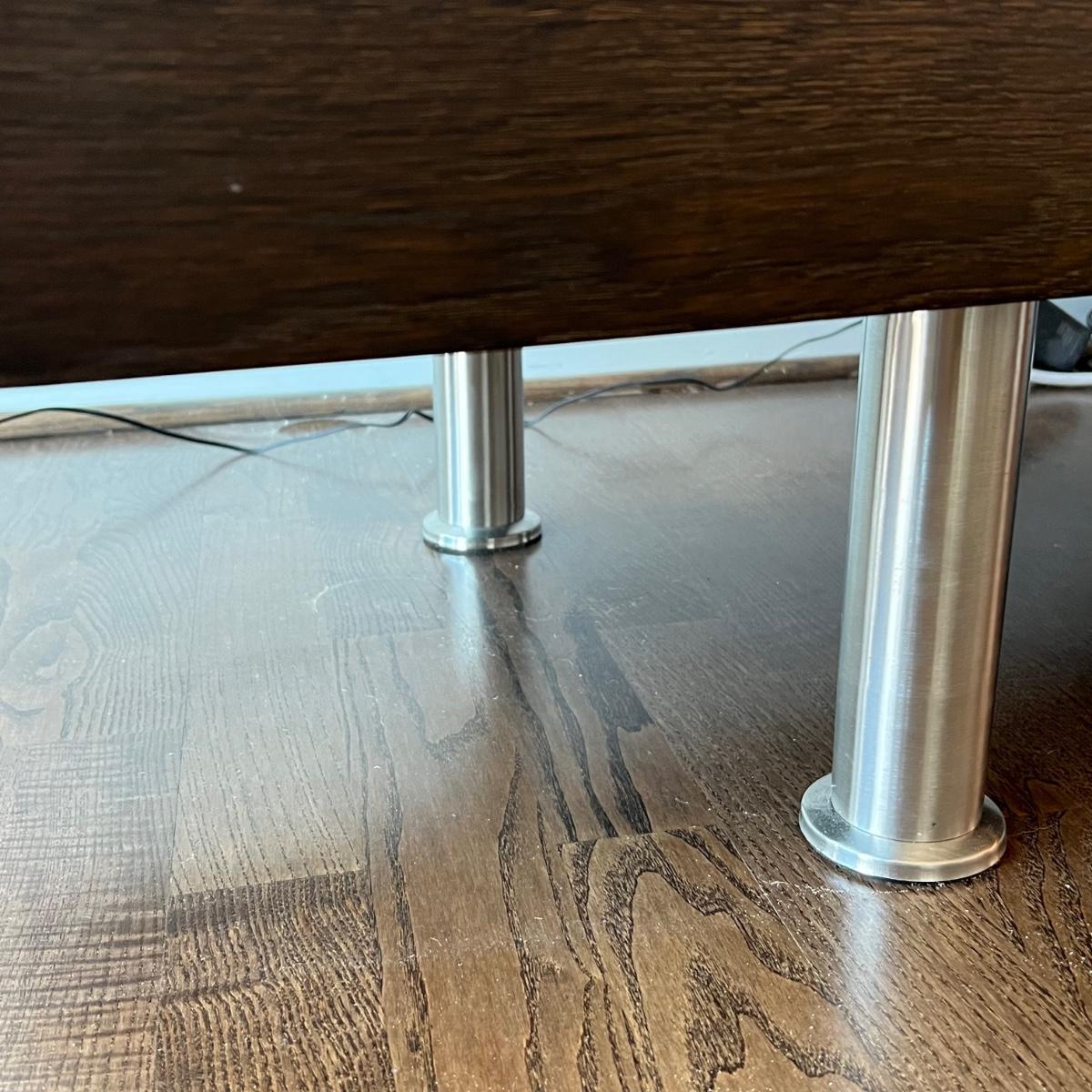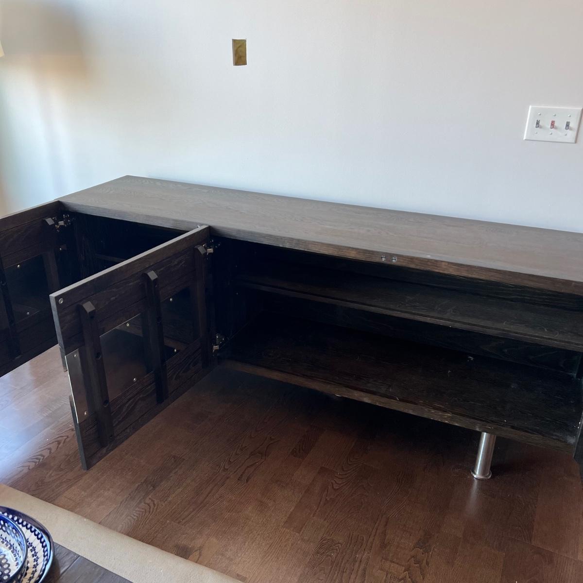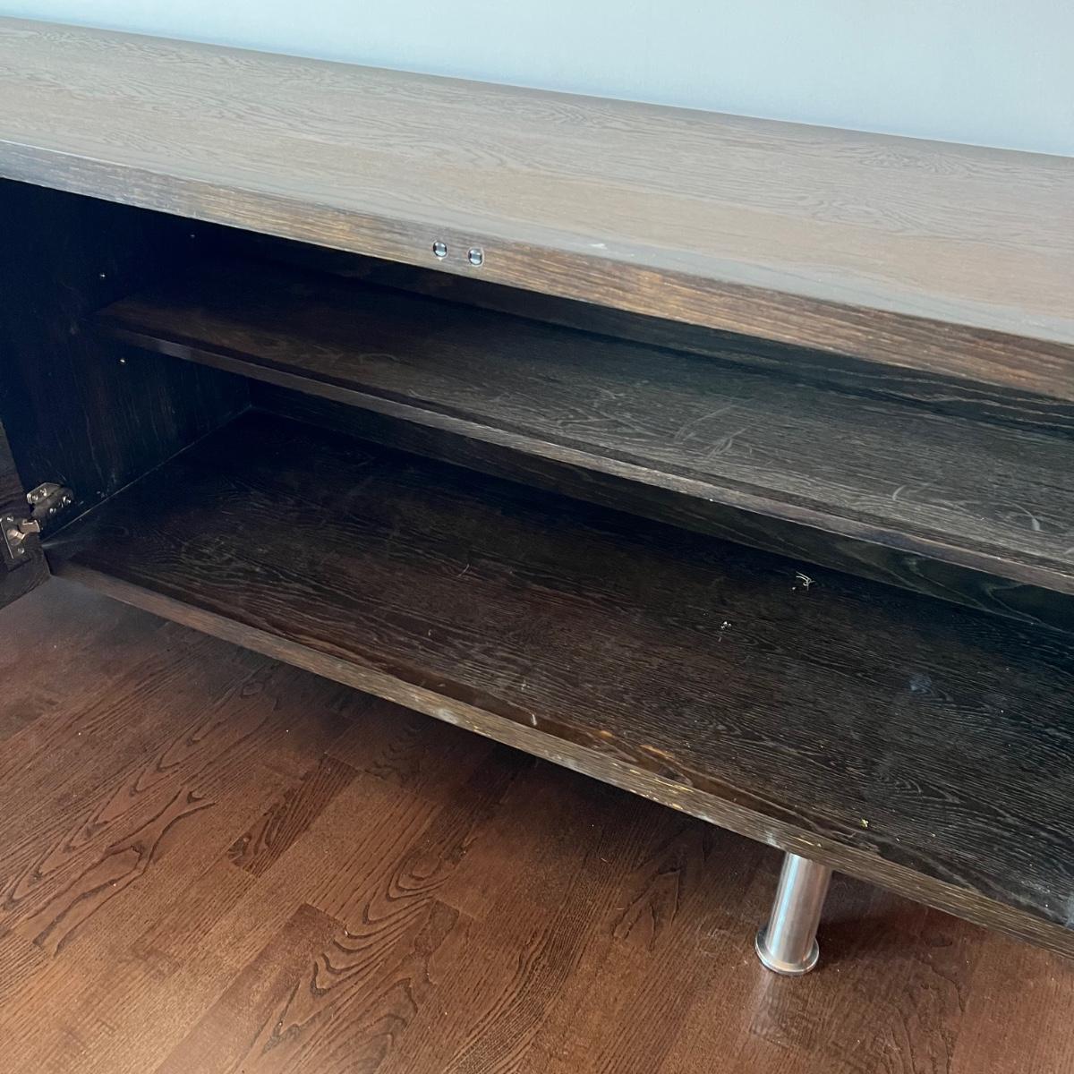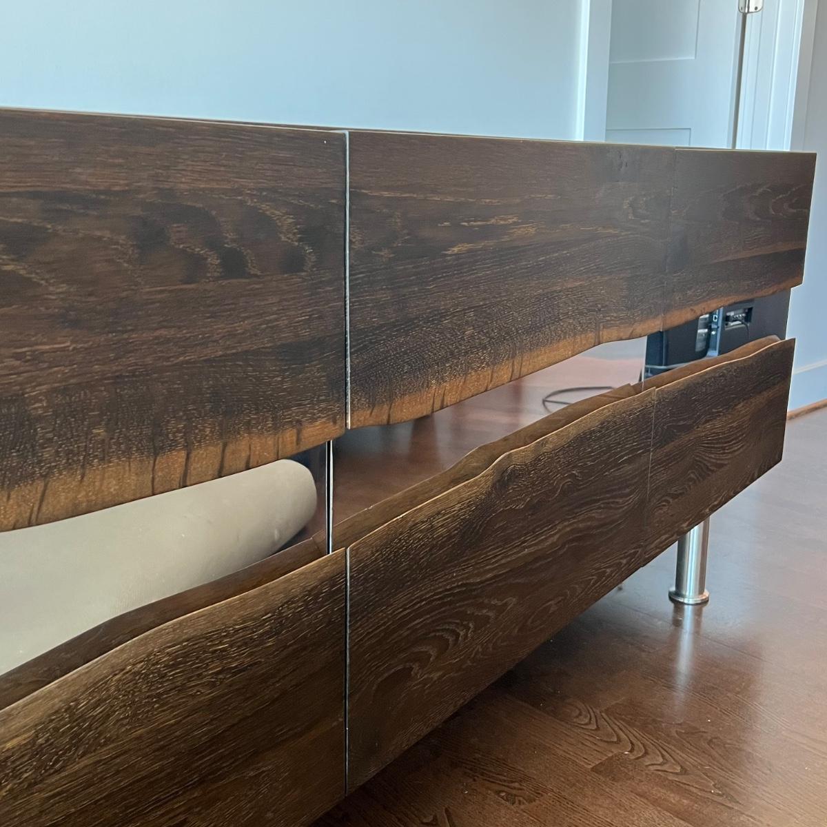 This MCM inspired wood cabinet is most likely raw oak with live edges running across the front that also has an undulating strip of highly polished stainless steel (so highly polished it looks like a mirror and like a mirror shows reflections which couldn’t be avoided in photos). Measuring 79” wide x 18.5” deep x 30” high, it offers plenty of storage space inside two cabinets with one fixed shelf in each. This modern piece sits on industrial style polished steel legs.
