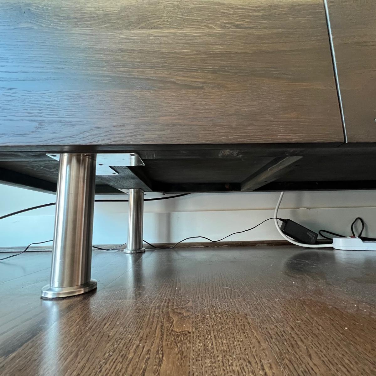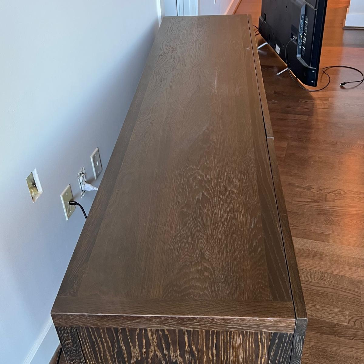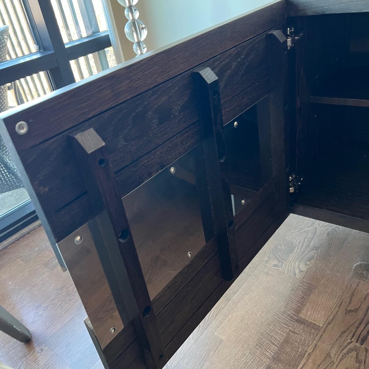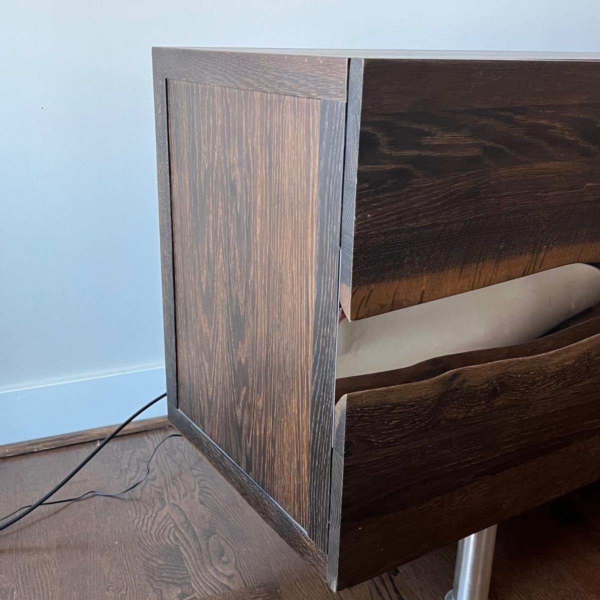 This MCM inspired wood cabinet is most likely raw oak with live edges running across the front that also has an undulating strip of highly polished stainless steel (so highly polished it looks like a mirror and like a mirror shows reflections which couldn’t be avoided in photos). Measuring 79” wide x 18.5” deep x 30” high, it offers plenty of storage space inside two cabinets with one fixed shelf in each. This modern piece sits on industrial style polished steel legs.