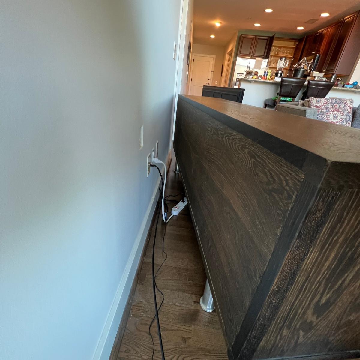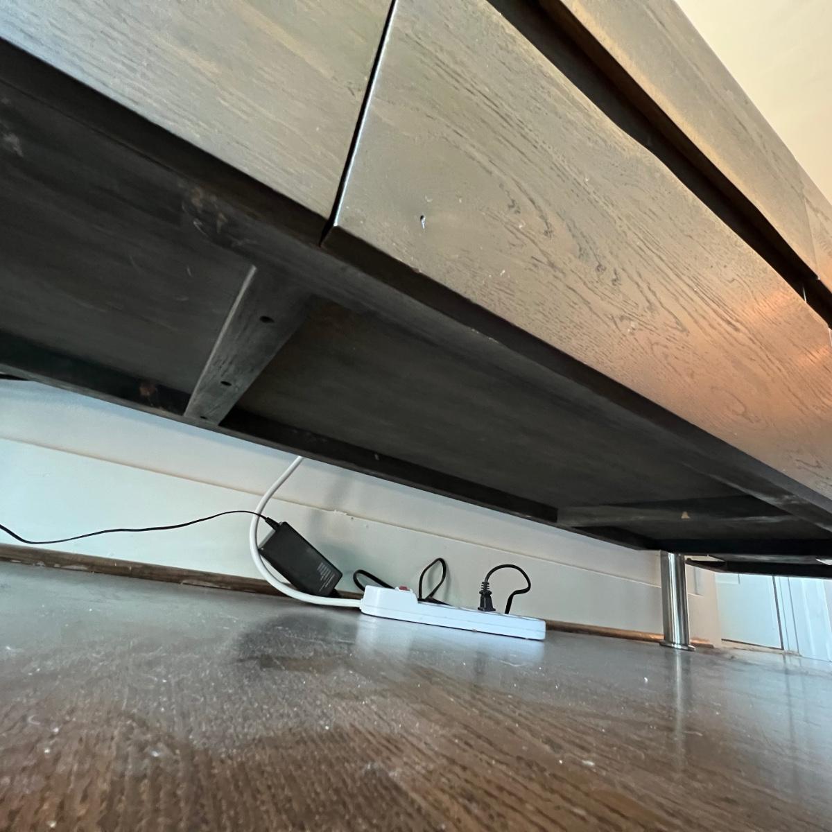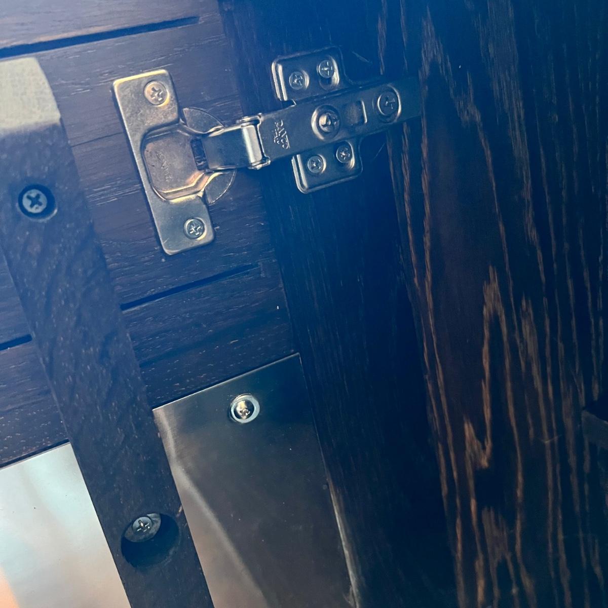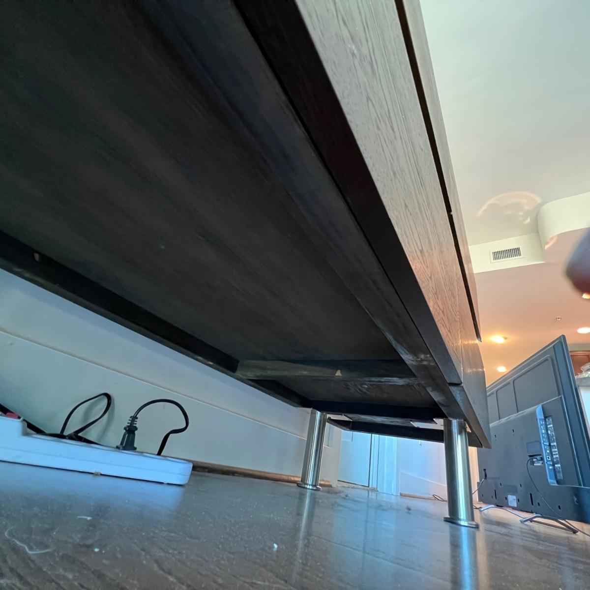 This MCM inspired wood cabinet is most likely raw oak with live edges running across the front that also has an undulating strip of highly polished stainless steel (so highly polished it looks like a mirror and like a mirror shows reflections which couldn’t be avoided in photos). Measuring 79” wide x 18.5” deep x 30” high, it offers plenty of storage space inside two cabinets with one fixed shelf in each. This modern piece sits on industrial style polished steel legs.