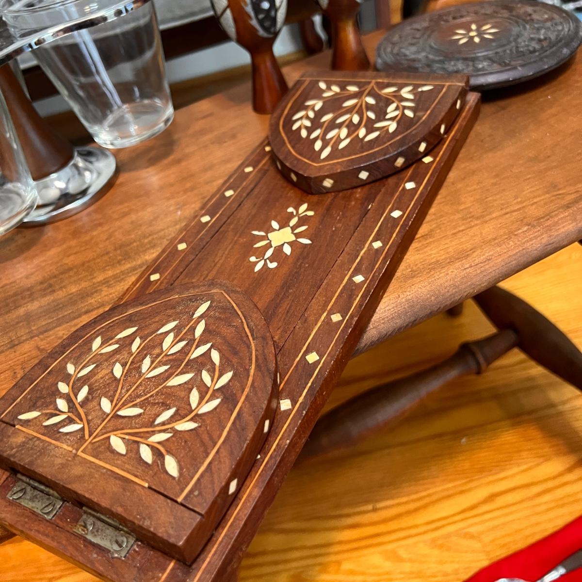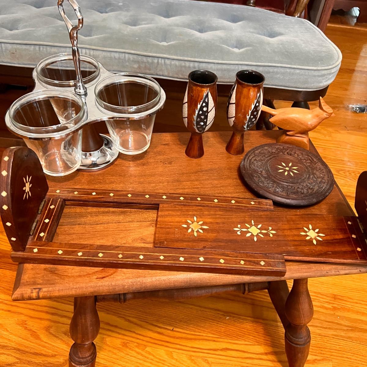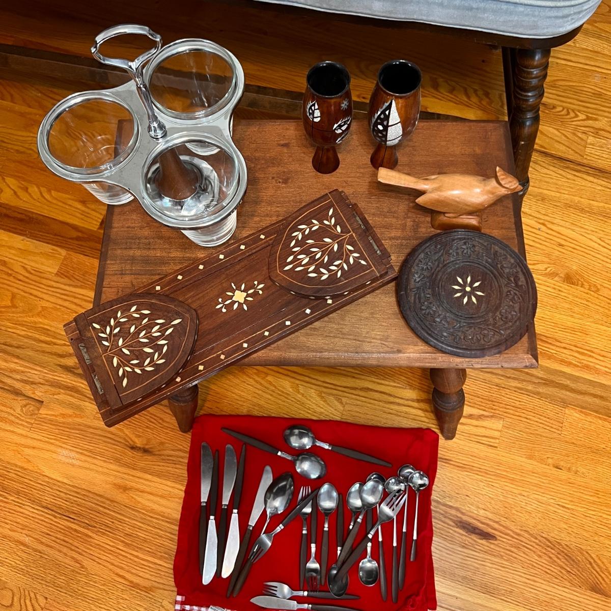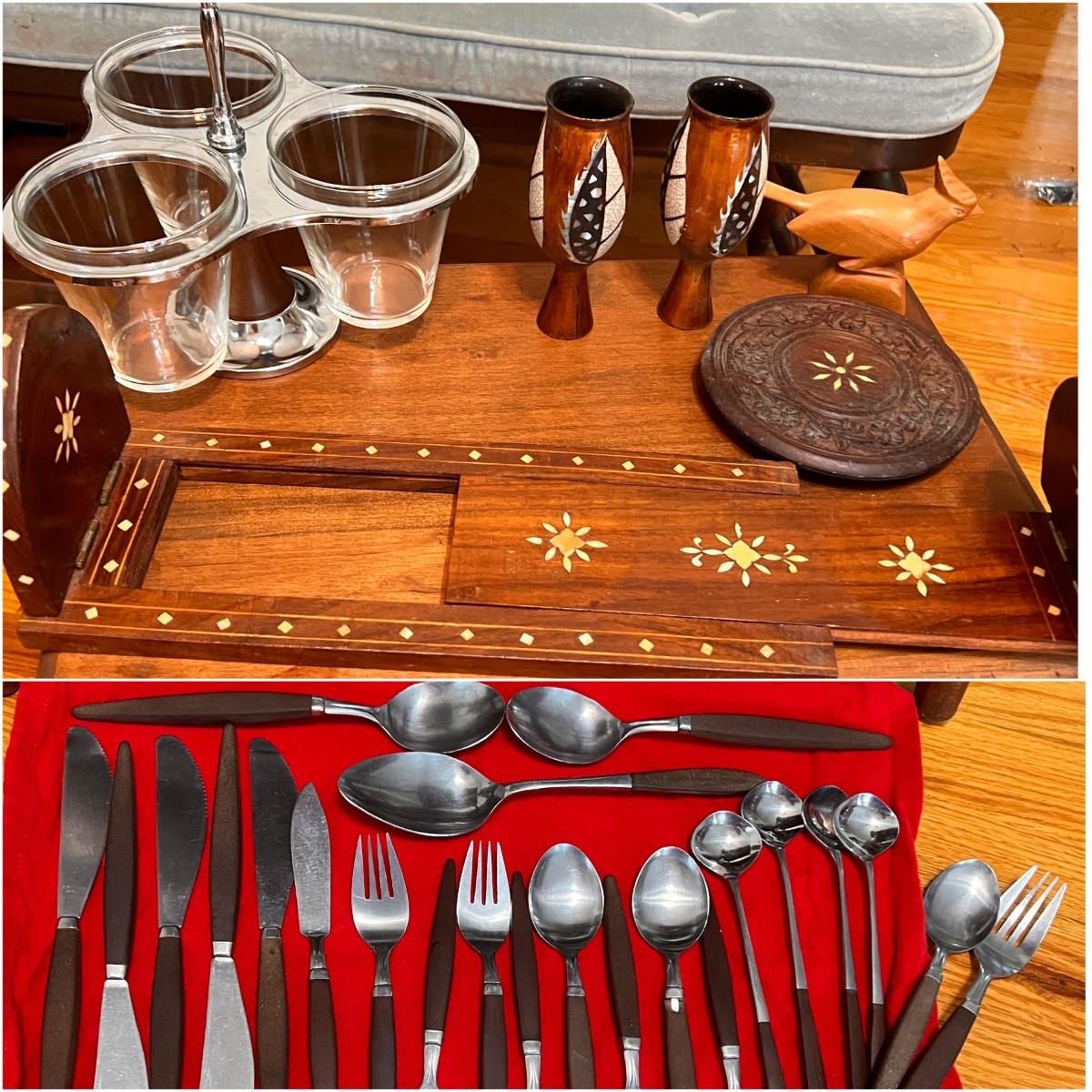 Teak and glass condiment server, decorative teak trivet, inlaid sliding book shelf, mixed lot of teak handled utensils including Epic stainless steel utensils with Danish style wood handles. Vanity bench or table. And more.