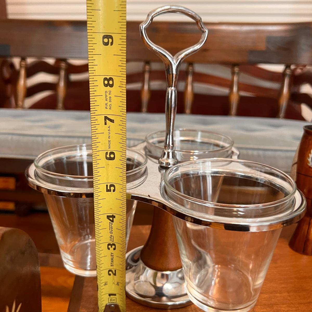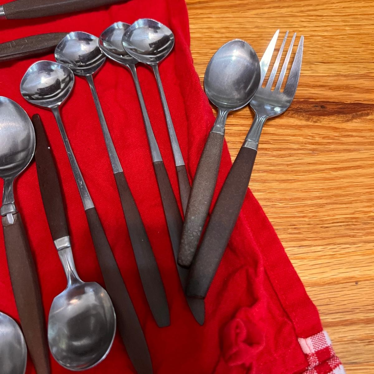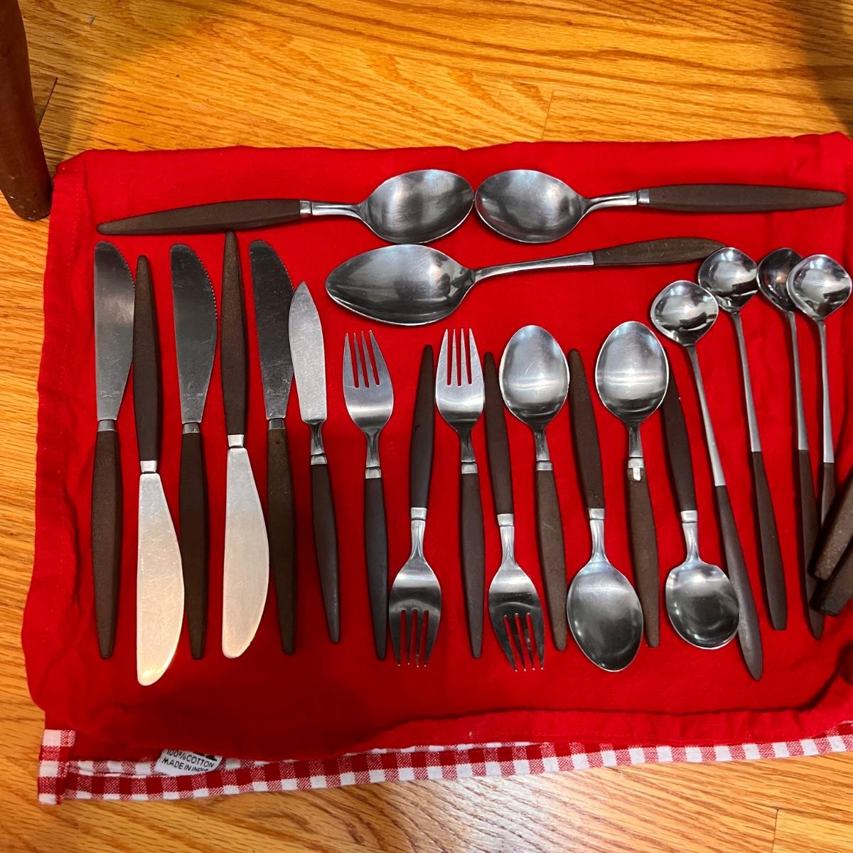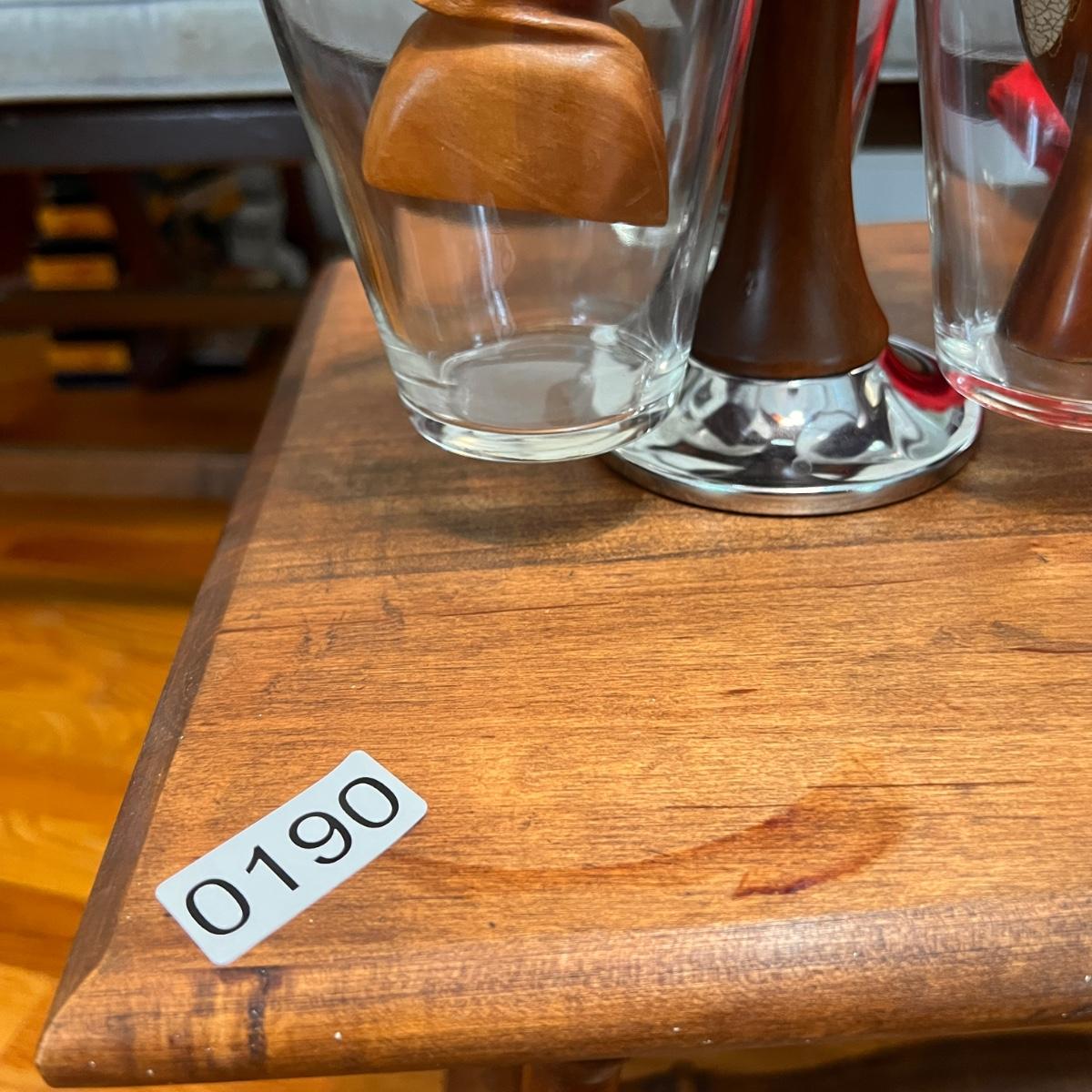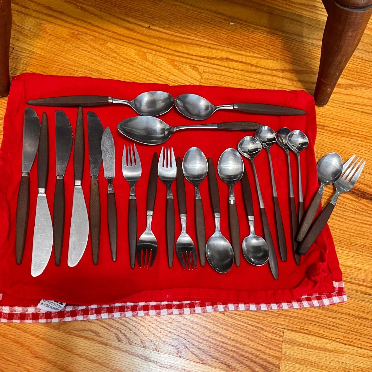 Teak and glass condiment server, decorative teak trivet, inlaid sliding book shelf, mixed lot of teak handled utensils including Epic stainless steel utensils with Danish style wood handles. Vanity bench or table. And more.