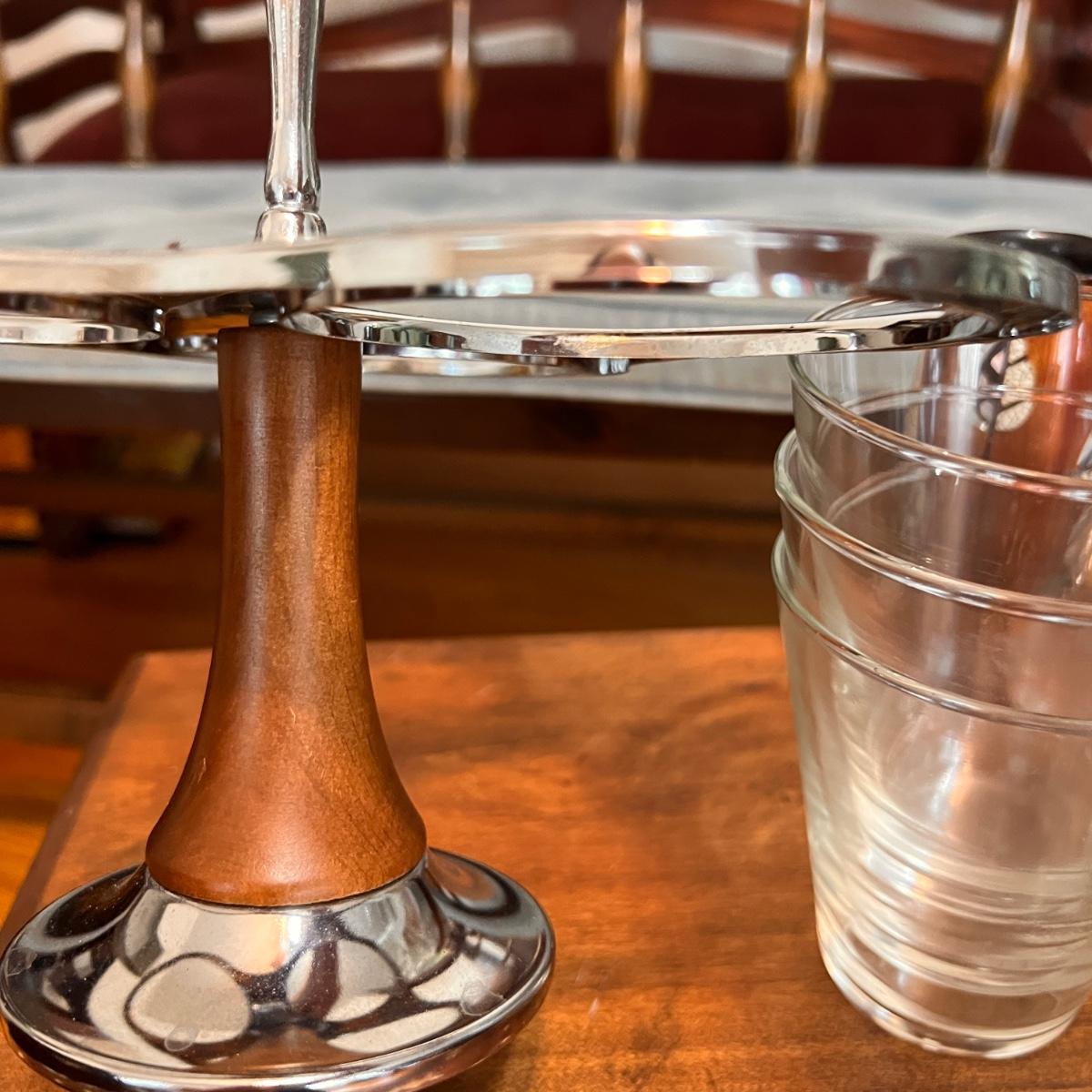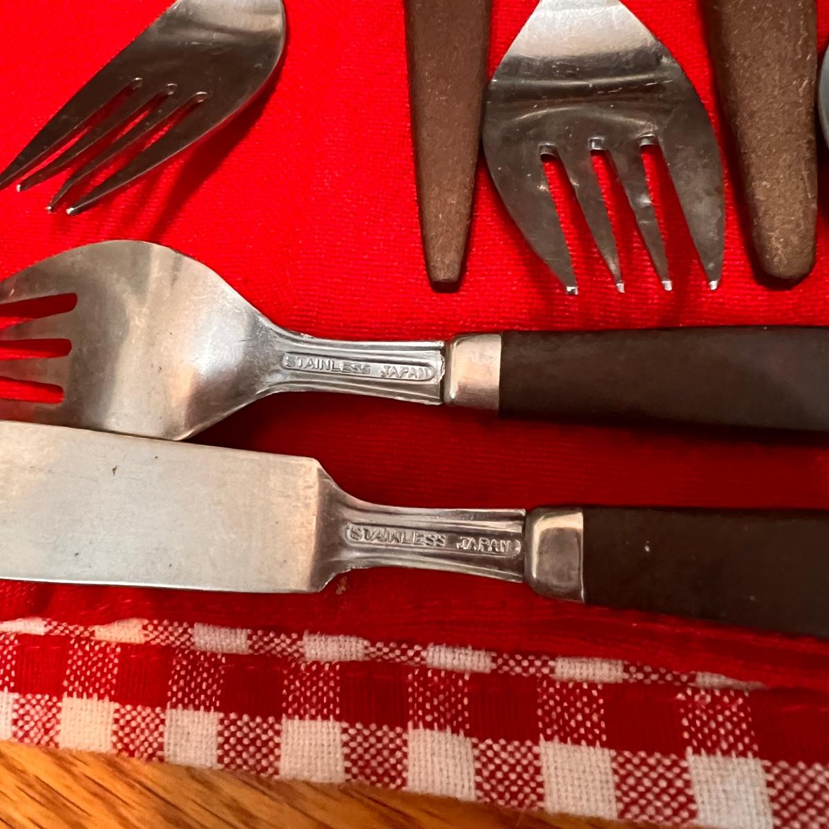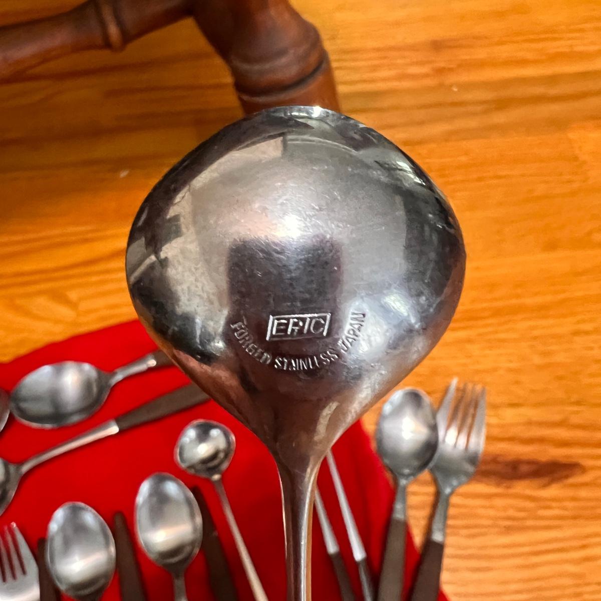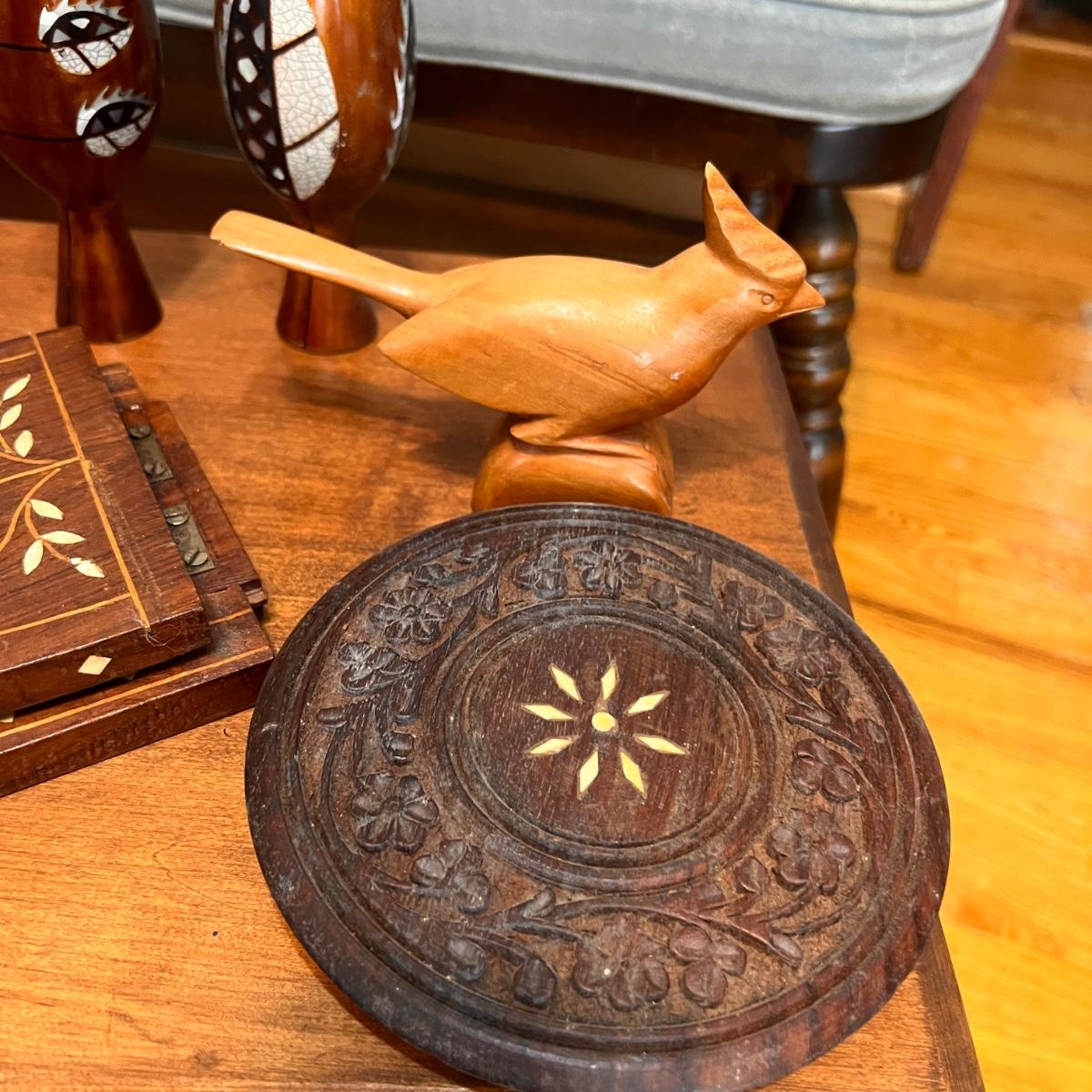 Teak and glass condiment server, decorative teak trivet, inlaid sliding book shelf, mixed lot of teak handled utensils including Epic stainless steel utensils with Danish style wood handles. Vanity bench or table. And more.