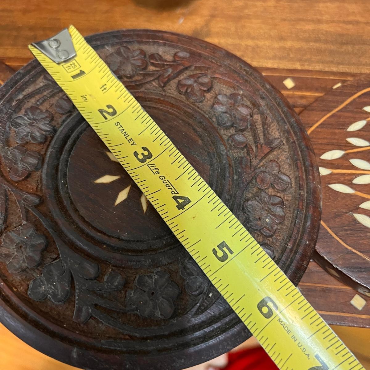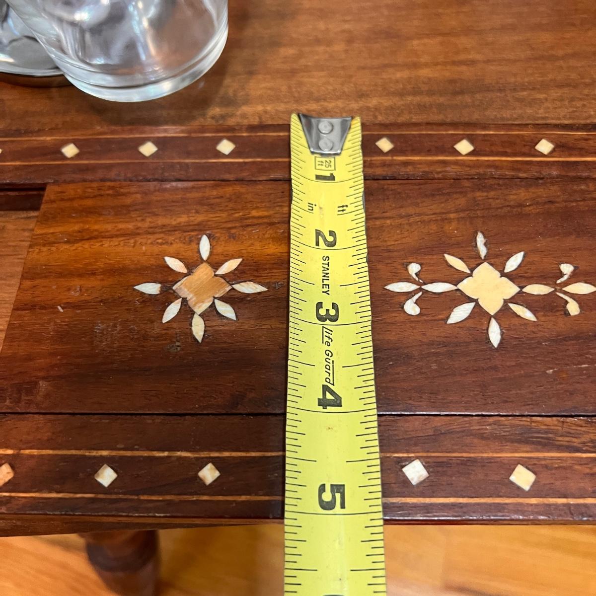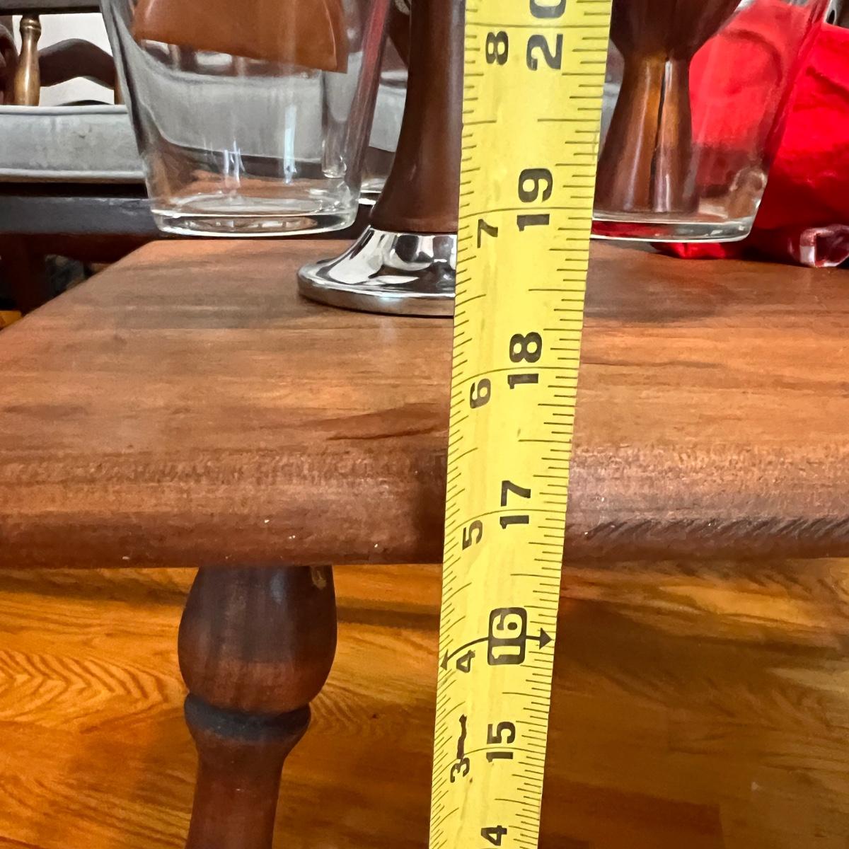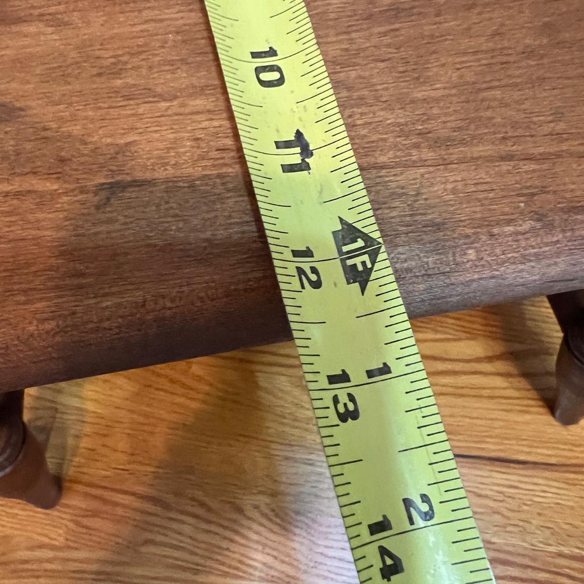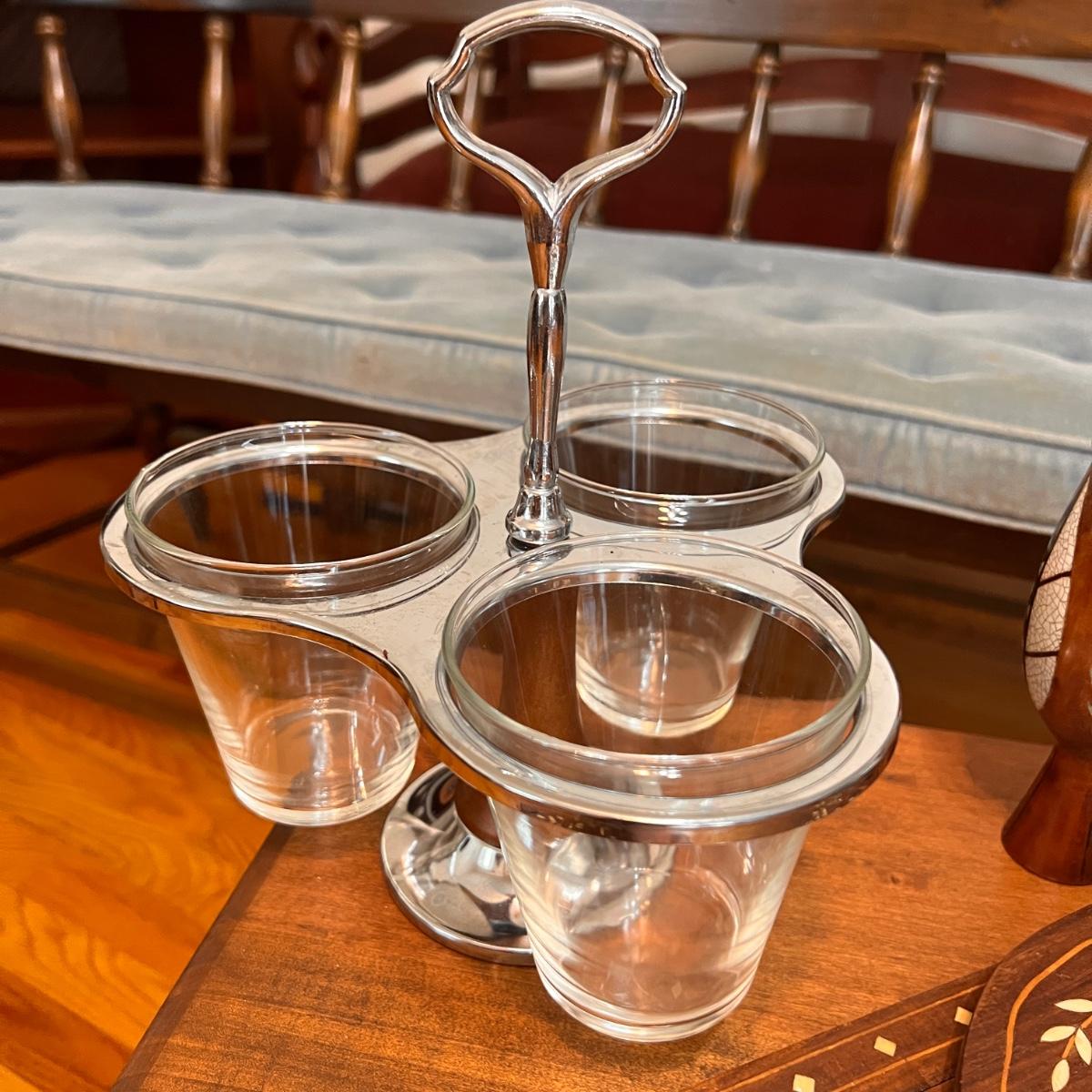 Teak and glass condiment server, decorative teak trivet, inlaid sliding book shelf, mixed lot of teak handled utensils including Epic stainless steel utensils with Danish style wood handles. Vanity bench or table. And more.