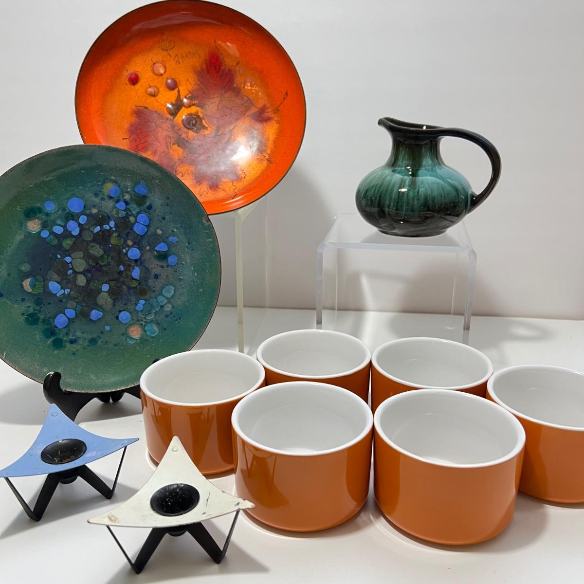 MCM Lot - Signed Enamel, Dansk Cups, Ceramic, Metal Candle Holders