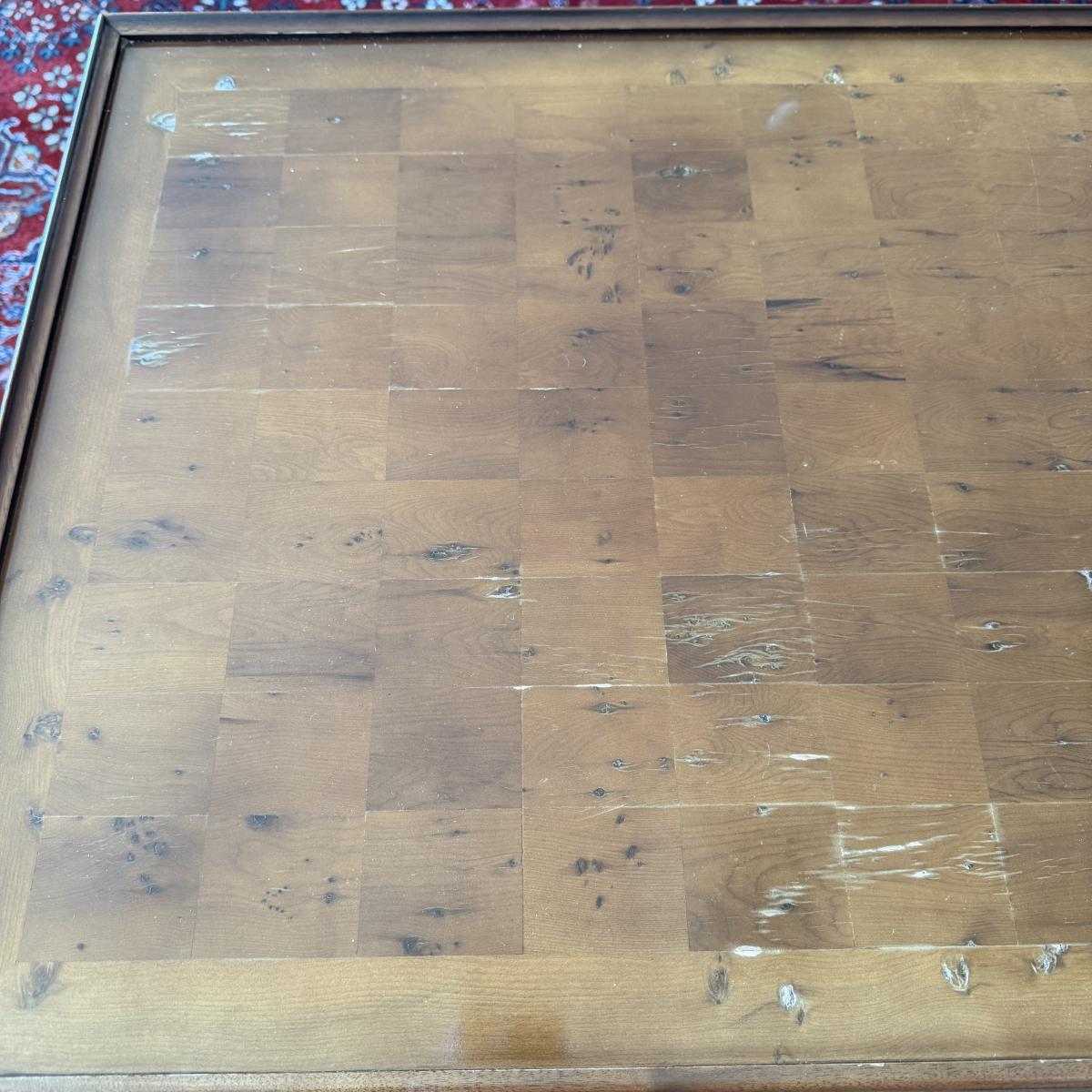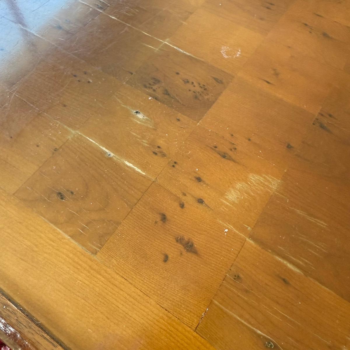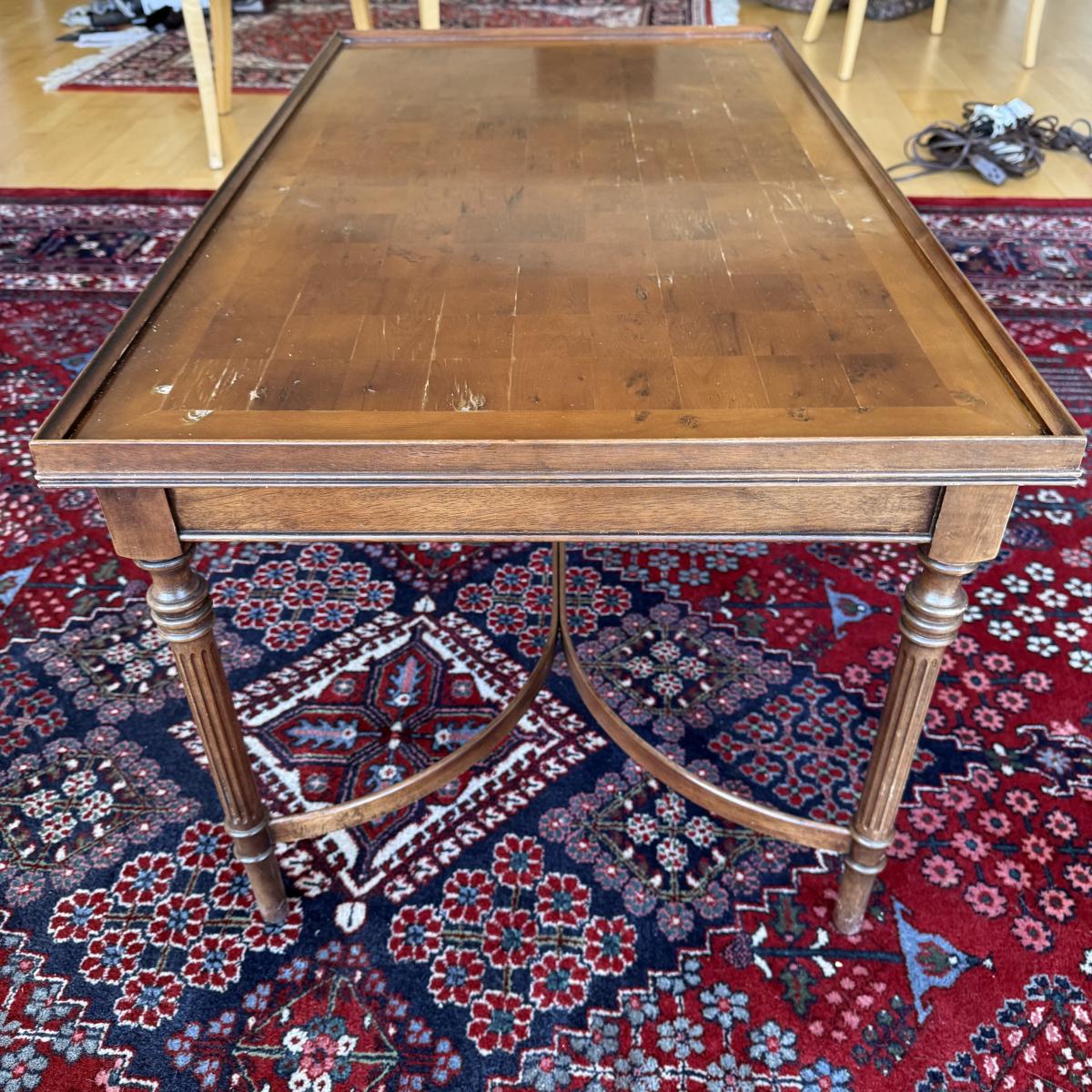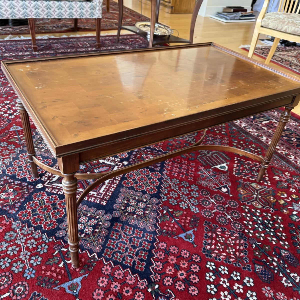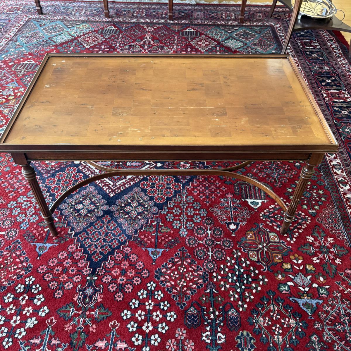 This lot contains an MCM-style wooden coffee table. This table measures 37.5” x 21.5” x 19.5”H. There is a bit of wear on the table's surface and some scratches on the legs. See pictures for details. Local pick up only.