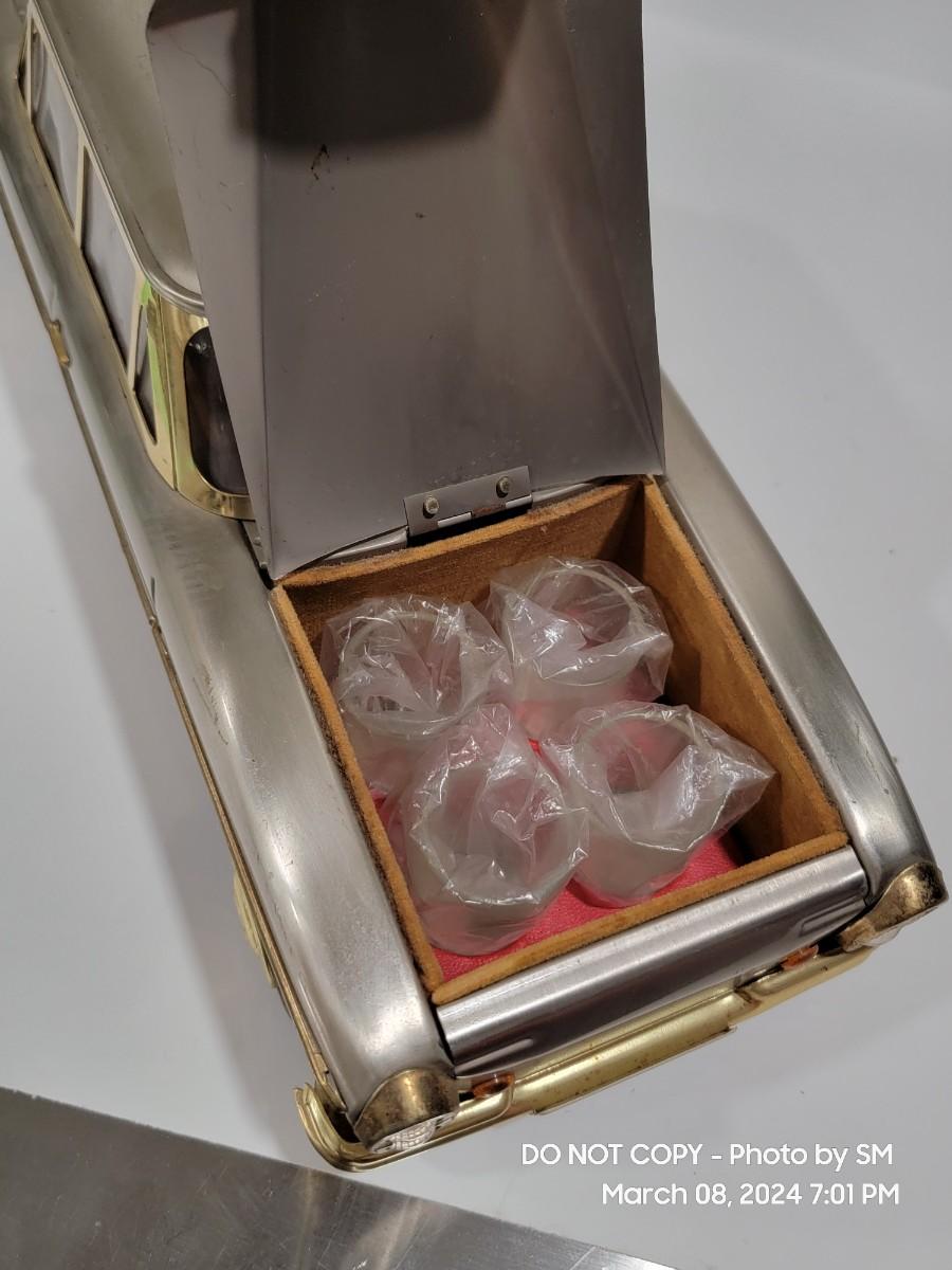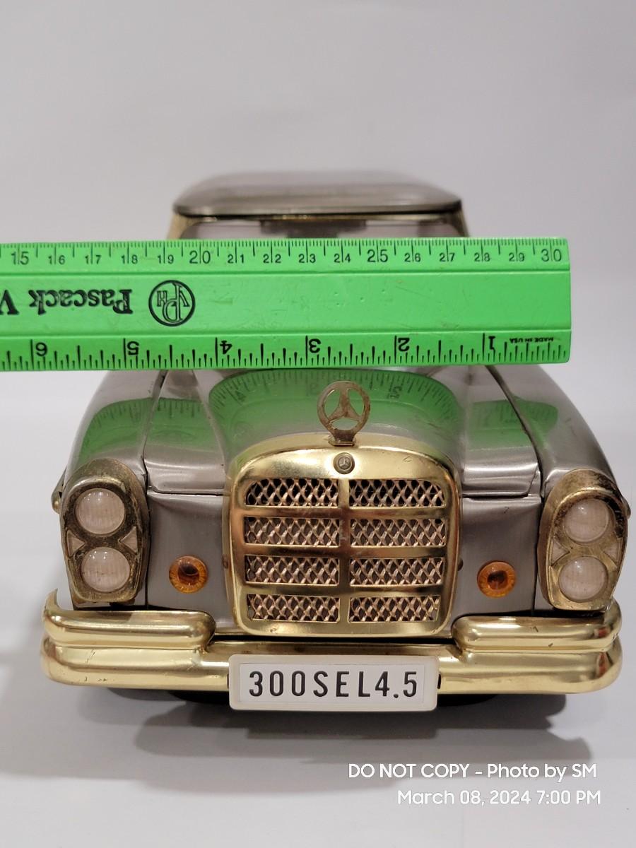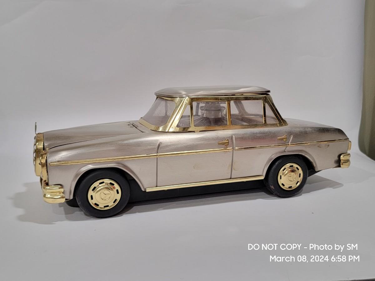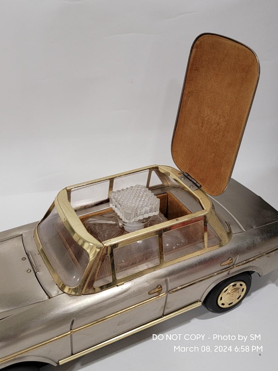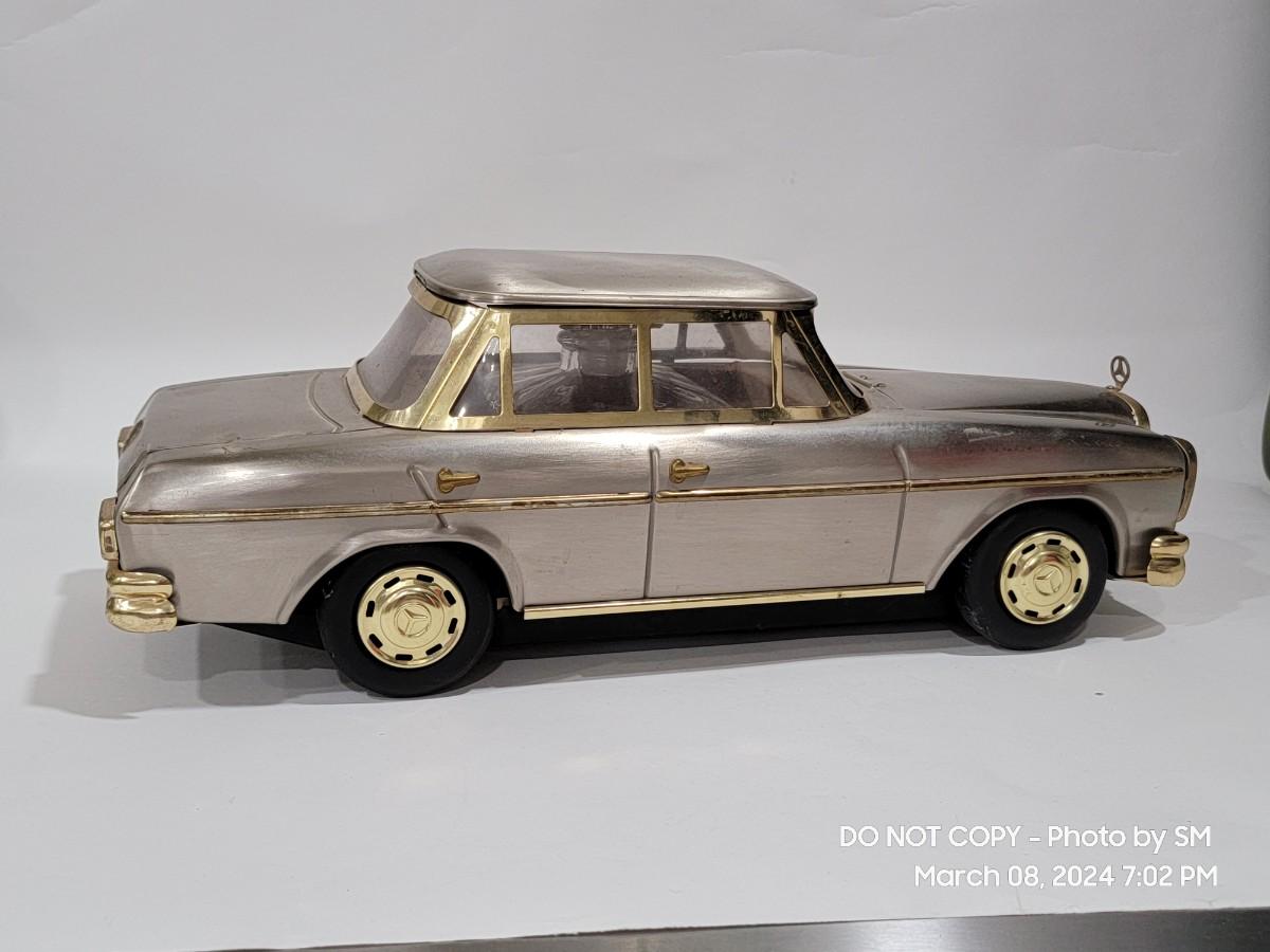Calling all oddity and Mercedes Lovers. This vinatge piece is from the 60s / 70s Mid Century/ Retro era and is a must have for the coolest bar display yet. Music box plays "if I were a rich man", the steering wheel is the wind up, and when you remove the Decanter it playes. Comes with 4 never used shot glasses. Has some scuffs, marks but for its age it is fantastic. The windows have a tiny haze but they are plastic not glass. Silver metal car body with gold accent. Front plate has - 300SEL 4.5, I assume model of the car? Not a common treasure to find. Get it now.