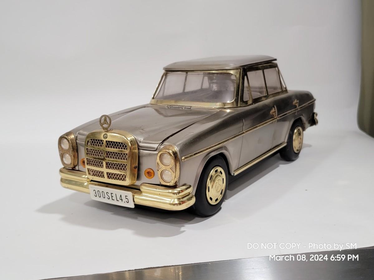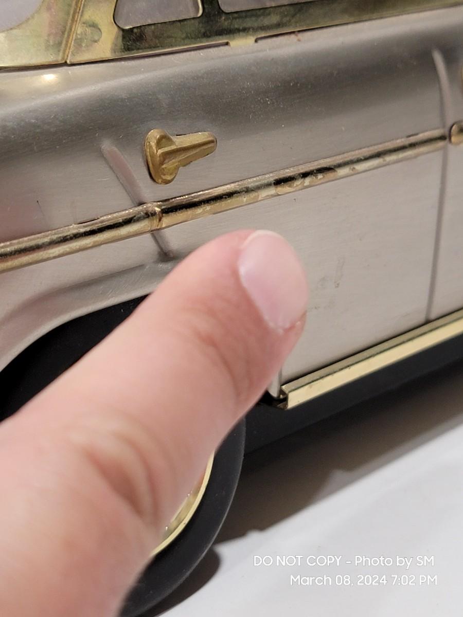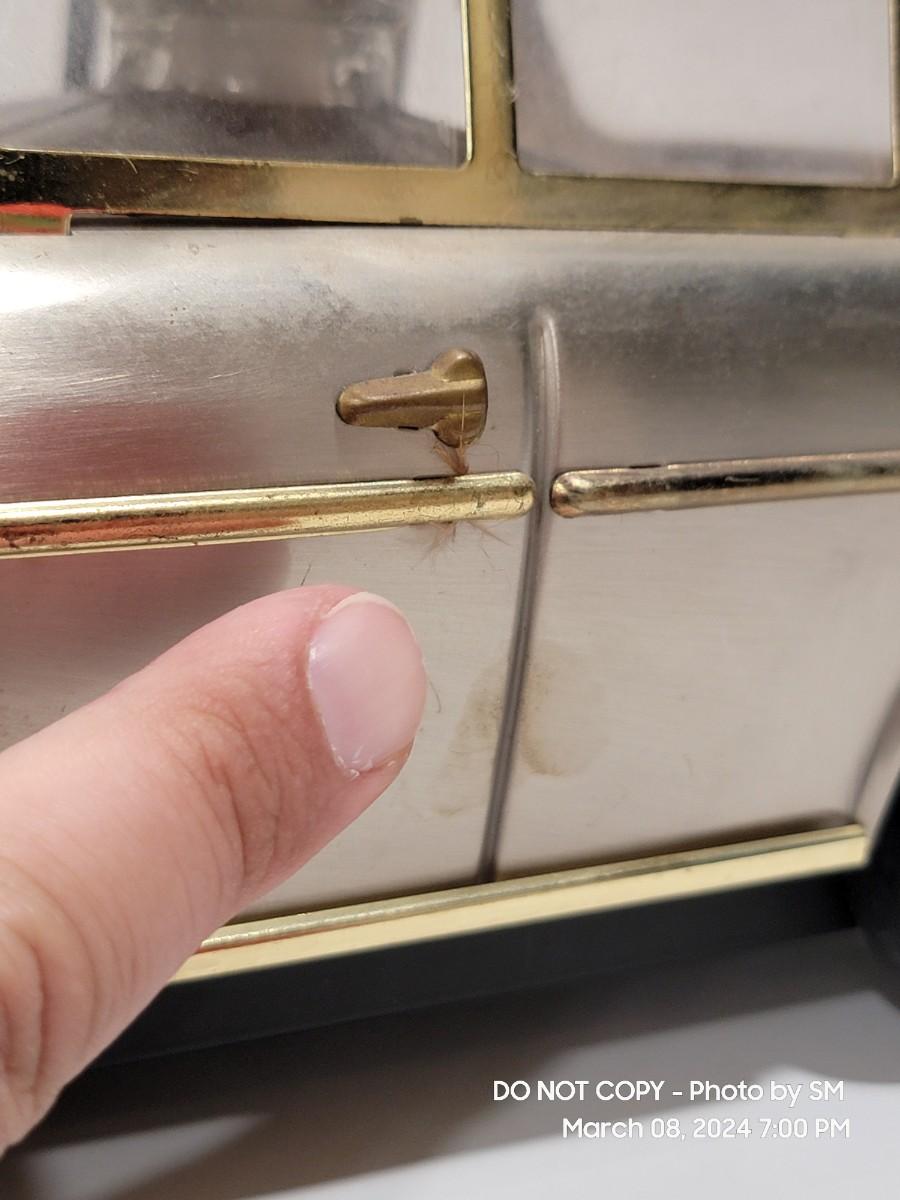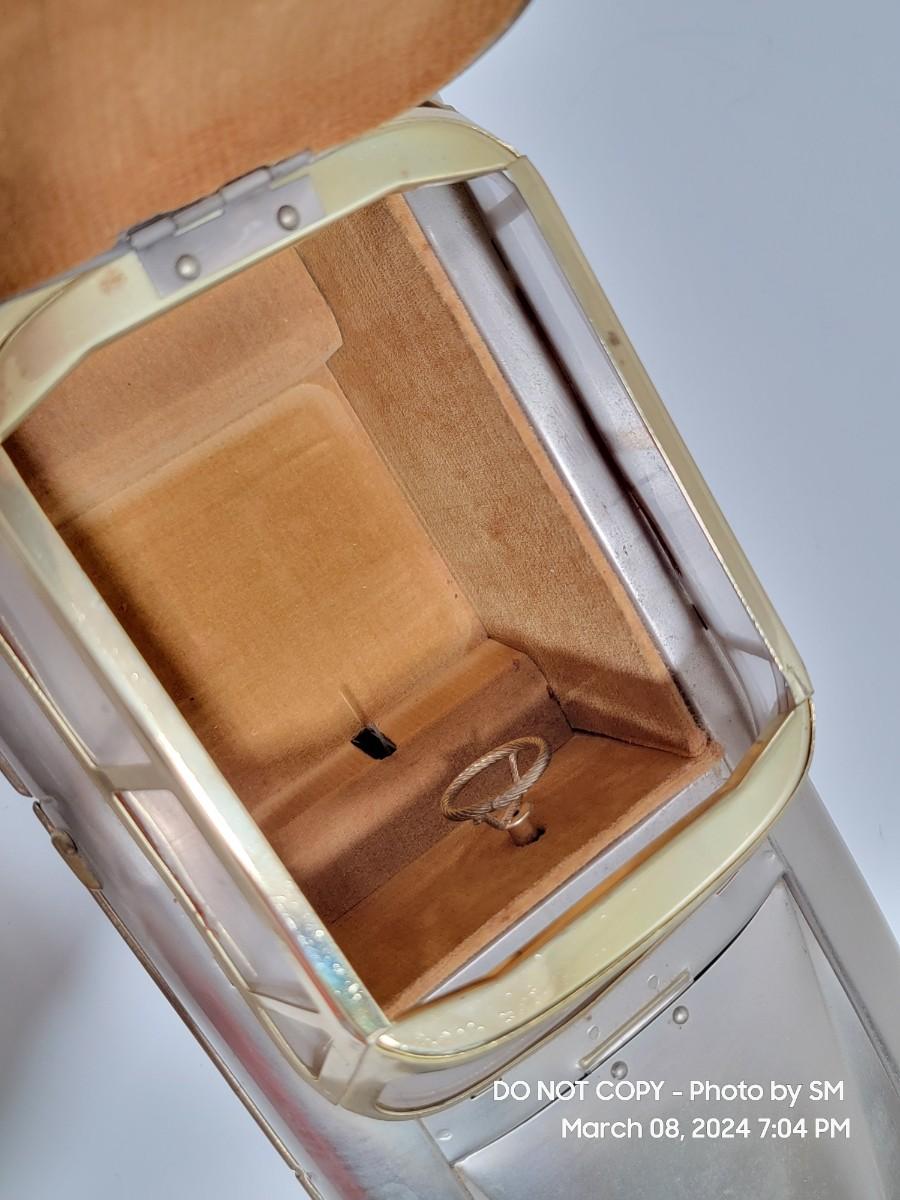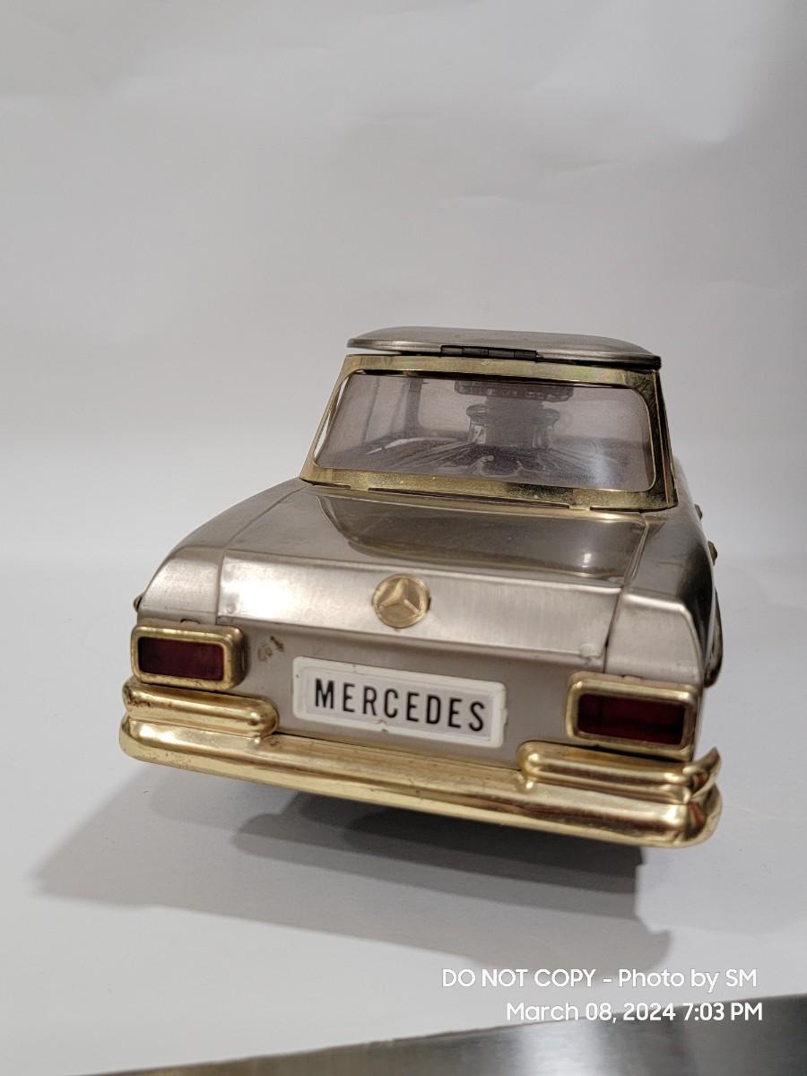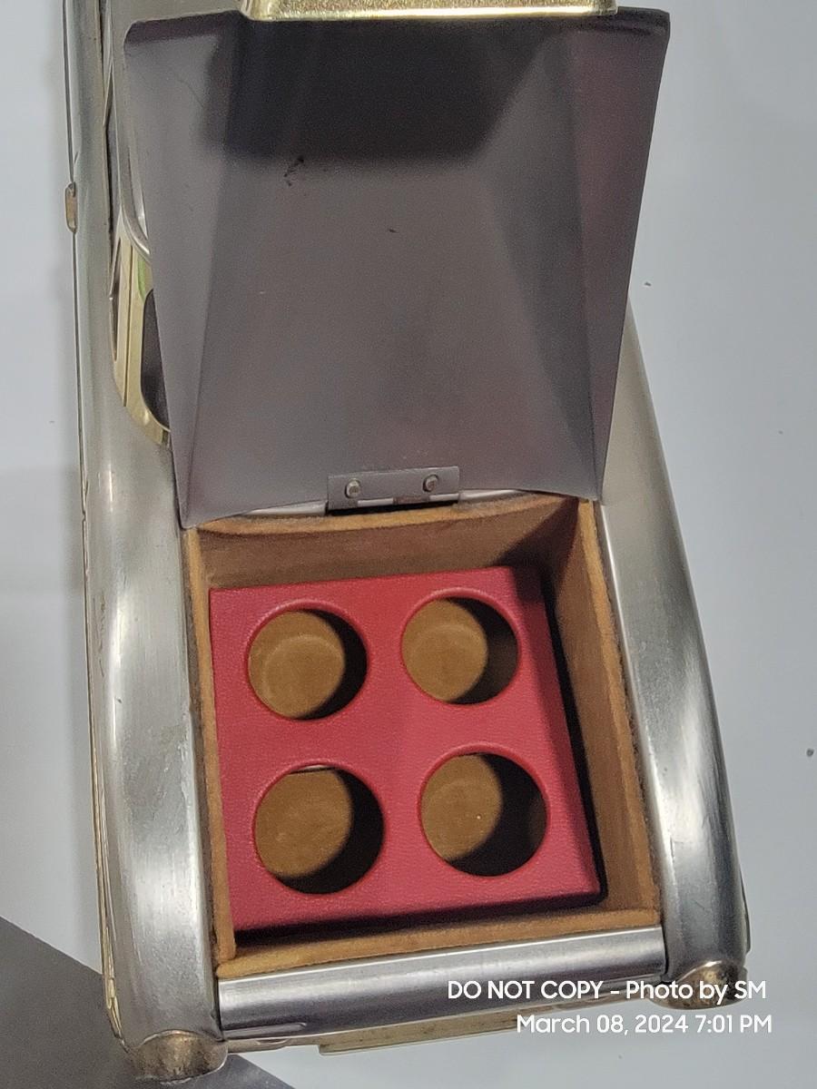 Calling all oddity and Mercedes Lovers. This vinatge piece is from the 60s / 70s Mid Century/ Retro era and is a must have for the coolest bar display yet. Music box plays "if I were a rich man", the steering wheel is the wind up, and when you remove the Decanter it playes. Comes with 4 never used shot glasses. Has some scuffs, marks but for its age it is fantastic. The windows have a tiny haze but they are plastic not glass. Silver metal car body with gold accent. Front plate has - 300SEL 4.5, I assume model of the car? Not a common treasure to find. Get it now.